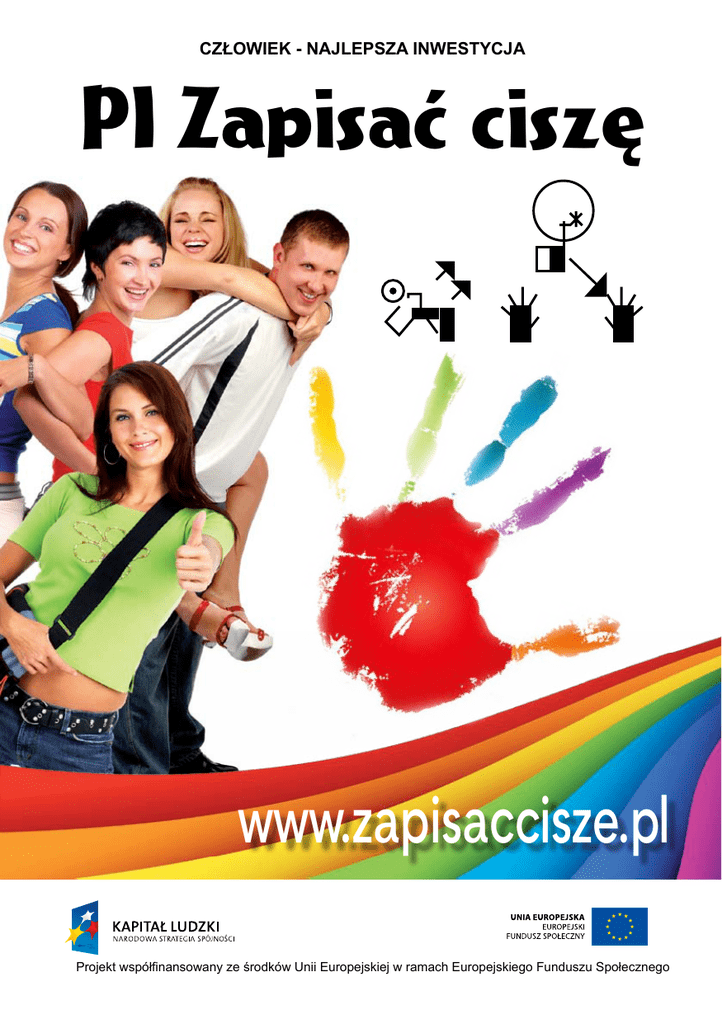 człowiek - najlepsza inwestycja PI Zapisać ciszę www.zapisaccisze.pl Projekt współfinansowany ze środków Unii Europejskiej w ramach Europejskiego Funduszu Społecznego Centrum Zespołów Analityczno Strategicznych Sp. z o.o. w partnerstwie z Polskim Związkiem Głuchych Tak migamy SignWriting: na terenie województwa mazowieckiego realizuje innowacyjny projekt „Zapisać ciszę”. Istniejące sposoby zapisu języka migowego (np. gestografia, ryciny) są skomplikowane, co utrudnia uczącym się języka migowego możliwość zapisywania, notowania, samodzielnej pracy domowej (bez nauczyciela). Konsekwencją tego jest ograniczona efektywność nauczania. W ramach projektu opracowany zostanie innowacyjny program nauczania języka migowego dla głuchej młodzieży ze szkół ponadgimnazjalnych wykorzystujący zapis SignWriting. Kolejnym etapem projektu jest testowanie, czy innowacja działa, następnie jej upowszechnienie i działania włączające. W SignWritingu możemy zapisać każdy język migowy, dzięki kontekstowości jest łatwy do przyswojenia dla każdego. Znaki języka migowego (gesty) są zapisywane jako kombinacja ikonicznych symboli dla układu rąk, położenia ciała, wyrazu twarzy, kontaktu między dłońmi i innymi częściami ciała oraz ruchów. SignWriting jest piktograficzny, będąc jednocześnie symbolem i przybliżonym obrazem symbolizowanego pojęcia. Zagraniczna praktyka (Niemcy, Belgia, USA, Brazylia) pokazuje, że wprowadzenie SignWritingu do nauki języka migowego powoduje większą efektywność i skuteczność nauczania niesłyszących uczniów. Wnioskodawcy oczekują, że opracowany program wspomagał będzie proces nauczania, dzięki czemu zmniejszy się obszar wykluczenia społecznego osób niesłyszących i poprawi się ich pozycja zawodowa oraz zdolności komunikacyjne w szkole, miejscu pracy i domu. Możliwość zapisywania swojego naturalnego języka w SignWriting jest silnym elementem budującym kulturę i tożsamość mniejszości językowej, jaką są Głusi. A tak go zapisujemy: PI Zapisać ciszę Kontakt: Biuro projektu „PI Zapisać ciszę” ul. Białostocka 4, 03-741 Warszawa tel. 725-457-679 Lider projektu: Centrum Zespołów Analityczno Strategicznych Sp. z o.o. ul. Myśliwska 4c/8, 33-300 Nowy Sącz tel. 18/547-62-42, fax 18/547-67-09 [email protected], www.czas.sacz.pl Partner: Polski Związek Głuchych Oddział Małopolski w Krakowie ul. Św. Jana 18, 31-018 Kraków tel. 12/422-73-45, fax 12/421-39-10 [email protected], www.pzg.krakow.pl www.zapisaccisze.pl