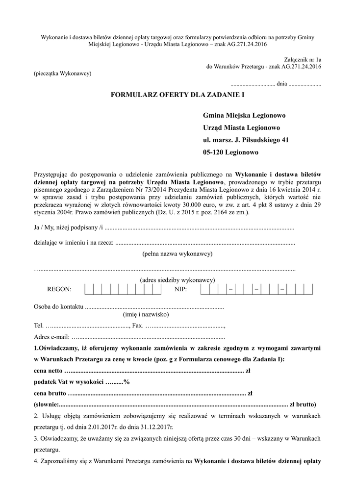 Wykonanie i dostawa biletów dziennej opłaty targowej oraz formularzy potwierdzenia odbioru na potrzeby Gminy Miejskiej Legionowo - Urzędu Miasta Legionowo – znak AG.271.24.2016 Załącznik nr 1a do Warunków Przetargu - znak AG.271.24.2016 (pieczątka Wykonawcy) .............................. dnia ...................... FORMULARZ OFERTY DLA ZADANIE I Gmina Miejska Legionowo Urząd Miasta Legionowo ul. marsz. J. Piłsudskiego 41 05-120 Legionowo Przystępując do postępowania o udzielenie zamówienia publicznego na Wykonanie i dostawa biletów dziennej opłaty targowej na potrzeby Urzędu Miasta Legionowo, prowadzonego w trybie przetargu pisemnego zgodnego z Zarządzeniem Nr 73/2014 Prezydenta Miasta Legionowo z dnia 16 kwietnia 2014 r. w sprawie zasad i trybu postępowania przy udzielaniu zamówień publicznych, których wartość nie przekracza wyrażonej w złotych równowartości kwoty 30.000 euro, w zw. z art. 4 pkt 8 ustawy z dnia 29 stycznia 2004r. Prawo zamówień publicznych (Dz. U. z 2015 r. poz. 2164 ze zm.). Ja / My, niżej podpisany /i .................................................................................................................... działając w imieniu i na rzecz: .............................................................................................................. (pełna nazwa wykonawcy) …............................................................................................................................................................ REGON: (adres siedziby wykonawcy) NIP: – – – Osoba do kontaktu ..................................................................................... (imię i nazwisko) Tel. …..............................................., Fax. …............................................, Adres e-mail: ….......................................................................................... 1.Oświadczamy, iż oferujemy wykonanie zamówienia w zakresie zgodnym z wymogami zawartymi w Warunkach Przetargu za cenę w kwocie (poz. g z Formularza cenowego dla Zadania I): cena netto ….......................................................................................................... zł podatek Vat w wysokości ….......% cena brutto …......................................................................................................... zł (słownie:............................................................................................................................................ zł brutto) 2. Usługę objętą zamówieniem zobowiązujemy się realizować w terminach wskazanych w warunkach przetargu tj. od dnia 2.01.2017r. do dnia 31.12.2017r. 3. Oświadczamy, że uważamy się za związanych niniejszą ofertą przez czas 30 dni – wskazany w Warunkach przetargu. 4. Zapoznaliśmy się z Warunkami Przetargu zamówienia na Wykonanie i dostawa biletów dziennej opłaty Wykonanie i dostawa biletów dziennej opłaty targowej oraz formularzy potwierdzenia odbioru na potrzeby Gminy Miejskiej Legionowo - Urzędu Miasta Legionowo – znak AG.271.24.2016 targowej na potrzeby Urzędu Miasta Legionowo i nie wnosimy do nich zastrzeżeń oraz przyjmujemy warunki w nich zawarte. 5. Pozyskaliśmy wszystkie informacje pozwalające na sporządzenie oferty oraz wykonanie w/w zamówienia. 6. Zawarte postanowienia we wzorze umowy zostały przez nas zaakceptowane i zobowiązujemy się w przypadku przyznania nam zamówienia do zawarcia umowy w miejscu i terminie wyznaczonym przez Zamawiającego. 7. Posiadajmy niezbędną wiedzę i doświadczenie oraz dysponujemy potencjałem technicznym i osobami zdolnymi do wykonania zamówienia lub przedstawią pisemne zobowiązanie innych podmiotów do udostępnienia potencjału technicznego i osób zdolnych do wykonania zamówienia, 8. Posiadamy uprawnienia do wykonywania określonej działalności lub czynności, jeżeli ustawy nakładają obowiązek posiadania takich uprawnień, 9. Znajdujemy się w sytuacji ekonomicznej i finansowej zapewniającej wykonanie zamówienia, 10. Oferta została złożona na .................. stronie(ach) podpisanych i kolejno ponumerowanych od nr ......... do nr ........... . 11. Niniejszym informujemy, iż informacje składające się na ofertę, zawarte w punktach ........................., stanowią tajemnicę przedsiębiorstwa w rozumieniu ustawy o zwalczaniu nieuczciwej konkurencji i jako takie nie mogą być udostępnione innym uczestnikom niniejszego postępowania. 12. Świadom odpowiedzialności karnej oświadczam, że załączone do oferty dokumenty opisują stan prawny i faktyczny, aktualny na dzień złożenia oferty (art. 297 k. k.). ...................................................... /Miejscowość, data i podpis wykonawcy lub osoby upoważnionej/ 2