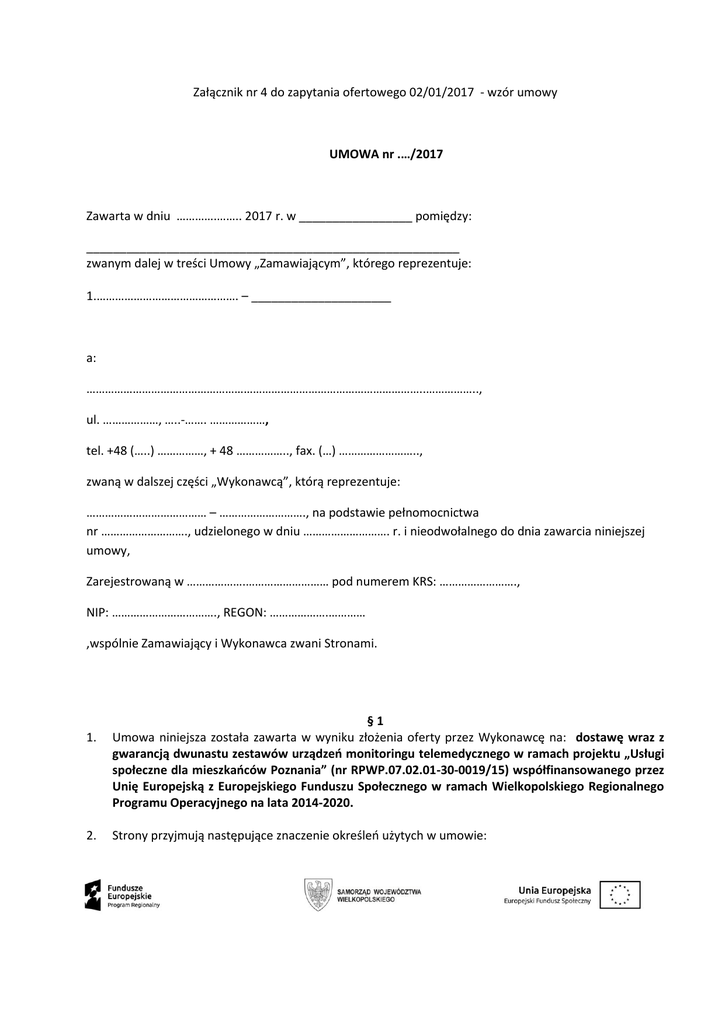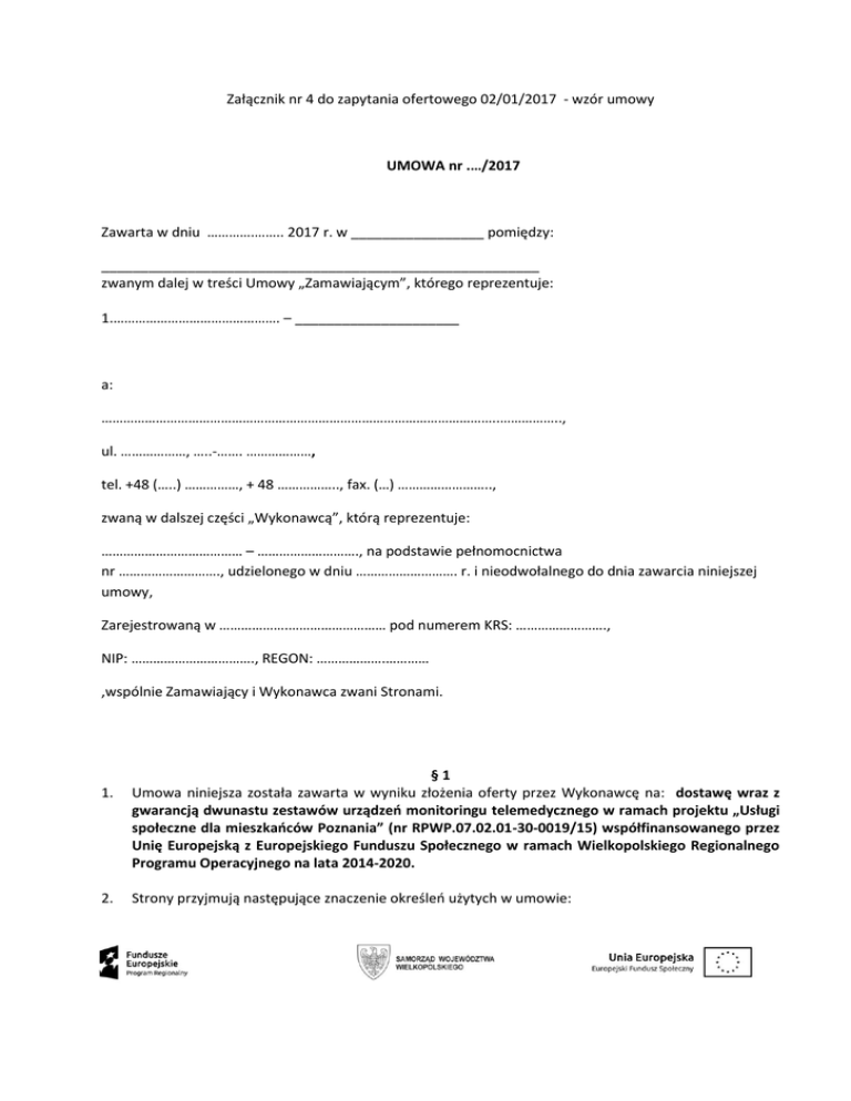 Załącznik nr 4 do zapytania ofertowego 02/01/2017 - wzór umowy UMOWA nr .…/2017 Zawarta w dniu ………….…….. 2017 r. w _________________ pomiędzy: ________________________________________________________ zwanym dalej w treści Umowy „Zamawiającym”, którego reprezentuje: 1.………………………………………. – _____________________ a: ………………………………………………………………………………………………..…………….., ul. ………………, …..-……. ………………, tel. +48 (…..) ……………, + 48 …………….., fax. (…) …………………….., zwaną w dalszej części „Wykonawcą”, którą reprezentuje: ………………………………… – ………………………., na podstawie pełnomocnictwa nr ………………………., udzielonego w dniu ………………………. r. i nieodwołalnego do dnia zawarcia niniejszej umowy, Zarejestrowaną w ……………….……………………… pod numerem KRS: ……………………., NIP: ……………………………., REGON: ……………….………… ,wspólnie Zamawiający i Wykonawca zwani Stronami. 1. 2. §1 Umowa niniejsza została zawarta w wyniku złożenia oferty przez Wykonawcę na: dostawę wraz z gwarancją dwunastu zestawów urządzeń monitoringu telemedycznego w ramach projektu „Usługi społeczne dla mieszkańców Poznania” (nr RPWP.07.02.01-30-0019/15) współfinansowanego przez Unię Europejską z Europejskiego Funduszu Społecznego w ramach Wielkopolskiego Regionalnego Programu Operacyjnego na lata 2014-2020. Strony przyjmują następujące znaczenie określeń użytych w umowie: a) dostarczenie sprzętu - transport, ubezpieczenie na czas transportu, rozładunek, wniesienie sprzętu do pomieszczenia/pomieszczeń wskazanego/-ych przez przedstawiciela/-li Zamawiającego – na koszt i ryzyko Wykonawcy; b) dni robocze - dni od pon. do pt. z wyłączeniem dni ustawowo wolnych od pracy; c) dni – dni kalendarzowe d) odbiór ilościowy – stwierdzenie zgodności ilościowej, w tym ilości elementów kompletu, dostarczonego sprzętu, z postanowieniami umowy; e) odbiór jakościowy – stwierdzenie zgodności jakościowej, w tym jakości elementów kompletu, dostarczonego sprzętu z postanowieniami umowy, z uwzględnieniem odpowiedniej konfiguracji i wyposażenia sprzętu. §2 1. Przedmiotem umowy jest dostawa fabrycznie nowych i nieużywanych oraz sprawnych technicznie urządzeń tj.: dostawa wraz z gwarancją 12 zestawów urządzeń monitoringu telemedycznego zwanych dalej wspólnie sprzętem, na rzecz Zamawiającego oraz zapewnienie usług gwarancyjnych sprzętu. 2. Szczegółowy opis sprzętu, którego dostawa jest przedmiotem umowy określony został w zapytaniu ofertowym złożonym przez Zamawiającego. 3. Wykonawca zobowiązuje się, że dostarczony sprzęt będzie spełniał wszystkie wymagania wskazane w zapytaniu ofertowym. 1. 2. 3. 4. 5. 6. 7. 8. §3 Wykonawca zobowiązuje się dostarczyć sprzęt w ramach jednej dostawy pod adres Stowarzyszenie Wzajemnej Pomocy „Flandria”, Zintegrowane Centrum Opieki, ul. Św. Marcin 58/64, 61-807 Poznań – w terminie maksymalnie 7 dni od dnia przyjęcia zamówienia do realizacji. Wykonawca ponosi odpowiedzialność za wszelkie szkody, w tym przypadkową utratę lub uszkodzenie sprzętu do czasu jego wydania Zamawiającemu. Sprzęt zostanie dostarczony Zamawiającemu w nienaruszonych opakowaniach jednostkowych zabezpieczających przed uszkodzeniem w czasie transportu. Wraz ze sprzętem dostarczone zostaną instrukcje obsługi w języku polskim oraz dokumenty gwarancyjne. Dostawa zostanie zrealizowana w dniach pracy Zamawiającego, w godzinach od 8:00 do 15:00. Wykonawca zgłosi Zamawiającemu gotowość dostarczenia przedmiotu dostawy, na 24 godziny przed datą dostarczenia przedmiotu dostawy, poprzez kontakt telefoniczny, za pomocą faksu lub poczty elektronicznej. Wraz z dostawą Wykonawca dostarcza do Zamawiającego protokół odbioru ilościowo-jakościowego dostawy częściowej według wzoru stanowiącego załącznik nr 1a do umowy, uzupełniony o informacje i podpisy ze strony Wykonawcy. W dniu dostawy przez upoważnionego przedstawiciela Wykonawcy Zamawiający dokonuje odbioru ilościowego sprzętu (pkt.7 wzoru protokołu odbioru). Zgłoszenia dot. zastrzeżeń ilościowych lub informacje o zatwierdzeniu protokołu odbioru ilościowego (np. skan protokołu) Zamawiający przekazuje Wykonawcy na adres mailowy Wykonawcy: ……………………………………………W razie zgłoszenia zastrzeżeń w protokole odbioru ilościowego, Zamawiający może wyznaczyć Wykonawcy stosowny termin, nie dłuższy niż 2 dni robocze, w celu usunięcia stwierdzonych protokołem nieprawidłowości w dostarczonym przedmiocie dostawy. Wykonawca zobowiązuje się usunąć nieprawidłowości w wyznaczonym przez Zamawiającego terminie, bez dodatkowego wynagrodzenia z tego tytułu. 9. W terminie do 2 dni roboczych od dnia dostawy sprzętu Zamawiający dokona odbioru jakościowego sprzętu (pkt.8 wzoru protokołu odbioru) 10. Zgłoszenia dot. zastrzeżeń jakościowych lub informacje o zatwierdzeniu protokołu odbioru jakościowego (np. skan protokołu) Zamawiający przekazuje Wykonawcy na adres mailowy Wykonawcy: …………………………………W razie zgłoszenia zastrzeżeń w protokole odbioru jakościowego, Zamawiający może pisemnie wyznaczyć Wykonawcy stosowny termin, nie krótszy niż 3 dni robocze, w celu usunięcia stwierdzonych protokołem nieprawidłowości w dostarczonym przedmiocie dostawy. Wykonawca zobowiązuje się usunąć nieprawidłowości w wyznaczonym przez Zamawiającego terminie, bez dodatkowego wynagrodzenia z tego tytułu. 11. Niezwłocznie po zatwierdzeniu protokołu ilościowo-jakościowego przez Zamawiającego, Zamawiający przekazuje protokół na wskazany adres Wykonawcy: …………………………………..e-