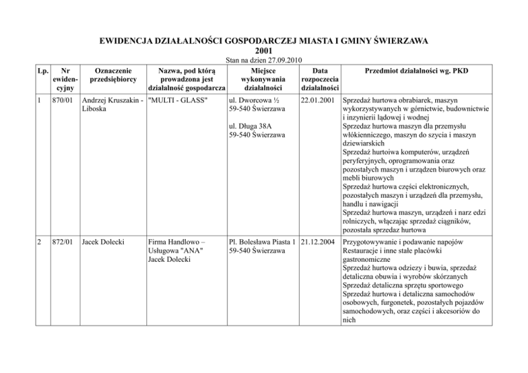 ewidencja działalności gospodarczej miasta i gminy świerzawa 2001