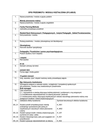 OPIS PRZEDMIOTU / MODUŁU KSZTAŁCENIA (SYLABUS) 1. Nazwa przedmiotu / modułu w języku polskim 2. Metody planowania rodziny Nazwa przedmiotu / modułu w języku angielskim 3. Family Planning Methods Jednostka prowadząca przedmiot 4. Wydział Nauk Historycznych i Pedagogicznych, Instytut Pedagogiki, Zakład Poradoznawstwa Kod przedmiotu / modułu 5. Rodzaj przedmiotu / modułu (obowiązkowy lub fakultatywny) 6. Obowiązkowy Kierunek studiów/ specjalizacja 7. Pedagogika / Poradnictwo i pomoc psychopedagogiczna Poziom studiów (I lub II stopień) 8. I stopień Rok studiów 9. III rok Semestr (zimowy lub letni) 10. semestr letni Forma zajęć i liczba godzin 11. 15 godzin ćwiczeń Imię, nazwisko, tytuł / stopień naukowy osoby prowadzącej zajęcia 12. 13. 14. Mgr Aleksandra Aszkiełowicz Wymagania wstępne w zakresie wiedzy, umiejętności i kompetencji społecznych dla przedmiotu / modułu oraz zrealizowanych przedmiotów Brak wymagań Cele przedmiotu: C-1 wyposażenie w wiedzę dotyczącą ludzkiej płodności i problemami z nią związanymi C-2 kształtowanie odpowiedzialności za własną płciowość i płodność C-3 dostarczenie wiedzy dotyczącej współczesnych metoda naturalnego planowania rodziny oraz dostępnych środków i metod antykoncepcyjnych Zakładane efekty kształcenia: Symbole kierunkowych efektów kształcenia: EK_01 Student potrafi scharakteryzować metodę podwójnego sprawdzenia jako jedną ze współczesnych naturalnych metod planowania rodziny EK_02 Student opisuje środki i metody antykoncepcyjne, wymienia ich wady i zalety EK_03 Student interpretuje karty cyklu pod względem ich prawidłowości EK_04 Student wykazuje odpowiedzialność za własną K_W01 K_W02 K_U01 K_K01 K_K02 płciowość i płodność EK_05 Student pracuje samodzielnie oraz w zespole 15. Treści programowe: Zagadnienia związane z anatomią i fizjologią układu płciowego mężczyzny i kobiety. Neurohormonalna regulacja cyklu miesiączkowego kobiety. Wpływ hormonów na przemiany w organizmie. Metoda podwójnego sprawdzenia jako przykład metody naturalnego planowania rodziny (zasady obserwacji, rozpoznawanie płodności na podstawie obserwacji organizmu, wczesne wykrywanie chorób na podstawie obserwacji). Antykoncepcja – przegląd środków i metod dostępnych na polskim rynku. Nielegalne środki i metody antykoncepcji. Problemy związane z niepłodnością – metody wspomaganego rozrodu, in vitro. NaProTechnologia jako alternatywa dla in vitro. Zagadnienia związane z aborcją, zespołem poaborcyjnym i terapią NEST. Choroby przenoszone drogą płciową. Problematyka HIV/AIDS. 16. Zalecana literatura (podręczniki) Z. Domagalski, Małżeństwo darem i wezwaniem, „Gaudentinum”, Gniezno 1995. J. Kippley, S. Kippley, Sztuka naturalnego planowania rodziny, Warszawa 1990. S. Paszkowski (red.), Małżeństwo bogatą wspólnotą życia i miłości, Wyd. PWT, Wrocław 2006. W. F. Maestri, Nie trać nadziei. Problemy kobiet po aborcji, Warszawa 2002. M. Troszyński (red.), Naturalne planowanie rodziny. Podręcznik dla nauczycieli naturalnego planowania rodziny, PSNNPR, Warszawa 2006. D. Kornas – Biela, Wokół początku życia ludzkiego, „Pax”, Warszawa 2002. G. Garrone (red.), Przecież to dziecko! Świadectwa o dramacie aborcji, Kraków 2001. C. Villee, Biologia, Państwowe Wydawnictwo Rolnicze i Leśne, Warszawa 1990. 17. Forma zaliczenia poszczególnych komponentów przedmiotu / modułu, sposób sprawdzenia osiągnięcia zamierzonych efektów kształcenia: wykład: ćwiczenia: kolokwium zaliczeniowe na ocenę – ocena nabytej przez studenta wiedzy z zakresu naturalnych metod planowania rodziny – EK_01 (K_W01), - umiejętność scharakteryzowania metod naturalnego planowania rodziny na przykładzie metody podwójnego sprawdzenia – EK_01 (K_W01), - umiejętność interpretowania karty cyklu pod względem prawidłowości zmian hormonalnych – EK_03 (K_K01), - umiejętność rozpoznania zaburzeń hormonalnych na podstawie obserwacji markerów płodności EK_03 (K_K01), Kryteria oceny: - ocena bardzo dobra – student ma ugruntowaną wiedzę z zakresu metod planowania rodziny, opanował umiejętność interpretowania karty cyklu pod względem prawidłowości zmian hormonalnych, a także zmian chorobowych, zna i rozróżnia dostępne środki i metody antykoncepcyjne, potrafi je scharakteryzować rozróżniając wady i zalety wszystkich; w sytuacji pomocowej potrafi rozeznać indywidualne potrzeby przychodzących osób i zaproponować metodę planowania rodziny adekwatną do oczekiwań osób; umie zaprojektować program opieki prekoncepcyjnej. - ocena dobra – student ma wystarczająca wiedzę z zakresu metod planowania rodziny, na dobrym poziomie opanował umiejętność interpretowania karty cyklu pod względem prawidłowości zmian hormonalnych, a także zmian chorobowych, zna i rozróżnia dostępne środki i metody antykoncepcyjne, potrafi je scharakteryzować rozróżniając wady i zalety wszystkich; w sytuacji pomocowej potrafi rozeznać indywidualne potrzeby przychodzących osób i zaproponować metodę planowania rodziny adekwatną do oczekiwań osób; umie zaprojektować program opieki prekoncepcyjnej. - ocena dostateczna - student ma podstawową wiedzę z zakresu metod planowania rodziny, na dostatecznym poziomie opanował umiejętność interpretowania karty cyklu pod względem prawidłowości zmian hormonalnych, a także zmian chorobowych, zna i rozróżnia dostępne środki i metody antykoncepcyjne, potrafi je scharakteryzować rozróżniając wady i zalety wszystkich; w sytuacji pomocowej potrafi rozeznać indywidualne potrzeby przychodzących osób i zaproponować metodę planowania rodziny adekwatną do oczekiwań osób; dostrzega potrzebę opieki prekoncepcyjnej. - ocena niedostateczna - student legitymuje się brakiem wystarczającej wiedzy z zakresu metod planowania rodziny, nie opanował umiejętności interpretowania karty cyklu pod względem prawidło
