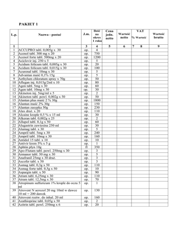 PAKIET 1 L.p. 1 1 2 3 4 5 6 7 8 9 10 11 12 13 14 15 16 17 18 19 20 21 22 23 24 25 26 27 28 29 30 31 32 33 34 35 36 37 38 39 40 41 42 Nazwa - postać J.m. 2 3 ACCUPRO tabl. 0,005g x 30 op. Acenol tabl. 300 mg x 20 op. Acenol forte tabl. 500mg x 20 op. Aciclovir inj. 250 x 5 op. Acidum folicum tabl. 0,005g x 30 op. Acidum folicum tabl. 0,015g x 30 op. Acurenal tabl. 10mg x 30 op. Advantan maść 0,1% 15g op. Aethylum chloratum spray x 70g op. Aflegan inj. 0,015g/2ml x 10 op. Agen tabl. 5mg x 30 op. Agen tabl. 10mg x 30 op. Akineton inj. 5mg/ml x 5 op. Akineton tabl. powl. 0,002g x 50 op. Alantan plus maść 2 % 30g op. Alantan maść 2% 30g op. Alantan zasypka 50g op. Alax draż. x 20 op. Alcaine krople 0,5 % x 15 ml op. Alkeran tabl. 0,002g x 25 op. Allupol tabl. 0,1g x 50 op. Alugastrin zawiesina 250 ml op. Alumag tabl. x 30 op. Ampril tabl. 5mg x 30 op. Ampril tabl. 10mg x 30 op. Antidol 15 tabl. x 10 op. Antivir krem 5% x 5 g op. Aphtin płyn 10g fl Apo-Flutam tabl. powl. 250mg x 30 op. Armanor tabl. 50 mg x 30 op. Anafranil 25mg x 30 draż. op. Ascofer tabl. x 50 op. Asmag tabl. 0,3g x 50 op. Asmag forte tabl. 0,5g x 50 op. Aspargin tabl. x 50 op. Atram tabl. 6,25mg x 30 op. Atram tabl. 12,5mg x 30 op. Atropinum sulfuricum 1% krople do oczu 5 op. ml Atrovent N aerozol 20 mg 10ml w dawce op. 10 ml = 200 dawek Atrovent roztw. do inhal. 20 ml op. Azathioprine tabl. 0,05g x 50 op. Azitrin tabl. powl. 250mg x 6 op. Ilość na okres 1 roku Cena jedn. netto Wartość 4 4 750 1200 5 20 100 5 5 50 80 60 30 2 50 1800 150 230 110 30 2 60 30 5 240 160 10 1 350 3 5 3 3 110 10 90 110 70 1 5 6 130 160 2 20 VAT netto % Wartość 7 8 Wartość brutto 9 43 44 45 46 47 48 49 50 Azitrin tabl. powl. 500mg x 3 Baclofen tabl. 10mg x 50 Baclofen tabl. 25mg x 50 Belogent maść (0,5mg + 1mg)g - 15g Bemecor tabl. 0,1 mg x 30 Berodual N aerozol 10 ml = 200 daw Berodual roztw. do inhal. 20 ml Berotec N aerozol 0,1 mg w dawce 10 ml 100 daw op. op. op. op. op. op. op. op. 10 90 130 5 8 25 270 5 51 52 53 54 55 Betadrin ophtalmicum krople do oczu 2 x 5ml fl op. op. op. op. 5 50 10 10 100 op. op. 10 15 op. op. op. op. op. op. op. op. 15 50 5 5 15 5 100 200 op. op. op. op. op. op. szt. op. op. op. op. op. op. op. op. op. op. op. op. op. op. op. op. op. fl 90 120 40 5 5 5 100 130 5 60 35 3 3 5 3 1 6 2 60 100 20 500 10 4 10 56 57 58 59 60 61 62 63 64 65 66 67 68 69 70 71 72 73 74 75 76 77 76 77 78 79 80 81 82 83 84 85 86 87 88 Betaloc ZOK tabl. 50mg x 28 Betaloc ZOK tabl. 100mg x 28 Bioxetin tabl. 20mg x 30 Biodacyna ophtalmicum krople do oczu 0,3% x 5 ml Bisacodyl tabl.powl. 0,005g x 30 Biseptol o smaku poziomkowym b/cukru zawiesina 100 ml Bromocorn tabl. x 30 Buscolysin inj. 0,02g/1 ml x 10 amp. Buvasodil tabl. powl. 150Mg x 20 Buvasodil tabl. powl. 300Mg x 20 Calcium syrop x 150 ml (smak bananowy) Calcium dobesilate tabl. 250 mg x 30 Calcium Polfa tabl. musujące x 12 Calcium Polfa (smak jeżynowy) tabl. musujące x 12 Captopril tabl. 0,025g x 40 Captopril tabl. 0,0125g x 30 Carbo medicinalis tabl. 0,3g x 20 Cardiol C krople 40,0 Cebion multi krople 10ml Cebion 100mg/ml 30ml krople Celestone inj. 4mg/1ml x 1 amp, Cerutin tabl. powl. x125 Chlorchinaldin H maść 5g Chlorchinaldin tabl. do ssania 0,002g x 20 Chlorocyclinum maść 3% x 10g Chlorprothixen tabl. powl. 0,015 x 50 Chlorprothixen tabl. powl. 0,05g x 50 Cholestil tabl. 0,2g x 50 Cital tabl. powl. 20mg x 30 Codeinum phosphoricum tabl. 0,02g x 100 Colchicum dispert tabl. 0,5mg x 50 Colitan czopki 250mg x 10 Concor Cor tabl. 1,25mg x 28 Concor Cor tabl. powl. 2,5mg x 28 Concor Cor tabl. powl. 5mg x 28 Contix tabl. dojelit. 20mg x 28 Corneregel żel 5g Cortinef tabl. 0,1mg x 20 Crotamiton płyn 10% x 100g 89 90 91 92 93 94 95 96 97 98 99 100 101 102 103 104 105 106 107 108 109 110 111 112 113 114 115 116 117 118 119 120 121 122 123 124 125 126 127 128 129 130 131 132 133 134 135 136 137 138 139 140 Crotamiton maść 10% x 40g Cyclonamine tabl. 250 mg x 30 Cytotec tabl. 0,2mg x 30 Czopki glicerynowe 2g x 10 Czopki glicerynowe 1g x 10 Dafalgan Codeine tabl.500mg + 30 x 16 Dalacin C kaps. 150mg x 16 Debridat 250ml zaw. 0,787g/100g Deflegmin tabl. 30 mg x 20 Delacet płyn 100g Depo-Medrol fiol. 0,04g/1 ml Detreomycyna maść 1% x 5g Detreomycyna maść 2% x 5g Digoxin tabl. 0,1mg x 30 Dilzem tabl. 60mg x 100 Dilzem retard 90mg x 30 Dilzem tabl. o p/uwal. 120mg x 30 retard Dilzem tabl. o p/uwal. 180mg x 30 retard Diprophos inj. 1ml x 5 Ditropan tabl. 5 mg x 30 Diuramid tabl. 0,25g x 30 Diuver tabl. 5mg x 30 Diuver tabl. 10mg x 30 Dip Rilif żel 30g Dopegyt tabl. 0,25g x 50 Duomox tabl. 250mg x 20 Duomox tabl. 500mg x 20 Duomox tabl. 1000mg x 20 Duspatalin Retard kaps. 200mg x 30 Duphaston tabl. 10 mg x 20 Efferalgan czop. 150mg x 10 Effox tabl. 10mg x 60 Effox tabl. 20mg x 50 Effox long tabl. 50mg x 30 Effox long tabl. 75mg x 30 Endoxan tabl. 50mg x 50 Epanutin inj. 250mg/5ml x 5 Espumisan kaps. 0,04g x 100 Esputicon krople 5g Esputicon kaps. 0,05g x 100 Ethambutol kaps. 0,25g x 250 Euthyrox tabl. 25mcg x 100 Euthyrox tabl. 25mcg x 50 Euthyrox tabl. 75 mcg x 50 Fantomalt proszek 400g Fenardin kaps. 267Mg x 30 Floxal maść do oczu 3g Fluconazole kaps. 0,05g x 14 Fluconazole tabl. 0,1g x 7 Fluconazin sir. 5mg/ml 150ml Fluorescite inj. doż. 10% 5ml Fluormex płyn 50,0 op. op. op. op. op. op. op. op. op. fl fiol op. op. op. op. op. op. op. op. op. op. op. op. op. op. op. op. op. op. op. op. op. op. op. op. op. op. op. op. op. op. op. op. op. op. op. op. op. op. op. amp. op. 10 30 2 220 40 3 10 3 10 15 90 20 60 50 20 30 15 10 5 2 2 30 10 130 30 10 10 5 20 80 30 5 5 120 15 2 5 20 60 100 1 10 25 15 10 60 3 5 60 30 24 170 141 142 143 144 145 146 147 148 149 150 151 152 153 154 155 156 157 158 159 160 161 162 163 164 165 166 167 168 169 170 171 172 173 174 175 176 177 178 179 180 181 182 183 184 185 186 187 188 189 190 191 192 Forlax pr. x 20 saszetek Fortrans proszek 4 saszetki Fucidin maść 2% 15g Furagin tabl. 0,05g x 30 Furazolidon zaw. 0,0165g/5ml 160g Flutamid tabl. 2