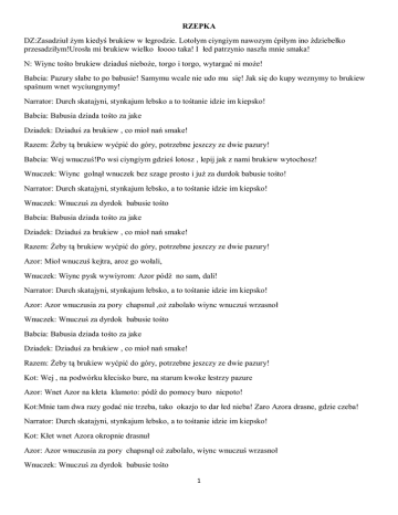 RZEPKA DZ:Zasadziuł żym kiedyś brukiew w łegrodzie. Lotołym ciyngiym nawozym ćpiłym ino ździebełko przesadziłym!Urosła mi brukiew wielko łoooo taka! I łed patrzynio naszła mnie smaka! N: Wiync tośto brukiew dziaduś nieboże, torgo i torgo, wytargać ni może! Babcia: Pazury słabe to po babusie! Samymu wcale nie udo mu się! Jak się do kupy weznymy to brukiew spaśnum wnet wyciungnymy! Narrator: Durch skatajyni, stynkajum łebsko a to tośtanie idzie im kiepsko! Babcia: Babusia dziada tośto za jake Dziadek: Dziaduś za brukiew , co mioł nań smake! Razem: Żeby tą brukiew wyćpić do góry, potrzebne jeszczy ze dwie pazury! Babcia: Wej wnuczuś!Po wsi ciyngiym gdzieś lotosz , lepij jak z nami brukiew wytochosz! Wnuczek: Wiync golnął wnuczek bez szage prosto i już za durdok babusie tośto! Narrator: Durch skatajyni, stynkajum łebsko, a to tośtanie idzie im kiepsko! Wnuczek: Wnuczuś za dyrdok babusie tośto Babcia: Babusia dziada tośto za jake Dziadek: Dziaduś za brukiew , co mioł nań smake! Razem: Żeby tą brukiew wyćpić do góry, potrzebne jeszczy ze dwie pazury! Azor: Mioł wnuczuś kejtra, aroz go wołali, Wnuczek: Wiync pysk wywiyrom: Azor pódź no sam, dali! Narrator: Durch skatajyni, stynkajum łebsko, a to tośtanie idzie im kiepsko! Azor: Azor wnuczusia za pory chapsnuł ,oż zabolało wiync wnuczuś wrzasnoł Wnuczek: Wnuczuś za dyrdok babusie tośto Babcia: Babusia dziada tośto za jake Dziadek: Dziaduś za brukiew , co mioł nań smake! Razem: Żeby tą brukiew wyćpić do góry, potrzebne jeszczy ze dwie pazury! Kot: Wej , na podwórku kłecisko bure, na starum kwoke łestrzy pazure Azor: Wnet Azor na kłeta klamoto: pódź do pomocy buro nicpoto! Kot:Mnie tam dwa razy godać nie trzeba, tako okazjo to dar łed nieba! Zaro Azora drasne, gdzie czeba! Narrator: Durch skatajyni, stynkajum łebsko, a to tośtanie idzie im kiepsko! Kot: Kłet wnet Azora okropnie drasnuł Azor: Azor wnuczusia za pory chapsnął oż zabolało, wiync wnuczuś wrzasnoł Wnuczek: Wnuczuś za dyrdok babusie tośto 1 Babcia: Babusia dziada tośto za jake Dziadek: Dziaduś za brukiew , co mioł nań smake! Razem: Żeby tą brukiew wyćpić do góry, potrzebne jeszczy ze dwie pazury! Kot: Miałczy wiync kłetek na lichum kure Kura: A ta już dyrdo, choć mo płed góre! Narrator: Durch skatajyni, stynkajum łebsko, a to tośtanie idzie im kiepsko! Kura: dziabnęła kota gadzina licho a tyn do góry ino tak fiko Kot: Kłet wnet Azora okropnie drasnuł Azor: Azor wnuczusia za pory chapsnął oż zabolało wiync wnuczuś wrzasnoł Wnuczek: Wnuczuś za dyrdok babusie tośto Babcia: Babusia dziada tośto za jake Dziadek: Dziaduś za brukiew , co mioł nań smake! Razem: Żeby tą brukiew wyćpić do góry potrzebne jeszczy ze dwie pazury! Gęś: Gajor na miedzy skubał Se trowke Kura: Podź sam kochany tu na przystowke! Narrator: Durch skatajyni, stynkajum łebsko, a to tośtanie idzie im kiepsko! Gęś: Gajor już kure za piyrze głabnuł Kura: dziabnęła kota gadzina licho, a tyn do góry ino tak fiko Kot: Kłet wnet Azora okropnie drasnuł Azor: Azor wnuczusia za pory chapsnął oż zabolało, wiync wnuczuś wrzasnoł Wnuczek: Wnuczuś za dyrdok babusie tośto Babcia: Babusia dziada tośto za jake Dziadek: Dziaduś za brukiew , co mioł nań smake! Razem: Żeby tą brukiew wyćpić do góry ,potrzebne jeszczy ze dwie pazury! Bociek: Wej , patrzcie w góre, klekot loto w koło i na te brukiew tyż gały wywolo Narrator: Durch skatajyni, stynkajum łebsko, a to tośtanie idzie im kiepsko! Bociek:Klekot gajora za kuper capnuł Gęś: Gajor już kure za piyrze głabnuł Kura: dziabnęła kota gadzina licho, a tyn do góry ino tak fiko Kot: Kłet wnet Azora okropnie drasnuł Azor: Azor wnuczusia za pory chapsnął oż zabolało wiync wnuczuś wrzasnoł 2 Wnuczek: Wnuczuś za dyrdok babusie tośto Babcia: Babusia dziada tośto za jake Dziadek: Dziaduś za brukiew , co mioł nań smake! Razem: Żeby tą brukiew wyćpić do góry, potrzebne jeszczy ze dwie pazury! Żaba: Akurat chyco wew tamtum strune z gałami wielkimi stworzynie zielune! Rychtyg zamiana! Chocioż roz jedyn żaba capnie bołeciana! Narrator: Durch skatajyni, stynkajum łebsko, a to tośtanie idzie im kiepsko! Żaba: Ż aba klekota za giyry torgo Bociek:Klekot gajora za kuper capnuł Gęś: Gajor już kure za piyrze głabnuł Kura: dziabnęła kota gadzina licho, a tyn do góry ino tak fiko Kot: Kłet wnet Azora okropnie drasnuł Azor: Azor wnuczusia za pory chapsnął oż zabolało wiync wnuczuś wrzasnoł Wnuczek: Wnuczuś za dyrdok babusie tośto Babcia: Babusia dziada tośto za jake Dziadek: Dziaduś za brukiew , co mioł nań smake! Razem: Żeby tą brukiew wyćpić do góry, potrzebne jeszczy ze dwie pazury! Kawka: Zza kierzka kawka na nich szpekała, bo na tum brukiew tyż smake miała Rug- cug ptoszek cherlawy trzymo się giyrów zieluny żaby Narrator: Tak się uwziyni, tak zapierali że spaśnym brukiew z rajki wytorgali. Ale poruta była w jedny chwili: Razem: Wszyscy na się się łobalili! Autor: ANNA CIEŚLAK 3
