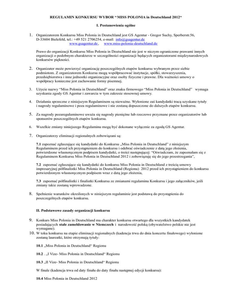 REGULAMIN KONKURSU WYBOR “MISS POLONIA in Deutschland 2012“ I. Postanowienia ogólne 1. Organizatorem Konkursu Miss Polonia in Deutschland jest GS Agentur - Gregor Suchy, Sperberstr.56, D-33604 Bielefeld, tel.: +49 521 2706254, e-mail: [email protected] www.gsagentur.de , www.miss-polonia-deutschland.de Prawo do organizacji Konkursu Miss Polonia in Deutschland nie jest w niczym ograniczone prawami innych organizacji o podobnym charakterze w szczególności organizacji będących organizatorami międzynarodowych konkursów piękności. 2. Organizator może powierzyć organizację poszczególnych etapów konkursu wybranym przez siebie podmiotom. Z organizatorem Konkursu mogą współpracować instytucje, spółki, stowarzyszenia, przedsiębiorstwa i inne jednostki organizacyjne oraz osoby fizyczne i prawne. Dla ważności umowy o współpracy konieczne jest zachowanie formy pisemnej. 3. Użycie nazwy “Miss Polonia in Deutschland” oraz znaku firmowego “Miss Polonia in Deutschland” wymaga uzyskania zgody GS Agentur i zawarcia w tym zakresie stosownej umowy. 4. Działania sprzeczne z niniejszym Regulaminem są nieważne. Wyłonione zaś kandydatki tracą uzyskane tytuły i nagrody regulaminowe i poza regulaminowe i nie zostaną dopuszczone do dalszych etapów konkursu. 5. Za nagrody pozaregulaminowe uważa się nagrody pieniężne lub rzeczowe przyznane przez organizatorów lub sponsorów poszczególnych etapów konkursu. 6. Wszelkie zmiany niniejszego Regulaminu mogą być dokonane wyłącznie za zgodą GS Agentur. 7. Organizatorzy eliminacji regionalnych zobowiązani są: 7.1 zapoznać zgłaszające się kandydatki do Konkursu „Miss Polonia in Deutschland” z niniejszym Regulaminem przed ich przystąpieniem do konkursu i odebrać oświadczenie z datą jego złożenia, potwierdzone własnoręcznym podpisem kandydatki, o treści następującej: “Oświadczam, że zapoznałam się z Regulaminem Konkursu Miss Polonia in Deutschland 2012 i zobowiązuję się do jego przestrzegania”, 7.2 zapoznać zgłaszające się kandydatki do konkursu Miss Polonia in Deutschland z treścią umowy impresaryjnej półfinalistki Miss Polonia in Deutschland (Regionu) 2012 przed ich przystąpieniem do konkursu potwierdzonym własnoręcznym podpisem wraz z datą jego złożenia, 7.3 zapoznać półfinalistki i finalistki Konkursu ze zmianami regulaminu Konkursu i jego załączników, jeśli zmiany takie zostaną wprowadzone. 8. Spełnienie warunków określonych w niniejszym regulaminie jest podstawą do przystąpienia do poszczególnych etapów konkursu. II. Podstawowe zasady organizacji konkursu 9. Konkurs Miss Polonia in Deutschland ma charakter konkursu otwartego dla wszystkich kandydatek 10. posiadających stałe zameldowanie w Niemczech i narodowość polską (obywatelstwo polskie nie jest wymagane). W toku konkursu na etapie eliminacji regionalnych (kadencja trwa do dnia koncertu finałowego) wyłonione zostaną laureatki, które otrzymają tytuły: 10.1 „Miss Polonia in Deutschland“ Regionu 10.2 . „I Vize- Miss Polonia in Deutschland“ Regionu 10.3 „II Vize- Miss Polonia in Deutschland“ Regionu W finale (kadencja trwa od daty finału do daty finału następnej edycji konkursu): 10.4 Miss Polonia in Deutschland 2012 10.5 I Vize- Miss Miss Polonia in Deutschland 2012 10.6 II Vize- Miss Polonia in Deutschland 2012 11. Za zgodą GS Agentur organizatorzy poszczególnych etapów konkursu mogą przyznawać dodatkowe tytuły. 12. Za laureatkę uważa się zdobywczynię przynajmniej jednego z tytułów wymienionych w pkt. 10 i 11. III. Warunki przystąpienia i uczestnictwa w konkursie 13. Przystąpienie do konkursu może nastąpić poprzez zgłoszenie się do najbliższego licencjonowanego organizatora eliminacji regionalnych lub nadesłanie na adres GS Agentur oferty zawierającej minimum po jednym zdjęciu: portretowym, całej sylwetki, całej sylwetki w kostiumie kąpielowym, wraz z krótką charakterystyką zawartą w ankiecie kandydatki . 14. Kandydatka do Konkursu Miss Poloniain Deutschland musi spełniać następujące warunki: 14.1 posiadać stałe zameldowanie w Niemczech (obywatelstwo polskie nie jest wymagane), 14.2 być bezdzietną panną, 14.3 nie posiadać na ciele widocznych tatuaży, 14.4 Wiek 18-25 lata, {w październiku 2012 kandydatka musi mieć ukończone 18 lat i nieprzekroczone 25 lat). Za dzień przystąpienia do konkursu uważa się dzień zgłoszenia się do konkursu. 14.5 wypełnić Ankietę Kandydatki (pkt. 41 Regulaminu), zapoznać się z Regulaminem i złożyć Oświadczenie zgodnie z rozdziałem I pkt. 7 niniejszego Regulaminu, 14.6 nie mogą istnieć żadne opublikowane w mediach (tv, czasopisma, internet) zdjęcia, filmy, ukazujące sylwetkę „toples” lub obscenicznych pozycji kandydatki. 15. W konkursie nie mogą brać udziału kandydatki, które jako osoby pełnoletnie, brały lub biorą udział w organizowanych w poprzednich konkursach Miss Polonia in Deutschland awansując do finału. 16. Kandydatka zakwalifikowana do konkursu regionalnego zobowiązana jest przygotować na własny koszt suknię wieczorową do prezentacji na scenie, odpowiednie obuwie na wysokim obcasie oraz kostium kąpielowy jednoczęściowy jeżeli organizator regionalny nie będzie dysponował inną konfekcją. 17. Kandydatki uczestniczą w eliminacjach regionalnych na własny koszt. 18. Organizator Finału gwarantuje finalistkom zakwaterowanie i wyżywienie w czasie zgrupowań przygotowawczych do Gali Finałowej. Wszelkie dodatkowe koszty jak: koszty podróży, telefony i inne ponoszą uczestniczki konkursu. 19. Uczestniczki konkursu zobowiązują się nie komentować publicznie werdyktów Jury poszczególnych etapów konkursu, ewentualne wnioski zgłaszać bezpośrednio do GS Agentur. 20. Uczestniczka w przypadku naruszenia niniejszego regulaminu a zwłaszcza: wyjścia za mąż, zajścia w ciążę w trakcie trwania konkursu, traci prawo dalszego udziału w konkursie i zapłac