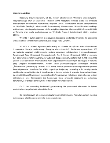 MAREK SŁABIŃSKI Rodowity inowrocławianin, lat 51. Jestem absolwentem Wydziału MatematycznoPrzyrodniczego WSP w Szczecinie - dyplom 1994. Odbyłem również studia na Wydziale Elektrycznym Politechniki Poznańskiej (dyplom 1988). Ukończyłem studia podyplomowe na Wydziale Geodezji i Gospodarki Przestrzennej Uniwersytetu Warmińsko-Mazurskiego w Olsztynie, studia podyplomowe z informatyki na Wydziale Matematyki i Informatyki UMK w Toruniu oraz studia podyplomowe na Wydziale Prawa i Administracji UMK - dyplom 2004 r. W 1982 r. byłem jednym z założycieli Zrzeszenia Studentów Polskich. W Szczecinie w latach 1982 - 1984 byłem szefem studenckiego radia „SFERA”. W 2001 r. zdałem egzamin państwowy w zakresie zarządzania nieruchomościami i uzyskałem licencję państwową „Zarządcy nieruchomości”. Posiadam uprawnienia SEP do badania urządzeń elektrycznych. Jestem członkiem założycielem i przewodniczącym Powiatowej Rady Organizacji Pozarządowych. Na III Forum Organizacji NGO w czerwcu b.r. ponownie zostałem wybrany, w wyborach bezpośrednich, szefem ROP II. Od roku 2003 jestem także członkiem Wojewódzkiej Rady Organizacji Pozarządowych działającej w Toruniu przy Urzędzie Marszałkowskim. Jestem także przewodniczącym Samorządu Osiedla „Śródmieście”(II kadencja). Od roku 2002 pełnię funkcję prezesa Kujawskiego Stowarzyszenie Przedsiębiorców i Handlowców. KSPiH organizuje inicjatywy prowadzące do rozwiązywania problemów przedsiębiorców i handlowców z terenu miasta i powiatu inowrocławskiego. W roku 2008 współtworzyłem Inowrocławskie Towarzystwo Hokejowe, gdzie obecnie jestem sekretarzem oraz Komisarzem Ligi hokejowej, która prowadzi rozgrywki na lodowisku toruńskim, a w okresie zimowym na lodowiskach inowrocławskich. Od 21 lat prowadzę działalność gospodarczą. Na przestrzeni kilkunastu lat byłem właścicielem i współwłaścicielem kilku firm . Od najmłodszych lat zajmuję się żeglarstwem i lotnictwem. Posiadam patent sternika jachtowego, a także patent sternika motorowodnego.