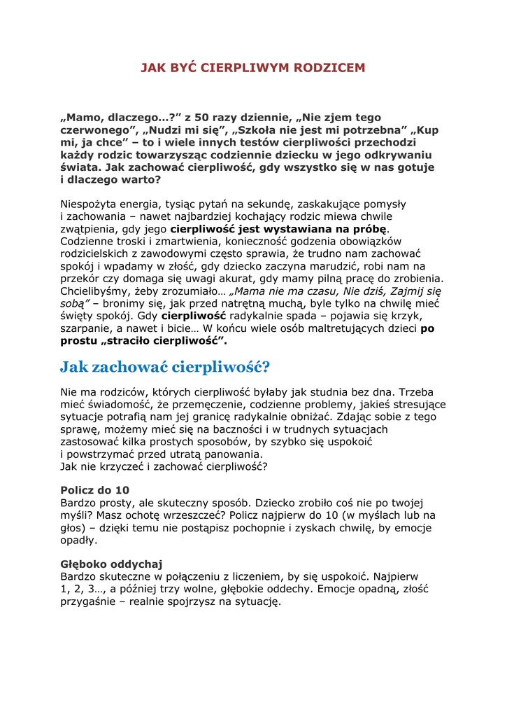 JAK BYĆ CIERPLIWYM RODZICEM „Mamo, dlaczego…?” z 50 razy dziennie, „Nie zjem tego czerwonego”, „Nudzi mi się”, „Szkoła nie jest mi potrzebna” „Kup mi, ja chce” – to i wiele innych testów cierpliwości przechodzi każdy rodzic towarzysząc codziennie dziecku w jego odkrywaniu świata. Jak zachować cierpliwość, gdy wszystko się w nas gotuje i dlaczego warto? Niespożyta energia, tysiąc pytań na sekundę, zaskakujące pomysły i zachowania – nawet najbardziej kochający rodzic miewa chwile zwątpienia, gdy jego cierpliwość jest wystawiana na próbę. Codzienne troski i zmartwienia, konieczność godzenia obowiązków rodzicielskich z zawodowymi często sprawia, że trudno nam zachować spokój i wpadamy w złość, gdy dziecko zaczyna marudzić, robi nam na przekór czy domaga się uwagi akurat, gdy mamy pilną pracę do zrobienia. Chcielibyśmy, żeby zrozumiało… „Mama nie ma czasu, Nie dziś, Zajmij się sobą” – bronimy się, jak przed natrętną muchą, byle tylko na chwilę mieć święty spokój. Gdy cierpliwość radykalnie spada – pojawia się krzyk, szarpanie, a nawet i bicie… W końcu wiele osób maltretujących dzieci po prostu „straciło cierpliwość”. Jak zachować cierpliwość? Nie ma rodziców, których cierpliwość byłaby jak studnia bez dna. Trzeba mieć świadomość, że przemęczenie, codzienne problemy, jakieś stresujące sytuacje potrafią nam jej granicę radykalnie obniżać. Zdając sobie z tego sprawę, możemy mieć się na baczności i w trudnych sytuacjach zastosować kilka prostych sposobów, by szybko się uspokoić i powstrzymać przed utratą panowania. Jak nie krzyczeć i zachować cierpliwość? Policz do 10 Bardzo prosty, ale skuteczny sposób. Dziecko zrobiło coś nie po twojej myśli? Masz ochotę wrzeszczeć? Policz najpierw do 10 (w myślach lub na głos) – dzięki temu nie postąpisz pochopnie i zyskach chwilę, by emocje opadły. Głęboko oddychaj Bardzo skuteczne w połączeniu z liczeniem, by się uspokoić. Najpierw 1, 2, 3…, a później trzy wolne, głębokie oddechy. Emocje opadną, złość przygaśnie – realnie spojrzysz na sytuację. Inni widzą moje zachowanie Gdy tylko czujesz, że zaraz wybuchniesz wyobraź sobie, że masz widownię, która widzi twoje zachowanie. Zwykle na myśl, że inni nas obserwują jesteśmy bardziej powściągliwi i motywuje nas to do trzymania nerwów. Dobre wzorce Nie masz już siły, gniew zaczyna rosnąć – dziecko znowu przyniosło jedynkę, walnęło drzwiami czy wdało się w bójkę? Poszukaj dla siebie wzoru – może nim być np. twoja mama, ktoś znajomy, kogo uważasz za przykład do naśladowania, jeśli chodzi o zachowanie cierpliwości. W chwili złości, przywołuj obraz tej sposoby… Pomyśl, jak by się zachowała w takiej sytuacji? Może ma dużo więcej powodów do frustracji, a mimo to dzielnie walczy o zachowanie cierpliwości? Czy to pomaga mojemu dziecku? Dobrym sposobem na przywrócenie się do porządku w chwili zniecierpliwienia jest postawienie sobie w myślach pytania – „Co ja robię, jak to wpłynie na moje dziecko?”. Szarpanie czy krzyk, bo dziecko np. nie zjadło posiłku – raczej nie zbuduje u niego poczucia bezpieczeństwa. Chwila przerwy Nie reaguj od razu (impulsywnie), daj sobie chwilę czasu na ochłonięcie. Gniew jest złym doradcą. Zrób sobie przerwę od sytuacji. Na 5-15 minut wyjdź do drugiego pokoju, do ogrodu. Uspokój się, przemyśl, co chcesz powiedzieć, jakie rozwiązania zaproponować i dopiero wtedy wróć do rozmowy z dzieckiem. Jestem nauczycielem Staraj się zawsze pamiętać, że dziecko nie wie jak zrobić wiele rzeczy, nie ma tych doświadczeń co ty i twoim przywilejem jest móc je uczyć. Jeśli tłumaczysz coś już któryś raz z kolei i popadasz w złość, że dziecko nadal nie rozumie – zmień swoje podejście. Wypróbuj inne sposoby, inne przykłady zamiast 10 razy robić coś, co widzisz, że i tak nie działa. Zaplanuj reakcję Stało się, straciłeś cierpliwość… Czasu nie da się cofnąć, ale z danej sytuacja można wyciągnąć wnioski na przyszłość. W wolnej chwili usiądź wygodnie, przypomnij sobie okoliczności, w jakich wybuchłeś złością i w myślach napisz nowy scenariusz tego zdarzenia – dobry dla ciebie i dziecka. Gdy następnym razem dojdzie do podobnej sytuacji – przywołaj wizualizację i postępuj tak, jak to sobie wcześniej ustaliłeś. Miłość cierpliwa jest Cierpliwość jest trudną sztuką, ale wyjątkowo cenną – bez niej niemożliwe jest zbudowanie szczęśliwej i kochającej się rodziny, bo przecież „miłość cierpliwa jest”. Zamiast reagować gniewam, naucz się reagować z miłością. Dziecko nie jest dorosłym… jest małym człowiekiem, który doświadczając, przyglądając się światu, biorąc przykład z rodzica i odnosząc się do jego wskazówek tworzy siebie. To, co często nas denerwuje, wyprowadza z równowagi – jest dla niego po prostu odkrywaniem świata, szukaniem u rodzica odpowiedzi na nurtujące pytania, wyrabianiem swojego podejścia do życia, wartości, nawyków… Mimo że bywa to dla rodzica frustrujące należy pamiętać, że okazując cierpliwość – okazujesz miłość. Pomagasz dziecku wzrastać, jesteś jego przewodnikiem i w znacznym stopniu od ciebie zależy, w jaki bagaż zostanie ono zaopatrzone na dorosłe życie.