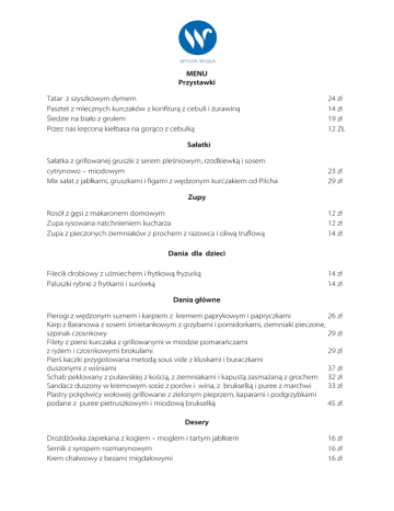 MENU Przystawki Tatar z szyszkowym dymem Pasztet z mlecznych kurczaków z konfiturą z cebuli i żurawiną Śledzie na biało z grulem Przez nas kręcona kiełbasa na gorąco z cebulką 24 zł 14 zł 19 zł 12 ZŁ Sałatki Sałatka z grillowanej gruszki z serem pleśniowym, rzodkiewką i sosem cytrynowo – miodowym Mix sałat z jabłkami, gruszkami i figami z wędzonym kurczakiem od Pilcha 23 zł 29 zł Zupy Rosół z gęsi z makaronem domowym Zupa rysowana natchnieniem kucharza Zupa z pieczonych ziemniaków z prochem z razowca i oliwą truflową 12 zł 12 zł 14 zł Dania dla dzieci Filecik drobiowy z uśmiechem i frytkową fryzurką Paluszki rybne z frytkami i surówką 14 zł 14 zł Dania główne Pierogi z wędzonym sumem i karpiem z kremem paprykowym i papryczkami 26 zł Karp z Baranowa z sosem śmietankowym z grzybami i pomidorkami, ziemniaki pieczone, szpinak czosnkowy 29 zł Filety z piersi kurczaka z grillowanymi w miodzie pomarańczami z ryżem i czosnkowymi brokułami 29 zł Pierś kaczki przygotowana metodą sous vide z kluskami i buraczkami duszonymi z wiśniami 37 zł Schab peklowany z puławskiej z kością, z ziemniakami i kapustą zasmażaną z grochem 32 zł Sandacz duszony w kremowym sosie z porów i wina, z brukselką i puree z marchwi 33 zł Plastry polędwicy wołowej grillowane z zielonym pieprzem, kaparami i podgrzybkami podane z puree pietruszkowym i miodową brukselką 45 zł Desery Drożdżówka zapiekana z koglem – moglem i tartym jabłkiem Sernik z syropem rozmarynowym Krem chałwowy z bezami migdałowymi 16 zł 16 zł 16 zł