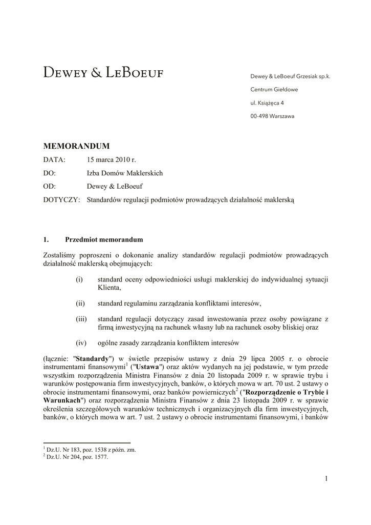 DOTYCZY: Standardów regulacji podmiotów prowadzących działalność maklerską