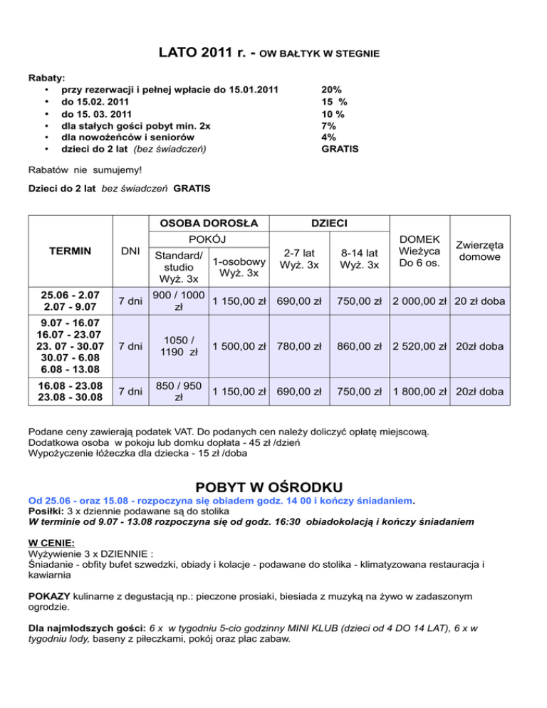 LATO 2011 r. - OW BAŁTYK W STEGNIE Rabaty: • przy rezerwacji i pełnej wpłacie do 15.01.2011 • do 15.02. 2011 • do 15. 03. 2011 • dla stałych gości pobyt min. 2x • dla nowożeńców i seniorów • dzieci do 2 lat (bez świadczeń) 20% 15 % 10 % 7% 4% GRATIS Rabatów nie sumujemy! Dzieci do 2 lat bez świadczeń GRATIS OSOBA DOROSŁA DZIECI POKÓJ TERMIN DNI 25.06 - 2.07 2.07 - 9.07 7 dni 9.07 - 16.07 16.07 - 23.07 23. 07 - 30.07 30.07 - 6.08 6.08 - 13.08 7 dni 16.08 - 23.08 23.08 - 30.08 7 dni Standard/ 1-osobowy studio Wyż. 3x Wyż. 3x 2-7 lat Wyż. 3x 900 / 1000 1 150,00 zł 690,00 zł zł 1050 / 1190 zł 8-14 lat Wyż. 3x DOMEK Wieżyca Do 6 os. Zwierzęta domowe 750,00 zł 2 000,00 zł 20 zł doba 1 500,00 zł 780,00 zł 860,00 zł 2 520,00 zł 20zł doba 850 / 950 1 150,00 zł 690,00 zł zł 750,00 zł 1 800,00 zł 20zł doba Podane ceny zawierają podatek VAT. Do podanych cen należy doliczyć opłatę miejscową. Dodatkowa osoba w pokoju lub domku dopłata - 45 zł /dzień Wypożyczenie łóżeczka dla dziecka - 15 zł /doba POBYT W OŚRODKU Od 25.06 - oraz 15.08 - rozpoczyna się obiadem godz. 14 00 i kończy śniadaniem. Posiłki: 3 x dziennie podawane są do stolika W terminie od 9.07 - 13.08 rozpoczyna się od godz. 16:30 obiadokolacją i kończy śniadaniem W CENIE: Wyżywienie 3 x DZIENNIE : Śniadanie - obfity bufet szwedzki, obiady i kolacje - podawane do stolika - klimatyzowana restauracja i kawiarnia POKAZY kulinarne z degustacją np.: pieczone prosiaki, biesiada z muzyką na żywo w zadaszonym ogrodzie. Dla najmłodszych gości: 6 x w tygodniu 5-cio godzinny MINI KLUB (dzieci od 4 DO 14 LAT), 6 x w tygodniu lody, baseny z piłeczkami, pokój oraz plac zabaw. Ponadto: DLA DZIECI i DOROSŁYCH programy artystyczne, animacje, dyskoteki, wieczorki taneczne przy muzyce na żywo, basen odkryty-1,20m gł. leżaki, parasole przy basenie, bar letni, kawiarnia z tarasem, kawiarenka internetowa, parking. Sport:: tenis stołowy, siłownia, boisko do koszykówki, siatkówki, kometki. Opuszczenie pokoi i domków DO GODZ. 10 00. Pokoje 2, 3 os. lub studia, każdy z łazienką, tv sat, telefonem, balkonem Domki typ Wieżyca (salon, łazienka ,aneks kuchenny oraz 2 sypialnie na piętrze) - możliwość wykupienia wyżywienia ZA OPŁATĄ: Pakiety SPA - od 120 zł, kort tenisowy, sauna ,solarium , jaccuzy, masaże, stoły rekondycyjne , gry wideo oraz WYCIECZKI FAKULTATYWNE (np.: Trójmiasto, Malbork, Rejsy Po Zalewie Wiślanym) REZERWACJA: Wpłata zadatku w wys. 800 zł od pokoju lub domku do 5-ciu dni od rezerwacji na konto lub przekazem pocztowym. NR.KONTA BS PRUSZCZ GD. 76 8335 0003 0117 9954 2000 0001 Po otrzymaniu zadatku wysyłamy potwierdzenie ! POZOSTAŁA OPŁATA ZA WCZASY NAJPÓŻNIEJ (Również opłata klimatyczna) W DNIU PRZYJAZDU! Tel. 55 247-82-47, 247-72-37, 247-72-57, 55 261-33-71 O.W BAŁTYK 82-103 Stegna, ul. Wczasowa 7 www.owbaltyk.pl lub www.baltyk.mierzeja.pl, e-meil: [email protected]