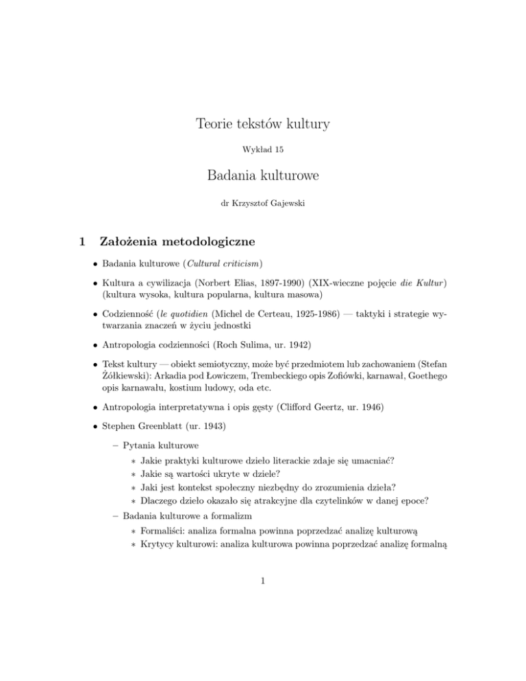 Teorie tekstów kultury Wykład 15 Badania kulturowe dr Krzysztof Gajewski 1 Założenia metodologiczne • Badania kulturowe (Cultural criticism) • Kultura a cywilizacja (Norbert Elias, 1897-1990) (XIX-wieczne pojęcie die Kultur ) (kultura wysoka, kultura popularna, kultura masowa) • Codzienność (le quotidien (Michel de Certeau, 1925-1986) — taktyki i strategie wytwarzania znaczeń w życiu jednostki • Antropologia codzienności (Roch Sulima, ur. 1942) • Tekst kultury — obiekt semiotyczny, może być przedmiotem lub zachowaniem (Stefan Żółkiewski): Arkadia pod Łowiczem, Trembeckiego opis Zofiówki, karnawał, Goethego opis karnawału, kostium ludowy, oda etc. • Antropologia interpretatywna i opis gęsty (Clifford Geertz, ur. 1946) • Stephen Greenblatt (ur. 1943) – Pytania kulturowe ∗ ∗ ∗ ∗ Jakie praktyki kulturowe dzieło literackie zdaje się umacniać? Jakie są wartości ukryte w dziele? Jaki jest kontekst społeczny niezbędny do zrozumienia dzieła? Dlaczego dzieło okazało się atrakcyjne dla czytelinków w danej epoce? – Badania kulturowe a formalizm ∗ Formaliści: analiza formalna powinna poprzedzać analizę kulturową ∗ Krytycy kulturowi: analiza kulturowa powinna poprzedzać analizę formalną 1 Badania kulturowe 2 Definicje kultury • kultura a natura (łac. cultura) • Philip Bagby: regularności w zachowaniu członków społeczeństwa, wyjąwszy regularności dziedziczne • Stefan Czarnowski: całokształt zobiektywizowanych elementów dorobku społecznego, wspólnych szeregowi grup i zdolnych rozszerzać się przestrzennie • Bronisław Malinowski: całość współzależnych instytucji: rodzina, sąsiedztwo, stowarzyszenia, państwo, grupy zawodowe • Ruth Benedict (1887-1948) – Wzory kultury, 1934: ∗ kultura jest spójnym zbiorem wzorów, przypomina indywidualną osobowość ∗ kultury apollińskie i dionizyjskie (Nietzsche) ∗ relatywizm kulturowy – Chryzantema i miecz, 1946 — kultura winy vs. kultura wstydu 3 Podstawowe pojęcia • Wymiana kula, rytuał potlacz (Marcel Mauss) • Pierre Bourdieu – – – – Kapitał kulturowy a kapitał społeczny i ekonomiczny Dystynkcja Przemoc symboliczna — język nie służy do komunikacji, ale do walki Habitus ∗ Arystoteles: hexis — sprawność, dyspozycja do działania ∗ św. Tomasz: nawyk do działania zgodnego z cnotą ∗ Pierre Bourdieu: system kulturowo nabytych dyspozycji do percepcji i działania • Ideologia (Marks), fałszywa świadomość (Engels) – ideologia mieszczańska powieści XIX w. – ideologia maskulinistyczna kina hollywodzkiego • Fakt instytucjonalny i rzeczywistość społeczna (John R. Searle) • Alfabet kultury (Ryszard Handke) Teorie tekstów kultury 2 Badania kulturowe Literatura [1] Antropologia kultury, red. A. Mencwel, Warszawa 1997. [2] Marvin Harris, Krowy, wojny, świnie i czarownice. Zagadki kultury, Katowice 2007. [3] M. P. Markowski, Badania kulturowe, w: A. Burzyńska, M. P. Markowski, Teorie literatury XX wieku, Kraków 2009. [4] Stefan Żółkiewski, Teksty kultury, Warszawa 1988. Teorie tekstów kultury 3