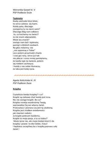 Weronika Gaweł kl. V PSP Podlesie Duże Tęsknota Kiedy odchodzi ktoś bliski, to serce zalewa się łzami. Każdy pyta, dlaczego zostajemy tu na ziemi sami? Dlaczego Bóg nam odbiera to, co kochamy na świeci? Ja nie znam odpowiedzi, Może wy znacie? zostaje nam ból i tęsknota, pamięć o bliskich osobach. Na głos mówimy: nie ,,nie zapomnę o Tobie” Lecz potem przychodzi chwila i czas goi rany, serce już tak nie płacze i coraz mniej pamiętamy, że każdy żyje na świecie, potem się niebem zachwyca. I każdy z nas sobie tłumaczy, że taka jest kolej życia. Agata Kalicińska kl. IV PSP Podlesie Duże Książka Czytaliście kiedyś książkę? I co? Książki są ciekawe choć każda jest inna. Nic nie zastąpi książki. Bo co? Książka rozwija wyobraźnię Twoją, wprowadza Cię we własny świat. Przeczytasz i poznasz czy jest tą ulubioną. Książka jest źródłem wiadomości. jak również radości. Ja książki polecam każdemu. Książki to moja pasja, a ty co lubisz? Może teraz nie, ale może kiedyś ktoś Ci da książkę i powie: to dla Ciebie, masz! I będziesz szczęśliwy bo z książką poznasz cały świat ! Dominika Piekarska kl. V PSP Podlesie Duże Zwierzaki Zazwyczaj w wierszach, opisujemy swoje zwierzaki: Mój kot jest taki i taki. A ja opiszę ogólnie zwierzęta, na przykład pisklęta pisklęta- czyli małe kurki które maja ciut duże pazurki. A co? Nie mogę opisać chomika? Bo p klatce szybko myka? Ana przykład pajączka? Bo co? Bo nie jest podobny do zajączka? Ale powiem Wam… że opiszę psa Bo słyszałam że pies, Najwierniejszy jest! Karol Patynowski kl. IV PSP Podlesie Duże Gil i sroka Urodził się gil z czerwonym brzuszkiem, nakrył go śnieg białym kożuszkiem. Jak to sroka zobaczyła, wrzasku, krzyku narobiła usiadła na progu kuchni i z zazdrości puchnie i puchnie. Patrycja Gaweł kl. VI PSP Podlesie Duże Opisz to wierszem Opisz to wierszem konkurs nam znany, przez wszystkie dzieci oczekiwany. Przez cały rok siedzę i knuję o czym ja wierszyk wam nadrukuje. Panie są mądre, ładnie czytają nasze wierszyki nam oceniają. Lubię ten konkurs, bardzo szanuję wiec nad tym wierszykiem kombinuję. Co mam zapisać w swoim wierszyku, bo o zwierzętach jest ich bez liku. O i wymyśliłam w swoim wierszyku się zatrzymałam. W mej głowie pomysł się nie rodzi nic mi do niej nie przychodzi. Ilona Kalicińska kl. VI PSP Podlesie Duże Szkoła Szkoła-miejsce wspaniałe choć zmartwienia mamy nie małe! Przynosi nam wiele radości, każdego roku więcej mądrości! Szkoła- nauczyciele, panie, panowie których jest niewiele! Uczą i pytają, a niekiedy też śpiewają zaśmiewają się czasami, rozbawieni naszymi pomysłami. Gdy do domu wrócimy to odpoczywamy, ale nigdy do szkoły nie zasypiamy! Grzecznie lekcje odrabiamy i oceny dobre w szkole zbieramy!