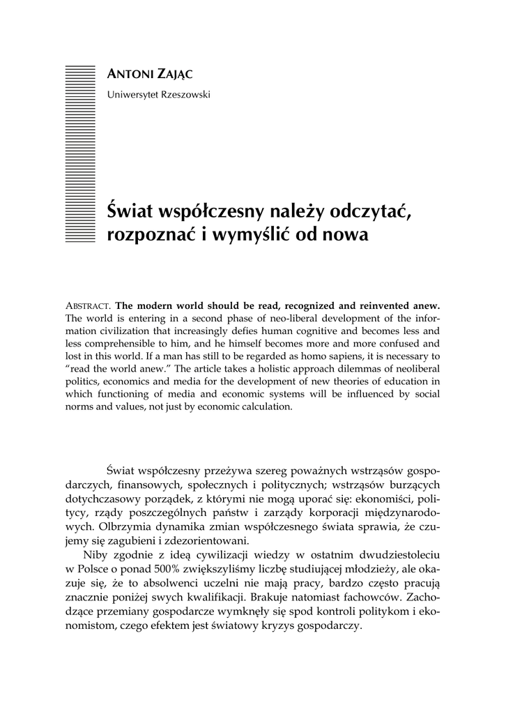 Świat współczesny należy odczytać, rozpoznać i wymyślić od nowa 235 ANTONI ZAJĄC Uniwersytet Rzeszowski Świat współczesny należy odczytać, rozpoznać i wymyślić od nowa ABSTRACT. The modern world should be read, recognized and reinvented anew. The world is entering in a second phase of neo-liberal development of the information civilization that increasingly defies human cognitive and becomes less and less comprehensible to him, and he himself becomes more and more confused and lost in this world. If a man has still to be regarded as homo sapiens, it is necessary to “read the world anew.” The article takes a holistic approach dilemmas of neoliberal politics, economics and media for the development of new theories of education in which functioning of media and economic systems will be influenced by social norms and values, not just by economic calculation. Świat współczesny przeżywa szereg poważnych wstrząsów gospodarczych, finansowych, społecznych i politycznych; wstrząsów burzących dotychczasowy porządek, z którymi nie mogą uporać się: ekonomiści, politycy, rządy poszczególnych państw i zarządy korporacji międzynarodowych. Olbrzymia dynamika zmian współczesnego świata sprawia, że czujemy się zagubieni i zdezorientowani. Niby zgodnie z ideą cywilizacji wiedzy w ostatnim dwudziestoleciu w Polsce o ponad 500% zwiększyliśmy liczbę studiującej młodzieży, ale okazuje się, że to absolwenci uczelni nie mają pracy, bardzo często pracują znacznie poniżej swych kwalifikacji. Brakuje natomiast fachowców. Zachodzące przemiany gospodarcze wymknęły się spod kontroli politykom i ekonomistom, czego efektem jest światowy kryzys gospodarczy. 236 Antoni Zając „Nowe odczytanie świata” – metodologiczne związki polityki i pedagogiki Świat wkracza w drugą fazę rozwoju cywilizacji informacyjnej, w której w wielu kwestiach życie ulegnie diametralnej zmianie. Osobom urodzonym w III RP trudno sobie wyobrazić puste półki w sklepach przed rokiem 1989, świat bez telefonów komórkowych, telewizji satelitarnej, komputerów i Internetu. Obecnie rozpoczyna się nowa faza skoku w rozwoju cywilizacyjnym, która znowu zburzy dotychczasowy porządek życia. I to nie będzie chodzić, jak do tej pory, o: zmianę tylko kierunku rozwoju czy modyfikację systemu społeczno-politycznego, rewolucję techniczną, wybór pomiędzy demokracją czy dyktaturą, gospodarką planowaną czy wolnorynkową, socjalizmem czy kapitalizmem, własnością prywatną czy państwową, taką czy inną partią z dotychczas znanych, lecz o wyznaczenie nowej logiki i dylematów rozwoju. „Odczytanie na nowo świata” oznacza sięgnięcie do ponowoczesnych paradygmatów aktywności intelektualnej i twórczej człowieka w zakresie intelektualnym, filozoficznym i artystycznym1. Co prawda wybitny humanista i pedagog Bogdan Suchodolski w 2003 r. w wątpliwość podał zasadność poglądu, czy to: Zwłaszcza pedagogowie winni zastanawiać się nad kształtem, jaki powinna przyjąć przyszłość, nad koniecznym wyborem między przedłużeniem teraźniejszości a jej twórczym przeobrażeniem2. Faktem jest, że humaniści, a w tym pedagogowie, zostali zdominowani przez polityków i ekonomistów. To w ich rękach wydaje się znajdować los cywilizacji, człowieka i cała edukacja. Trzy procesy rozwijane przez polityków i biznes kształtują oblicze świata – globalizacja, media i konsumeryzm. „W nowym odczytywaniu świata” chodzi o holistyczne spojrzenie na zachodzące przemiany we wszystkich obszarach życia i dyscyplinach naukowych, uwzględnienie najnowszych osiągnięć w takich specjalnościach, jak: fizyka jądrowa, biotechnologia molekularna, informatyka, nauki techniczne i humanistyczne oraz pewne dyscypliny filozoficzne, w tym filozofię rozumianą jako: poszukiwanie mądrości, bioetykę, filozofię życia i twórczości, nowy wyraz piękna w szeroko rozumianej sztuce, a także, dodajmy, w ekonomii i świecie wartości. Nie chodzi o wykorzystanie najnowszych __________________ 1 J. Szmyd, Odczytywanie współczesności. Perspektywa antropologiczna, etyczna i edukacyjna, Ofic. Wydawnicza AFM, Kraków 2011, s. 23. 2 B. Suchodolski, Edukacja permanentna – rozdroża i nadzieje, przeł. I. Wojnar, Warszawa 2003, s. 80. Świat współczesny należy odczytać, rozpoznać i wymyślić od nowa 237 osiągnięć na gruncie tradycyjnie rozumianych nauk szczegółowych i dyscyplin filozoficznych, ale o spojrzenie holistyczne dla poznania głównych zmian procesów społecznych, cywilizacyjnych, mentalnych i kulturowych; poznania z pozycji jak gdyby całościowej epistemologii świata ludzkiego3. Gdy do tego uzmysłowimy sobie ogłoszony 5 lipca 2012 r., w ośrodku jądrowym w CERN pod Genewą, komunikat o uchwyceniu cząstki Higgsa czy, jak niektórzy nazywają, „boskiej cząstki materii”, świat już nigdy nie będzie taki sam, bowiem to otwiera nowe, niesamowite obszary dla odkryć naukowych. Bez tego „pola osnowy” wszystkie elementarne cząstki byłyby nieważkie, poruszałyby się z prędkością światła bez możliwości połączenia w atomy, przedmioty czy planety. Cząstka ta zdradza istnienie niewidzialnego bytu, który nas otacza i przenika, a w dodatku jest niewyczuwalny żadnymi zmysłami, nadaje materii masę. Zgłębienie i bliższe jej poznanie stwarza niesamowite możliwości tworzenia nowych odkryć. Nie jest to już świat fantazji, ale początek nowej, niewyobrażalnej drogi rozwoju ludzkości. Niektórzy już nieco wcześniej, w odwołaniu do biotechnologii i inżynierii genetycznej, stawiali pytanie, czy przeżywamy obecnie przyśpieszoną ewolucję rozwoju świata i człowieka, czy też świat wymyka się spod kontroli i niebezpiecznie zawraca, zmierzając do samozagłady? W mediach natomiast zamiast rzetelnych informacji wyjaśniających zachodzące przemiany występuje „informacyjny smog”, czyli przetworzona przez polityków i wielk