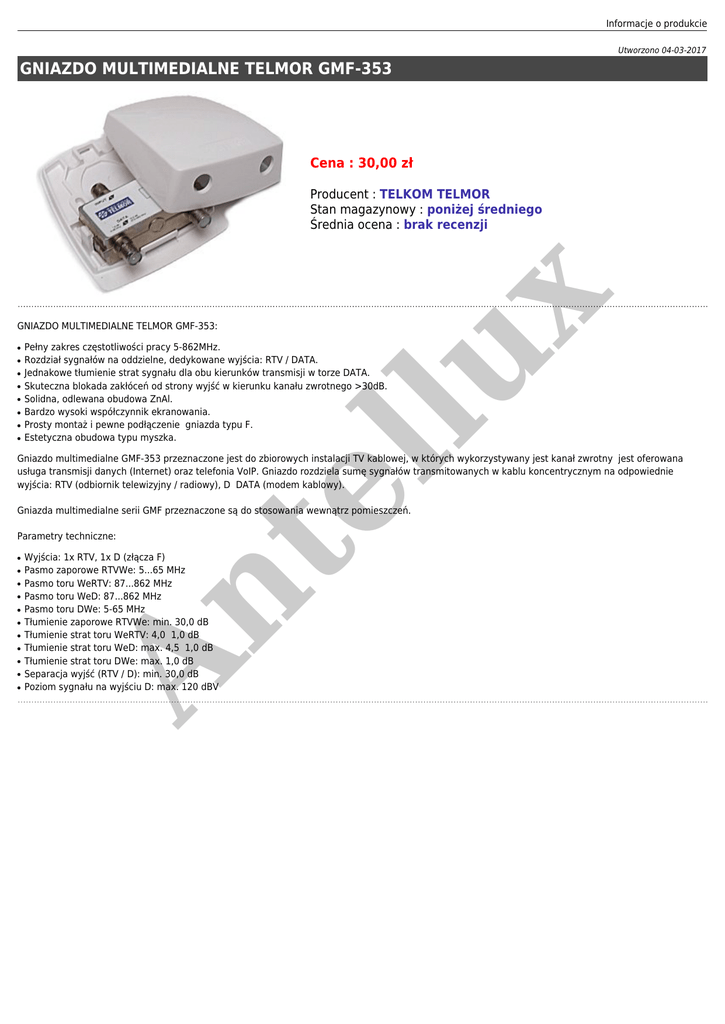 Informacje o produkcie Utworzono 04-03-2017 GNIAZDO MULTIMEDIALNE TELMOR GMF-353 Cena : 30,00 zł GNIAZDO MULTIMEDIALNE TELMOR GMF-353: ● ● ● ● ● ● Pełny zakres częstotliwości pracy 5-862MHz. Rozdział sygnałów na oddzielne, dedykowane wyjścia: RTV / DATA. Jednakowe tłumienie strat sygnału dla obu kierunków transmisji w torze DATA. Skuteczna blokada zakłóceń od strony wyjść w kierunku kanału zwrotnego >30dB. Solidna, odlewana obudowa ZnAl. Bardzo wysoki współczynnik ekranowania. Prosty montaż i pewne podłączenie gniazda typu F. Estetyczna obudowa typu myszka. lu ● te l ● x Producent : TELKOM TELMOR Stan magazynowy : poniżej średniego Średnia ocena : brak recenzji Gniazdo multimedialne GMF-353 przeznaczone jest do zbiorowych instalacji TV kablowej, w których wykorzystywany jest kanał zwrotny jest oferowana usługa transmisji danych (Internet) oraz telefonia VoIP. Gniazdo rozdziela sumę sygnałów transmitowanych w kablu koncentrycznym na odpowiednie wyjścia: RTV (odbiornik telewizyjny / radiowy), D DATA (modem kablowy). Gniazda multimedialne serii GMF przeznaczone są do stosowania wewnątrz pomieszczeń. Parametry techniczne: ● ● ● ● ● ● ● ● ● ● Wyjścia: 1x RTV, 1x D (złącza F) Pasmo zaporowe RTVWe: 5...65 MHz Pasmo toru WeRTV: 87...862 MHz Pasmo toru WeD: 87...862 MHz Pasmo toru DWe: 5-65 MHz Tłumienie zaporowe RTVWe: min. 30,0 dB Tłumienie strat toru WeRTV: 4,0 1,0 dB Tłumienie strat toru WeD: max. 4,5 1,0 dB Tłumienie strat toru DWe: max. 1,0 dB Separacja wyjść (RTV / D): min. 30,0 dB Poziom sygnału na wyjściu D: max. 120 dBV An ●