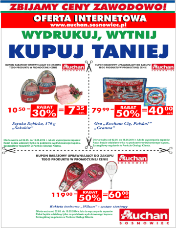 OFERTA INTERNETOWA KUPON RABATOWY UPRAWNIAJACY DO ZAKUPU TEGO PRODUKTU W PROMOCYJNEJ CENIE 10 50 - - 7 35 30% RABAT szt. Szynka Dębicka, 370 g „Sokołów” Oferta ważna od 02.05. do 18.05.2014 r. lub do wyczerpania zapasów Rabat będzie udzielany tylko na podstawie wydrukowanego kuponu. Szczegółowy regulamin w Punkcie Obsługi Klienta. ------------------------- www.auchan.sosnowiec.pl KUPON RABATOWY UPRAWNIAJACY DO ZAKUPU TEGO PRODUKTU W PROMOCYJNEJ CENIE 79 99 - - 40 00 50% RABAT szt. Gra „Kocham Cię, Polsko!” „Granna” Oferta ważna od 02.05. do 18.05.2014 r. lub do wyczerpania zapasów Rabat będzie udzielany tylko na podstawie wydrukowanego kuponu. Szczegółowy regulamin w Punkcie Obsługi Klienta. -----------------------------------------KUPON RABATOWY UPRAWNIAJACY DO ZAKUPU TEGO PRODUKTU W PROMOCYJNEJ CENIE 119 00 - - 60 00 50% RABAT szt. Rakieta tenisowa „Wilson” - zestaw startowy Oferta ważna od 02.05. do 18.05.2014 r. lub do wyczerpania zapasów Rabat będzie udzielany tylko na podstawie wydrukowanego kuponu. Szczegółowy regulamin w Punkcie Obsługi Klienta.