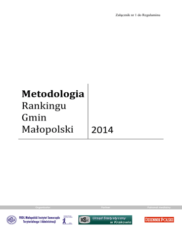 Załącznik nr 1 do Regulaminu Metodologia Rankingu Gmin Małopolski 2014 Organizator Partner Patronat medialny Metodologia Rankingu Gmin Małopolski 2014 WPROWADZENIE Metodologia Rankingu zaprezentowane Przedstawiono zostały w nim Gmin Małopolski główne założenia m.in. jest oraz szczegółowe dokumentem, sposób w tworzenia wyjaśnienia którym rankingu. dotyczące zakresu poszczególnych wskaźników oraz mechanizm wyliczania wskaźnika syntetycznego. ZAŁOŻENIA METODOLOGICZNE W analizach dotyczących poziomu rozwoju niezbędne jest porównywanie gmin i uporządkowanie ich w sposób liniowy ze względu na poziom badanego zjawiska jakościowego. Porównania gmin można dokonać uwzględniając dostępny zbiór zmiennych diagnostycznych charakteryzujących zmienną opisywaną, której nie można badać i oceniać wprost, niemożliwe jest bowiem bezpośrednie zmierzenie poziomu rozwoju. Do sumarycznego opisania tego złożonego zjawiska wykorzystuje się zwykle zmienne syntetyczne (taksonomiczne mierniki rozwoju). Dobór zmiennych diagnostycznych Podczas doboru zmiennych diagnostycznych ważne jest, by precyzyjnie określić kryterium syntetyczne. Zmienne służące do opisu badanego zagadnienia mogą wiązać się z nim bezpośrednio lub pośrednio. Związek bezpośredni polega na pomiarze konkretnego aspektu zjawiska (np. wykorzystanie nakładów inwestycyjnych do oszacowania poziomu rozwoju), zaś pośredni pozwala wyrazić szersze niemierzalne aspekty (np. wyniki sprawdzianów w szóstej klasie szkoły podstawowej oraz egzaminów gimnazjalnych). Zastosowana metoda doboru zmiennych diagnostycznych uwzględnia podejście merytoryczne. diagnostycznych Dzięki analizie opisujących merytorycznej poziom rozwoju uzyskano gmin w listę oparciu zmiennych o zasadę zrównoważonego rozwoju. Drugim kryterium doboru zmiennych była dostępność danych w bazach danych GUS lub możliwość ich pozyskania. Uwzględniając powyższy kontekst Ranking premiuje gminy o największym potencjale zarówno w sferze gospodarczej, jak i społecznej. Poniżej przedstawiono listę wskaźników dla opracowania Rankingu: 2 Metodologia Rankingu Gmin Małopolski 2014 1. Dochody własne gminy na 1 mieszkańca 2. Wydatki majątkowe inwestycyjne gminy na 1 mieszkańca 3. Wydatki gminy na administrację publiczną na 1 mieszkańca 4. Wydatki majątkowe inwestycyjne gminy na gospodarkę komunalną i ochronę środowiska na 1 mieszkańca 5. Środki z Unii Europejskiej i innych źródeł niepodlegające zwrotowi na finansowanie programów i projektów unijnych stanowiące dochód budżetów gmin na 1 mieszkańca 6. Ilość podmiotów gospodarczych zarejestrowanych w rejestrze REGON na 1000 ludności 7. Wyniki sprawdzianów w szóstej klasie szkoły podstawowej oraz egzaminów gimnazjalnych 8. Udział ludności w wieku produkcyjnym w ludności ogółem 9. Saldo migracji na 1000 ludności 10. Liczba czytelników bibliotek publicznych na 1000 ludności 11. Ilość udzielonych noclegów na 1000 ludności Zakres pojęciowy wskaźników Zakres pojęciowy wskaźników wybranych do sporządzenia Rankingu odpowiada terminologii statystyki publicznej. Dochody własne Dochodami własnymi jednostek samorządu terytorialnego są: udziały we wpływach z podatków centralnych (podatku dochodowego od osób fizycznych oraz z podatku dochodowego od osób prawnych), wpływy z podatków lokalnych, opłat, dochody majątkowe. Wydatki majątkowe inwestycyjne Wydatki majątkowe inwestycyjne stanowią jedną z dwóch kategorii wydatków majątkowych jednostek samorządowych – oprócz wydatków na zakup i objęcie akcji oraz wniesienia wkładów do spółek prawa handlowego. Obejmują wydatki inwestycyjne jednostek samorządowych oraz dotacje celowe na finansowanie lub dofinansowanie kosztów inwestycji realizowanych przez inne jednostki. Wydatki na administrację publiczną Administracja publiczna jest jednym z działów szczegółowej klasyfikacji dochodów, wydatków, przychodów i rozchodów oraz środków pochodzących ze źródeł 3 Metodologia Rankingu Gmin Małopolski 2014 zagranicznych. Obejmuje wydatki związane z bieżącą działalnością m.in.: rady gminy, urzędu gminy, organizacją wyborów czy też referendów. Wydatki majątkowe inwestycyjne na gospodarkę komunalną i ochronę środowiska Wydatki majątkowe inwestycyjne na gospodarkę komunalną i ochronę środowiska obejmują wydatki majątkowe inwestycyjne poniesione na budowę i modernizację infrastruktury komunalnej (m.in.: wytwarzanie i zaopatrywanie w energię elektryczną, budowę obiektów inżynierii lądowej i wodnej, wykonywanie instalacji elektrycznych, wodno-kanalizacyjnych i inne roboty budowlane) oraz związane z ochroną środowiska (m.in.: odprowadzanie i oczyszczanie ścieków, zbieranie i unieszkodliwiane odpadów, odzysk surowców). Środki z Unii Europejskiej i innych źródeł niepodlegające zwrotowi na finansowanie programów i projektów unijnych stanowiące dochód budżetów gmin Środki z Unii Europejskiej stanowią dochody jednostek samorządu terytorialnego. Według przyjętej metodologii zbierania danych przez GUS do kategorii Środki z Unii Europejskiej i innych źródeł niepodlegające zwrotowi na finansowanie programów i projektów unijnych zalicza się: Środki z Unii Europejskiej na finansowanie programów i projektów unijnych Środki z budżetu państwa lub inne przekazane jako współfinansowanie programów i projektów realizowanych z udziałem środków z funduszy Krajowym Rejestrze strukturalnych i Funduszu Spójności UE płatności z budżetu środków europejskich (od 1 stycznia 2011 r.) Podmioty gospodarcze zarejestrowane w rejestrze REGON Dane obejmują liczbę podmiotów zarejestrowanych w Urzędowym Podmiotów Gospodarki Narodowej REGON bez osób prowadzących gospodarstwa indywidualne w rolnictwie. Wyniki sprawdzianów w szóstej klasie szkoły podstawowej oraz egzaminów gimnazjalnych Dane pozyskane z Okręgowej 
