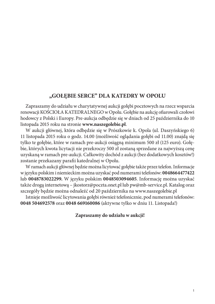 „GOŁĘBIE SERCE” DLA KATEDRY W OPOLU Zapraszamy do udziału w charytatywnej aukcji gołębi pocztowych na rzecz wsparcia renowacji KOŚCIOŁA KATEDRALNEGO w Opolu. Gołębie na aukcję ofiarowali czołowi hodowcy z Polski i Europy. Pre-aukcja odbędzie się w dniach od 25 października do 10 listopada 2015 roku na stronie www.naszegolebie.pl. W aukcji głównej, która odbędzie się w Prószkowie k. Opola (ul. Daszyńskiego 6) 11 listopada 2015 roku o godz. 14.00 (możliwość oglądania gołębi od 11.00) znajdą się tylko te gołębie, które w ramach pre-aukcji osiągną minimum 500 zł (125 euro). Gołębie, których kwota licytacji nie przekroczy 500 zł zostaną sprzedane za najwyższą cenę uzyskaną w ramach pre-aukcji. Całkowity dochód z aukcji (bez dodatkowych kosztów!) zostanie przekazany parafii katedralnej w Opolu. W ramach aukcji głównej będzie można licytować gołębie także przez telefon. Informacje w języku polskim i niemieckim można uzyskać pod numerami telefonów: 0048664477422 lub 0048783022299. W języku polskim 0048503094605. Informację można uzyskać także drogą internetową – [email protected] lub [email protected]. Katalog oraz szczegóły będzie można odnaleźć od 20 października na www.naszegolebie.pl Istnieje możliwość licytowania gołębi również telefonicznie, pod numerami telefonów: 0048 504692578 oraz 0048 669160086 (aktywne tylko w dniu 11. Listopada!) Zapraszamy do udziału w aukcji! 1 „Offene Herzen” für Die Kathedrale in Oppeln Wir laden herzlich zu Teilnahme an der caritativen Brieftaubenversteigerung zugunsten der Renovierung der Oppelner Kathedrale ein . Ihre Tauben dazu haben Topzüchter aus Polen und ganz Europa gespendet. Eine Pre-Auktion wird am dem 25. Oktober bis zum 10. November 2015 auf der Homepage www.naszegolebie.pl/katedra2015 stattfinden. In der Hauptauktion, die im Proszkow bei Oppeln ( Proszkow ul. Daszynskiego 6) am 11. November 2015 um 14.00 Uhr (Möglichkeit sich die Tauben anzuschauen ab 11.00 Uhr) stattfinden wird, werden nur die Tuben versteigert, die in der Pre-Auktion ein Mindestgebot von 500 PLN (125 Euro) erhalten werden. Tauben für die in der Pre -Auktion weniger als 500 PLN geboten wird, werden für das höchste Gebot verkauft. Der kompletter Erlös (ohne zusätzliche Kosten!) wird der Pfarrgemeinde der Kathedrale übergeben. Im Rahmen der Hauptauktion wird auch die Möglichkeit bestehen per Telefon mitzubieten. Informationen dazu auf Polnisch und Deutsch unter 0048 664477422 oder 0048 783022299. Auf Polnisch 0048 503094605. Mehr Informationen auch per E-Mail: [email protected] oder [email protected] . Den Katalog und Details dazu werden ab 20. Oktober 2015 unter www.naszegolebie.pl zu finden sein. Wir laden herzlich ein! „Soft heart” for the Cathedral in Opole We invite you to take part in a charitable auction of pigeons to support the renovation of the Cathedral Church in Opole. The pigeons to this auction were given by the breeders from Poland and Europe. The pre-auction is going to take place from 25th October to 10th November 2015 on the website www.naszegolebie.pl/katedra2015. In the main auction, that is going to take place in Prószków near to Opole ( Daszyńskiego street number 6) on 11th November at 2:00 o‘clock (the possibility to see the pigeons from 11:00 o‘clock) go only the pigeons that in the pre-auction will have reached at least 500 PLN (125euro). The pigeons that won‘t exceed 500 PLN will be sold for the highest reached price in the pre-auction . The total income from the aution (without extra costs) is going to be handed over to the cathedral parish in Opole. There will also be a possibility to bid pigeons on the phone during the main auction. The information in Polish and German can be received on these numbers: 0048664477422 or 0048783022299, in Polish 0048503094605, in English 0048795829832. The information can also be found on the Internet - [email protected] or [email protected]. The catalogue and the details will be available since 20th October 2015 on www.naszegolebie.pl. Take part in te auction!!! 2 3 Oppeln, den 3. Oktober 2015 Ein Herz für Oppelner Kathedrale In der Pfarrgemeinde Klucz, wo Josef Zylka, Landesseelsorger für die Taubenzüchter, als Pfarrer tätig ist, wurden drei neue bronzene Glocken feierlich gesegnet. Eine von diesen Glocken, die eine halbe Tonne wiegt und dem heiligen Franziskus gewidmet ist, wurde von den Taubenzüchtern gespendet, die einige von ihren wertvollen Vögeln für eine Versteigerung in Proskau b. Oppeln geschenkt haben. Sie zeigten dadurch ein großes Verständnis für die geistigen Werte und das Gotteshaus in einer kleinen Gemeinde. Diesmal möchten wir Sie, liebe Taubenzüchter, um die Unterstützung eines der bedeutendsten Gotteshäuser in Schlesien, der Heilig-Kreuz-Kathedrale in Oppeln, bitten. Jede Gesellschaft hat solche Orte, die eine bedeutende Rolle für sie spielen, die ihre Identität bestimmen und für ihre Geschichte, ihre Kultur und ihren Glauben von Bedeutung sind. Für die Stadt Oppeln ist eben die Heilig-Kreuz-Kirche, die zugleich die Kathedrale des Oppelner Bischofs ist, ein wichtiger Zeuge der tausendjährigen Kirchengeschichte der Stadt und der hier lebenden Menschen. Die Domkirche wird auch oft „Mutter aller Kirchen“ im Bistum genannt und sie ist es auch wirklich. Leider bedürfen der Innenraum und die Außenmauern einer dringenden, kostspieligen Renovierung und konservatorischer Maßnahmen, von denen sich die Gesamtkosten auf ca. 20 Millionen Zloty betragen. Deswegen wenden wir uns an Sie – liebe Taubenzüchter, die so zahlreich jedes Jahr zu Ihrer Wallfahrt nach Annaberg kommen – um Ihre Unterstützung des Projektes dieser schönen Kirche ihren ursprungliegen Glanz zurückzugeben. Jede gekaufte heute Wallfahrtsplakette ist zugleich ein Beitrag zugunsten der Renovierung des Oppelner Domes. Bei dieser Gelegenheit möchte ich mich sehr herzlich bei allen Taubenzüchtern bedanken,