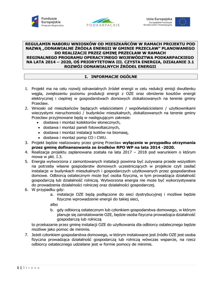 REGULAMIN NABORU WNIOSKÓW OD MIESZKAŃCÓW W RAMACH PROJEKTU POD NAZWĄ „ODNAWIALNE ŹRÓDŁA ENERGII W GMINIE PRZECŁAW” PLANOWANEGO DO REALIZACJI PRZEZ GMINĘ PRZECŁAW W RAMACH REGINALNEGO PROGRAMU OPERACYJNEGO WOJEWÓDZTWA PODKARPACKIEGO NA LATA 2014 – 2020, OŚ PRIORYTETOWA III. CZYSTA ENERGIA, DZIAŁANIE 3.1 ROZWÓJ ODNAWIALNYCH ŹRÓDEŁ ENERGII I. INFORMACJE OGÓLNE 1. Projekt ma na celu rozwój odnawialnych źródeł energii w celu redukcji emisji dwutlenku węgla, zwiększeniu poziomu produkcji energii z OZE oraz obniżenie kosztów energii elektrycznej i cieplnej w gospodarstwach domowych zlokalizowanych na terenie gminy Przecław. 2. Wnioski od mieszkańców będących właścicielami / współwłaścicielami / użytkownikami wieczystymi nieruchomości / budynków mieszkalnych, zlokalizowanych na terenie gminy Przecław przyjmowane będą w następującym zakresie: dostawa i montaż kolektorów słonecznych, dostawa i montaż paneli fotowoltaicznych, dostawa i montaż instalacji kotłów na biomasę, dostawa i montaż pomp CO i CWU. 3. Projekt będzie realizowany przez gminę Przecław wyłącznie w przypadku otrzymania przez gminę dofinansowania ze środków RPO WP na lata 2014 -2020. 4. Realizacja projektu zaplanowana została na lata 2017 – 2018 pod warunkiem o którym mowa w pkt. I.3. 5. Energia wytworzona z zamontowanych instalacji powinna być zużywana przede wszystkim na potrzeby własne gospodarstw domowych uczestniczących w projekcie czyli zasilać instalacje w budynkach mieszkalnych i gospodarczych użytkowanych przez gospodarstwa domowe. Odbiorcą ostatecznym może być osoba fizyczna, w tym prowadząca działalność gospodarczą lub działalność rolniczą. Wytworzona energia nie może być wykorzystywana do prowadzenia działalności rolniczej oraz działalności gospodarczej. 6. W przypadku gdy: a. instalacje OZE będą podłączone do sieci dystrybucyjnej i możliwe będzie fizyczne wprowadzenie energii do takiej sieci, albo b. gdy odbiorcą ostatecznym lub członkiem gospodarstwa domowego, w którym planuje się zainstalowanie OZE, będzie osoba fizyczna prowadząca działalność gospodarczą lub rolniczą to przekazanie przez gminę instalacji OZE do użytkowania dla odbiorcy ostatecznego będzie możliwe jako pomoc de minimis. 7. Jeżeli członkiem gospodarstwa domowego, w którym instalowane jest źródło OZE jest osoba fizyczna prowadząca działalność gospodarczą lub rolniczą wówczas wsparcie, na rzecz odbiorcy ostatecznego udzielane jest w formie pomocy de minimis. 1|Strona 8. Wykonanie instalacji możliwe jest również na budynkach nowobudowanych pod warunkiem złożenia oświadczenia, że budynek zostanie zasiedlony do 31 grudnia 2017 roku. 9. Projekt będzie współfinansowany ze środków pochodzących z Europejskiego Funduszu Rozwoju Regionalnego. Wysokość dofinansowania wyniesie do 70% kosztów kwalifikowanych (kosztów netto). 10. Wkład własny mieszkańców wyniesie 30% kosztów kwalifikowanych (kosztów netto) oraz podatek VAT od całej wartości urządzenia i kosztów instalacji (tj. 8% w przypadku montażu na budynku mieszkalnym lub 23% w przypadku innej lokalizacji urządzeń: na gruncie lub budynku gospodarczym). W przypadku wystąpienia w projekcie kosztów niekwalifikowanych uczestnik pokrywa również te koszty. Ostateczna decyzja co może stanowić wydatek kwalifikowany objęty dofinansowaniem uzależniona jest od Urzędu Marszałkowskiego Województwa Podkarpackiego. 11. W momencie odzyskania podatku VAT przez gminę Przecław podatek VAT zostanie zwrócony uczestnikom projektu. 12. Wszystkie zamontowane w ramach realizacji projektu instalacje przez okres nie krótszy niż 5 lat od zakończenia projektu tj. od dnia wypłaty ostatniej transzy dofinansowania, stanowić będą własność gminy Przecław i przez ten czas zostaną użyczone do bezpłatnego użytkowania właścicielom / współwłaścicielom / użytkownikom wieczystym nieruchomości. Po tym okresie zostaną przekazane uczestnikowi na własność. 13. Szczegółowe informacje dotyczące naboru wniosków od mieszkańców można uzyskać osobiście w Urzędzie Miejskim w Przecławiu, ul. Kilińskiego 7, 39-320 Przecław w pokoju nr 13 C, telefonicznie pod nr tel. 17/227 67 12, w godzinach pracy Urzędu Miejskiego w Przecławiu lub na stronie internetowej www.przeclaw.org . Pytania prosimy kierować również na adres e-mail: [email protected] i [email protected] . 14. Złożony kompletny wniosek zostanie zarejestrowany, a składający otrzyma potwierdzenie przyjęcia wniosku oraz numer ewidencyjny, którym identyfikowany będzie w trakcie realizacji projektu. 15. Wniosek niekompletny lub złożony po terminie pozostanie bez rozpatrzenia, o czym tut. urząd nie będzie informował. II. TERMIN I MIEJSCE SKŁADANIA WNIOSKÓW OD MIESZKAŃCÓW 1. Nabór wniosków prowadzony będzie w terminie od 7 listopada 2016 r. do 25 listopada 2016 r. w Urzędzie Miejskim w Przecławiu w pokoju Nr 13C w godzinach od 7:30 do 15:30. 2. Gmina Przecław zastrzega sobie prawo do wydłużenia okresu składania wniosków określonego w pkt. II.1. W takiej sytuacji jednak wszystkie Wnioski złożone po terminie naboru określonego w pkt. II.1 umieszczane będą na tzw. „Dodatkowej liście rezerwowej”. O wprowadzeniu danego wniosku z „Dodatkowej listy rezerwowej” na „Listę podstawową” decydować będzie weryfikacja tych wniosków prowadzona zgodnie z przyjętymi kryteriami punktowymi. Pierwszeństwo do umieszczenia wniosku na „Liście podstawowej” będą miały 2|Strona osoby, które znalazły się na „Liście rezerwowej” wniosków złożonych w terminie określonym w pkt. II.1. 3. O fakcie wydłużenia terminu składania wniosków mieszkańcy zostaną poinformowani przez stronę internetową www.przeclaw.org . III. UCZESTNICY PROJEKTU Uczestnikiem projektu 1. Osoby fizyczne zameldowane na terenie gminy Przecław, będące właścicielem, współwłaściciel