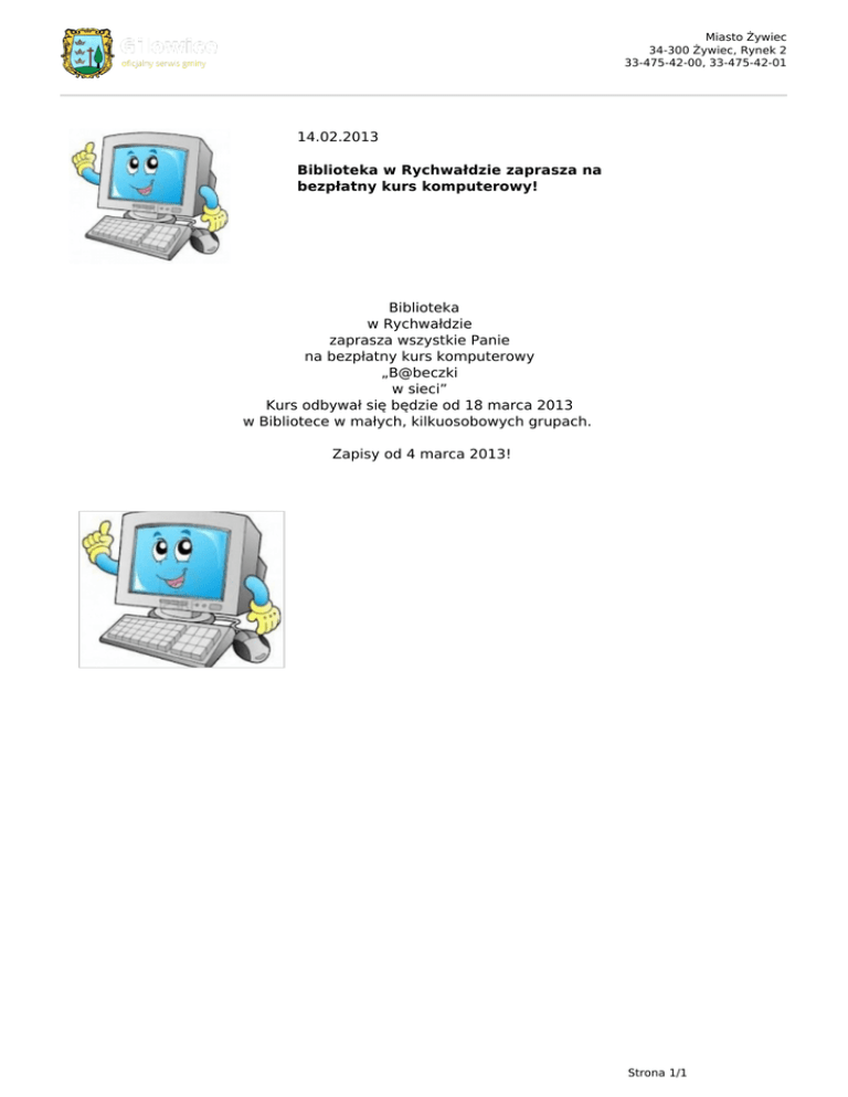 Miasto Żywiec 34-300 Żywiec, Rynek 2 33-475-42-00, 33-475-42-01 14.02.2013 Biblioteka w Rychwałdzie zaprasza na bezpłatny kurs komputerowy! Biblioteka w Rychwałdzie zaprasza wszystkie Panie na bezpłatny kurs komputerowy „B@beczki w sieci” Kurs odbywał się będzie od 18 marca 2013 w Bibliotece w małych, kilkuosobowych grupach. Zapisy od 4 marca 2013! Strona 1/1 Powered by TCPDF (www.tcpdf.org)