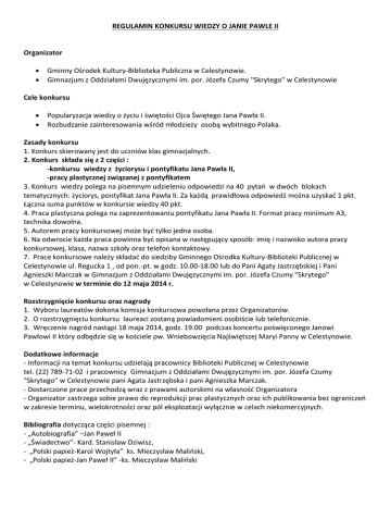 REGULAMIN KONKURSU WIEDZY O JANIE PAWLE II Organizator Gminny Ośrodek Kultury-Biblioteka Publiczna w Celestynowie. Gimnazjum z Oddziałami Dwujęzycznymi im. por. Józefa Czumy "Skrytego" w Celestynowie Cele konkursu Popularyzacja wiedzy o życiu i świętości Ojca Świętego Jana Pawła II. Rozbudzanie zainteresowania wśród młodzieży osobą wybitnego Polaka. Zasady konkursu 1. Konkurs skierowany jest do uczniów klas gimnazjalnych. 2. Konkurs składa się z 2 części : -konkursu wiedzy z życiorysu i pontyfikatu Jana Pawła II, -pracy plastycznej związanej z pontyfikatem 3. Konkurs wiedzy polega na pisemnym udzieleniu odpowiedzi na 40 pytań w dwóch blokach tematycznych: życiorys, pontyfikat Jana Pawła II. Za każdą prawidłowa odpowiedź można uzyskać 1 pkt. Łączna suma punktów w konkursie wiedzy 40 pkt. 4. Praca plastyczna polega na zaprezentowaniu pontyfikatu Jana Pawła II. Format pracy minimum A3, technika dowolna. 5. Autorem pracy konkursowej może być tylko jedna osoba. 6. Na odwrocie każda praca powinna być opisana w następujący sposób: imię i nazwisko autora pracy konkursowej, klasa, nazwa szkoły oraz telefon kontaktowy. 7. Prace konkursowe należy składać do siedziby Gminnego Ośrodka Kultury-Biblioteki Publicznej w Celestynowie ul. Regucka 1 , od pon.-pt. w godz. 10.00-18.00 lub do Pani Agaty Jastrzębskiej i Pani Agnieszki Marczak w Gimnazjum z Oddziałami Dwujęzycznymi im. por. Józefa Czumy "Skrytego" w Celestynowie w terminie do 12 maja 2014 r. Rozstrzygnięcie konkursu oraz nagrody 1. Wyboru laureatów dokona komisja konkursowa powołana przez Organizatorów. 2. O rozstrzygnięciu konkursu laureaci zostaną powiadomieni osobiście lub telefonicznie. 3. Wręczenie nagród nastąpi 18 maja 2014, godz. 19.00 podczas koncertu poświęconego Janowi Pawłowi II który odbędzie się w kościele pw. Wniebowzięcia Najświętszej Maryi Panny w Celestynowie. Dodatkowe informacje - Informacji na temat konkursu udzielają pracownicy Biblioteki Publicznej w Celestynowie tel. (22) 789-71-02 i pracownicy Gimnazjum z Oddziałami Dwujęzycznymi im. por. Józefa Czumy "Skrytego" w Celestynowie pani Agata Jastrzębska i pani Agnieszka Marczak. - Dostarczone prace przechodzą wraz z prawami autorskimi na własność Organizatora - Organizator zastrzega sobie prawo do reprodukcji prac plastycznych oraz ich publikowania bez ograniczeń w zakresie terminu, wielokrotności oraz pól eksploatacji wyłącznie w celach niekomercyjnych. Bibliografia dotycząca części pisemnej : - „Autobiografia” –Jan Paweł II - „Świadectwo”- Kard. Stanisław Dziwisz, - „Polski papież-Karol Wojtyła” ks. Mieczysław Maliński, - „Polski papież-Jan Paweł II” -ks. Mieczysław Maliński