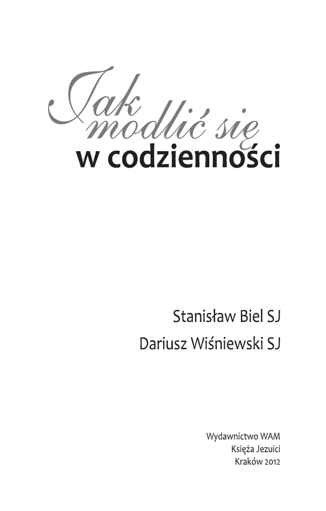 SPIS TREŚCI Wstęp . . . . . . . . . . . . . . . . . . . . . . . . . . . . . . . . . . . . . . . . . . . 5 I. FORMY MODLITWY (Dariusz Wiśniewski SJ) 1. Uwagi wstępne . . . . . . . . . . . . . . . . . . . . . . . . . . . . . . . . . 2. Modlitwa wspólnotowa – indywidualna . . . . . . . . . . . . . . . 3. Modlitwa chwilowa – stała . . . . . . . . . . . . . . . . . . . . . . . . 4. Eksperyment – rozwój . . . . . . . . . . . . . . . . . . . . . . . . . . . 5. Etapy modlitwy . . . . . . . . . . . . . . . . . . . . . . . . . . . . . . . . . 11 13 15 17 19 II. TRUDNOŚCI W MODLITWIE (Stanisław Biel SJ) 1. Obraz Boga a modlitwa . . . . . . . . . . . . . . . . . . . . . . . . . . 2. Dojrzała religijność . . . . . . . . . . . . . . . . . . . . . . . . . . . . . . 3. Kryzysy religijne . . . . . . . . . . . . . . . . . . . . . . . . . . . . . . . . 4. Potrzeba milczenia i samotności . . . . . . . . . . . . . . . . . . . . 5. Rozproszenia na modlitwie . . . . . . . . . . . . . . . . . . . . . . . . a. Rozproszenia zewnętrzne . . . . . . . . . . . . . . . . . . . . . . . b. Rozproszenia wewnętrzne . . . . . . . . . . . . . . . . . . . . . . c. Strapienia duchowe . . . . . . . . . . . . . . . . . . . . . . . . . . 29 33 36 39 42 42 44 45 III. PRAKTYKA MODLITWY W ŻYCIU CODZIENNYM (Stanisław Biel SJ) 1. Miejsce modlitwy w życiu codziennym . . . . . . . . . . . . . . . 53 2. Miejsce zewnętrzne i wewnętrzne . . . . . . . . . . . . . . . . . . . 56 99 3. Czas modlitwy. . . . . . . . . . . . . . . . . . . . . . . . . . . . . . . . . . 4. Postawy ciała na modlitwie . . . . . . . . . . . . . . . . . . . . . . . . 5. Kierownictwo duchowe. . . . . . . . . . . . . . . . . . . . . . . . . . . 6. Wierność modlitwie . . . . . . . . . . . . . . . . . . . . . . . . . . . . . 60 63 66 69 IV. MODLITWA IGNACJAŃSKA (Dariusz Wiśniewski SJ) 1. Rachunek sumienia . . . . . . . . . . . . . . . . . . . . . . . . . . . . . . a. Objaśnienia terminologiczne . . . . . . . . . . . . . . . . . . . . b. Przebieg rachunku sumienia . . . . . . . . . . . . . . . . . . . . 2. Medytacja (Dariusz Wiśniewski SJ) . . . . . . . . . . . . . . . . . . a. Przygotowanie . . . . . . . . . . . . . . . . . . . . . . . . . . . . . . . b. Przebieg medytacji. . . . . . . . . . . . . . . . . . . . . . . . . . . . c. Refleksja po medytacji . . . . . . . . . . . . . . . . . . . . . . . . . d. Czas . . . . . . . . . . . . . . . . . . . . . . . . . . . . . . . . . . . . . . e. Postawa ciała . . . . . . . . . . . . . . . . . . . . . . . . . . . . . . . . 3. Kontemplacja . . . . . . . . . . . . . . . . . . . . . . . . . . . . . . . . . . 77 77 79 84 84 85 90 90 91 92