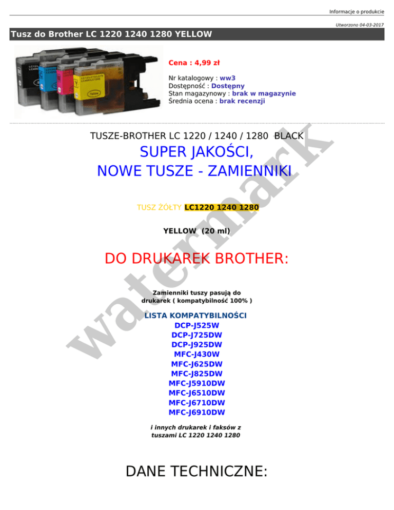 Informacje o produkcie Utworzono 04-03-2017 Tusz do Brother LC 1220 1240 1280 YELLOW Cena : 4,99 zł Nr katalogowy : ww3 Dostępność : Dostępny Stan magazynowy : brak w magazynie Średnia ocena : brak recenzji er m ar k TUSZE-BROTHER LC 1220 / 1240 / 1280 BLACK SUPER JAKOŚCI, NOWE TUSZE - ZAMIENNIKI TUSZ ŻÓŁTY LC1220 1240 1280 YELLOW (20 ml) DO DRUKAREK BROTHER: w at Zamienniki tuszy pasują do drukarek ( kompatybilność 100% ) LISTA KOMPATYBILNOŚCI DCP-J525W DCP-J725DW DCP-J925DW MFC-J430W MFC-J625DW MFC-J825DW MFC-J5910DW MFC-J6510DW MFC-J6710DW MFC-J6910DW i innych drukarek i faksów z tuszami LC 1220 1240 1280 DANE TECHNICZNE: ● ● ● ● ● ● ● ● er m ar k ● at ● Tusze są fabrycznie NOWE !, Obejmuje je pełna gwarancja na 2 LATA (24 miesiące), Oryginalnie zafoliowane, Gotowe do natychmiastowego użytkowania w drukarce, Doskonałej jakości wydruki - nie do odróżnienia z oryginałem, Posiadają certyfikat ISO 9001, ISO 9002, Testowane przez najnowocześniejsze laboratoria, Kompatybilne w 100% z wszystkimi drukarkami gdzie stosowane są te tusze Nie powodują zabrudzenia dysz, Pojemniki pakowane próżniowo, w ●
