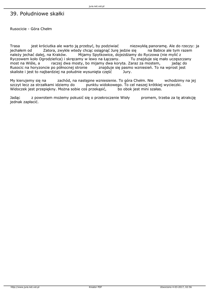 jura.net.vot.pl 39. Południowe skałki Rusocicie - Góra Chełm Trasa jest króciutka ale warto ją przebyć, by podziwiać niezwykłą panoramę. Ale do rzeczy: ja jechałem od Zatora, zwykle wtedy chcąc osiągnąć Jurę jedzie się na Babice ale tym razem należy jechać dalej, na Kraków. Mijamy Spytkowice, dojeżdżamy do Ryczowa (nie mylić z Ryczowem koło Ogrodzieńca) i skręcamy w lewo na Łączany. Tu znajduje się mało uczęszczany most na Wiśle, a raczej dwa mosty, bo mijamy dwa koryta. Zaraz za mostem, jadąc do Rusocic na horyzoncie po północnej stronie znajduje się pasmo wzniesień. To na wprost jest skaliste i jest to najbardziej na południe wysunięta część Jury. My kierujemy się na zachód, na następne wzniesienie. To góra Chełm. Nie wchodzimy na jej szczyt lecz za strzałkami idziemy do punktu widokowego. To cel naszej krótkiej wycieczki. Widoczek jest przepiękny. Można sobie coś przekąsić, bo obok jest mini szałas. Jadąc z powrotem możemy pokusić się o przekroczenie Wisły jednak zapłacić. http://www.jura.net.vot.pl Kreator PDF promem, trzeba za tę atrakcję Utworzono 4-03-2017, 02:56
