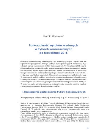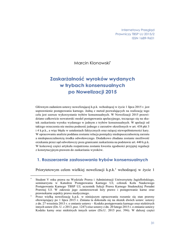 Internetowy Przegląd Prawniczy TBSP UJ 2015/2 ISSN 1689-9601 Marcin Klonowski* Zaskarżalność wyroków wydanych w trybach konsensualnych po Nowelizacji 2015 Głównym zadaniem ustawy nowelizującej k.p.k. wchodzącej w życie 1 lipca 2015 r. jest usprawnienie postępowania karnego. Jedną z metod pozwalających na realizację tego celu jest szersze wykorzystanie trybów konsensualnych. W Nowelizacji 2015 przewidziano całkowicie nowatorski model postępowania apelacyjnego, toczącego się na skutek zaskarżenia wyroku wydanego w jednym z trybów konsensualnych. W apelacji od takiego orzeczenia nie można podnosić jednego z zarzutów określonych w art. 438 pkt 3 i 4 k.p.k., a więc błędu w ustaleniach faktycznych oraz rażącej niewspółmierności kary. W opracowaniu analizie poddana zostanie relacja pomiędzy niedopuszczalnością zarzutu a niedopuszczalnością środka odwoławczego. Dodatkowo zbadana zostanie możliwość orzekania przez sąd odwoławczy poza granicami zaskarżenia na podstawie art. 440 k.p.k. W końcowej części artykułu rozpatrzona zostanie kwestia zgodności przyjętej regulacji z konstytucyjnym prawem do zaskarżania wyroków. 1. Rozszerzenie zastosowania trybów konsensualnych Priorytetowym celem wielkiej nowelizacji k.p.k.1 wchodzącej w życie 1 * 1 Student V roku prawa na Wydziale Prawa i Administracji Uniwersytetu Jagiellońskiego, seminarzysta w Katedrze Postępowania Karnego UJ, członek Koła Naukowego Postępowania Karnego TBSP UJ, uczestnik Sekcji Prawa Karnego Studenckiej Poradni Prawnej UJ. W zakresie jego zainteresowań leży prawo i postępowanie karne oraz prawnokarne aspekty prawa medycznego. Przez wielką nowelizację k.p.k. w niniejszym opracowaniu rozumie się stan prawny obowiązujący po 1 lipca 2015 r. Zmiana ta dokonała się na skutek dwóch ustaw: ustawy z dn. 27 września 2013 r. o zmianie ustawy – Kodeks postępowania karnego oraz niektórych innych ustaw (Dz. U. z 2013, poz. 1247) oraz ustawy z dn. 20 lutego 2015 r. o zmianie ustawy Kodeks karny oraz niektórych innych ustaw (Dz.U. 2015 poz. 396). W dalszej części 31 Internetowy Przegląd Prawniczy TBSP UJ 2015/2 „Nowelizacja postępowania karnego”, red. S. Pawelec lipca 2015 r., jest usprawnienie postępowania karnego. Jedną z metod pozwalających na zniwelowanie problemu nadmiernej przewlekłości procesu jest stworzenie ram prawnych do szerszego wykorzystywania porozumień karnoprocesowych. Modyfikacja ustawowej regulacji trybów konsensualnych w Nowelizacji 2015 dotyka dwóch zasadniczych aspektów: odformalizowania postępowania w przedmiocie wniosków składanych w tych trybach oraz rozszerzenia zakresu stosowania porozumień karnoprocesowych, także na sprawy o poważniejsze przestępstwa. Kluczowa zmiana ma miejsce również w uregulowaniu postępowania apelacyjnego, toczącego się na skutek zaskarżenia wyroku wydanego w jednym z trybów konsensualnych. Po nowelizacji uchylono związany z porozumieniami karnoprocesowymi art. 434 § 3 k.p.k. określający wyjątki od stosowania w postępowaniu apelacyjnym zakazu reformationis in peius w przypadku zaskarżenia wyroku zapadłego z zastosowaniem art. 343 k.p.k. lub art. 387 k.p.k. Regulacja ta, służąca ograniczeniu zaskarżalności wyroków wydanych na podstawie zawartych wcześniej porozumień procesowych, uznana została w pewnym zakresie za niezgodną z ustawą zasadniczą2. Nowa regulacja procesowa limitować ma zaskarżalność orzeczeń zapadłych po przeprowadzeniu trybów konsensualnych, już nie poprzez wpływanie na wolę strony za pomocą wyłączenia istotnych jej uprawnień w postępowaniu apelacyjnym (wyłączenie gwarancji zakazu reformationis in peius), ale poprzez zamknięcie możliwości podnoszenia niektórych zarzutów odwoławczych. W efekcie ukształtowany został bardzo nowatorski model postępowania odwoławczego. Apelacja od wyroków wydanych w trybach konsensualnych zawierać może tylko zarzuty uchybienia przepisom prawa materialnego bądź procesowego. Skarga odwoławcza strony nie może zawierać zarzutów opisanych w art. 438 pkt 3 i 4 k.p.k., a zatem strona nie może kwestionować ustaleń faktycznych ani uzgodnionej kary. Zanim analizie poddany zostanie problem zaskarżalności wyroków wydanych w trybach konsensualnych po Nowelizacji 2015, konieczne jest krótkie nakreślenie zmian, jakie zaszły w dwóch funkcjonujących na gruncie dawnego stanu prawnego trybach konsensualnych. W stosowaniu instytucji dobrowolnego poddania się karze omówione zostanie pewne novum w znaczący sposób 2 opracowania zakres zmian dokonany wskazanymi dwoma aktami prawnymi nazywany będzie „Nowelizacją 2015”. W przypadku, gdy konieczne będzie wykazanie różnic pomiędzy stanem prawnym wprowadzonym pierwszą i drugą nowelizacją, zostanie to wyraźnie wskazane. Wyrok Trybunału Konstytucyjnego z 28 kwietnia 2009 r., P 22/07, OTK-A 2009/4/55. 32 Internetowy Przegląd Prawniczy TBSP UJ 2015/2 „Nowelizacja postępowania karnego”, red. S. Pawelec modyfikujące stosowanie art. 387 k.p.k. w toku postępowania przygotowawczego. Wspominany art. 338a k.p.k. ze względu na zakres odmienności może być, z pewną ostrożnością, kwalifikowany jako trzeci tryb konsensualny. Jednym z głównych założeń Nowelizacji 2015 jest zmniejszenie przewlekłości procesu karnego poprzez zwiększenie dostępności orzekania w tzw. trybach konsensualnych. Już na gruncie stanu prawnego sprzed nowelizacji (zasadniczo od momentu gruntownej przebudowy porozumień karnoprocesowych w 2003 r.3) obserwowany był stały wzrost liczby spraw karnych kończonych w trybach konsensualnych, co przyczyniło się w znacznym stopniu do zwiększenia efektywności postępowania karnego. Po Nowelizacji 2015 zakres zastosowania trybów konsensualnych został w znaczny sposób rozszerzony. Pierwszym z trybów konsensualnych jest tryb skazania bez przeprowadzania rozprawy określony w art. 335 k.p.k. Stosowanie tego trybu ogranicz