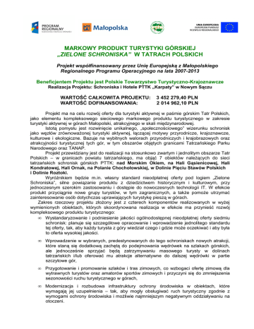 MARKOWY PRODUKT TURYSTYKI GÓRSKIEJ „ZIELONE SCHRONISKA” W TATRACH POLSKICH Projekt współfinansowany przez Unię Europejską z Małopolskiego Regionalnego Programu Operacyjnego na lata 2007-2013 Beneficjentem Projektu jest Polskie Towarzystwo Turystyczno-Krajoznawcze Realizacja Projektu: Schroniska i Hotele PTTK „Karpaty” w Nowym Sączu WARTOŚĆ CAŁKOWITA PROJEKTU: WARTOŚĆ DOFINANSOWANIA: 3 452 279,40 PLN 2 014 962,10 PLN Projekt ma na celu rozwój oferty dla turystyki aktywnej w paśmie górskim Tatr Polskich, jako elementu kompleksowego sieciowego markowego produktu turystycznego w zakresie turystyki aktywnej w górach Małopolski, atrakcyjnego w skali międzynarodowej. Istotą pomysłu jest rozwinięcie unikalnego, „społecznościowego” wizerunku schronisk jako węzłów zrównoważonej turystyki aktywnej, łączącej motywy przyrodnicze, krajoznawcze, kulturowe i ekologiczne. Bazuje na wybitnych walorach przyrodniczych i krajobrazowych oraz atrakcyjności turystycznej tych gór, w tym obszarów objętych granicami Tatrzańskiego Parku Narodowego oraz TANAP. Projekt przewidziany jest do realizacji na stosunkowo zwartym i jednolitym obszarze Tatr Polskich – w granicach powiatu tatrzańskiego, ma objąć 7 obiektów należących do sieci tatrzańskich schronisk górskich PTTK: nad Morskim Okiem, na Hali Gąsienicowej, Hali Kondratowej, Hali Ornak, na Polanie Chochołowskiej, w Dolinie Pięciu Stawów Polskich i Dolinie Roztoki. Wyróżnikiem będzie m.in. własny standard nieodpłatnej oferty pod logiem „Zielone Schroniska”, silne powiązanie produktu z dziedzictwem historycznym i kulturowym, przy jednoczesnym szerokim zastosowaniu i dostępie do nowoczesnych technologii IT. W efekcie produkt przyciągnie nowe grupy turystów, w tym zagranicznych, a także pomoże utrzymać zainteresowanie osób dotychczas uprawiających turystykę pieszą w górach. Zakres rzeczowy projektu złożony jest z czterech komponentów realizowanych w wyżej wymienionych obiektach, których skoordynowana realizacja w efekcie ma przynieść rozwój kompleksowego produktu turystycznego: • Wystandaryzowanie i podniesienie jakości ogólnodostępnej nieodpłatnej oferty siedmiu schronisk: planuje się szczegółowe opracowanie i wprowadzenie jednolitego standardu tej oferty, tak, aby każdy turysta z góry wiedział czego i gdzie może oczekiwać i aby była to oferta wysokiej jakości. • Wprowadzenie w wybranych, predestynowanych do tego schroniskach nowych atrakcji, które staną się dodatkową zachętą do podejmowania wędrówek na szlakach górskich, ale jednocześnie sprzyjać będą zatrzymywaniu masowego turysty w dolinach tatrzańskich i/lub oferować mu atrakcje alternatywne do dalszej wędrówki w partie szczytowe gór, • Przygotowanie i promowanie szlaków i tras zimowych, co wzbogaci ofertę zimową dla wytrawnych turystów oraz amatorów sportów zimowych i przyczyni się do zmniejszenia sezonowości ruchu turystycznego w górach, • Modernizacja i rozbudowa infrastruktury ochrony środowiska w obiektach, które wymagają jej uzupełnienia – tak, aby mogły obsługiwać ruch turystyczny zgodnie z wymogami ochrony środowiska i możliwie najmniejszym negatywnym oddziaływaniu na otoczeni.