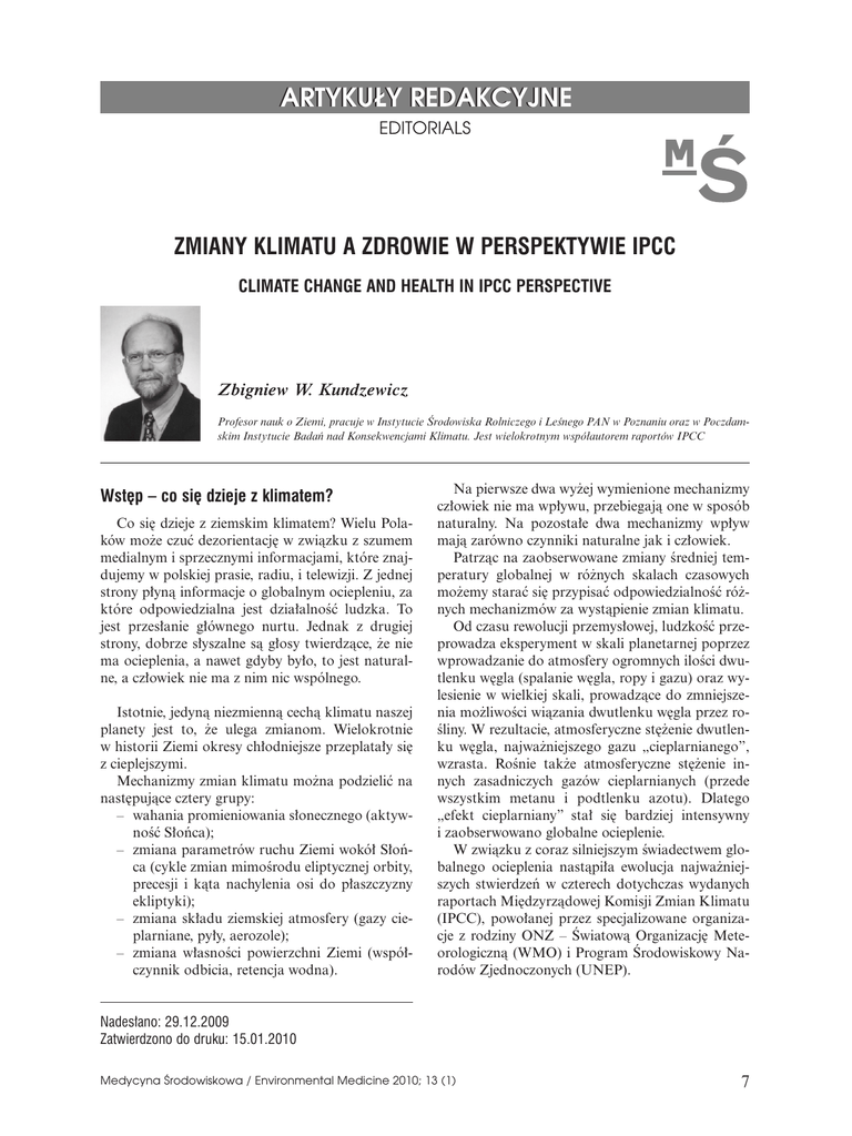 ARTYKU¸Y REDAKCYJNE EDITORIALS ZMIANY KLIMATU A ZDROWIE W PERSPEKTYWIE IPCC CLIMATE CHANGE AND HEALTH IN IPCC PERSPECTIVE Zbigniew W. Kundzewicz Profesor nauk o Ziemi, pracuje w Instytucie Ârodowiska Rolniczego i LeÊnego PAN w Poznaniu oraz w Poczdamskim Instytucie Badaƒ nad Konsekwencjami Klimatu. Jest wielokrotnym wspó∏autorem raportów IPCC Wst´p – co si´ dzieje z klimatem? Co si´ dzieje z ziemskim klimatem? Wielu Polaków mo˝e czuç dezorientacj´ w zwiàzku z szumem medialnym i sprzecznymi informacjami, które znajdujemy w polskiej prasie, radiu, i telewizji. Z jednej strony p∏ynà informacje o globalnym ociepleniu, za które odpowiedzialna jest dzia∏alnoÊç ludzka. To jest przes∏anie g∏ównego nurtu. Jednak z drugiej strony, dobrze s∏yszalne sà g∏osy twierdzàce, ˝e nie ma ocieplenia, a nawet gdyby by∏o, to jest naturalne, a cz∏owiek nie ma z nim nic wspólnego. Istotnie, jedynà niezmiennà cechà klimatu naszej planety jest to, ˝e ulega zmianom. Wielokrotnie w historii Ziemi okresy ch∏odniejsze przeplata∏y si´ z cieplejszymi. Mechanizmy zmian klimatu mo˝na podzieliç na nast´pujàce cztery grupy: – wahania promieniowania s∏onecznego (aktywnoÊç S∏oƒca); – zmiana parametrów ruchu Ziemi wokó∏ S∏oƒca (cykle zmian mimoÊrodu eliptycznej orbity, precesji i kàta nachylenia osi do p∏aszczyzny ekliptyki); – zmiana sk∏adu ziemskiej atmosfery (gazy cieplarniane, py∏y, aerozole); – zmiana w∏asnoÊci powierzchni Ziemi (wspó∏czynnik odbicia, retencja wodna). Na pierwsze dwa wy˝ej wymienione mechanizmy cz∏owiek nie ma wp∏ywu, przebiegajà one w sposób naturalny. Na pozosta∏e dwa mechanizmy wp∏yw majà zarówno czynniki naturalne jak i cz∏owiek. Patrzàc na zaobserwowane zmiany Êredniej temperatury globalnej w ró˝nych skalach czasowych mo˝emy staraç si´ przypisaç odpowiedzialnoÊç ró˝nych mechanizmów za wystàpienie zmian klimatu. Od czasu rewolucji przemys∏owej, ludzkoÊç przeprowadza eksperyment w skali planetarnej poprzez wprowadzanie do atmosfery ogromnych iloÊci dwutlenku w´gla (spalanie w´gla, ropy i gazu) oraz wylesienie w wielkiej skali, prowadzàce do zmniejszenia mo˝liwoÊci wiàzania dwutlenku w´gla przez roÊliny. W rezultacie, atmosferyczne st´˝enie dwutlenku w´gla, najwa˝niejszego gazu „cieplarnianego”, wzrasta. RoÊnie tak˝e atmosferyczne st´˝enie innych zasadniczych gazów cieplarnianych (przede wszystkim metanu i podtlenku azotu). Dlatego „efekt cieplarniany” sta∏ si´ bardziej intensywny i zaobserwowano globalne ocieplenie. W zwiàzku z coraz silniejszym Êwiadectwem globalnego ocieplenia nastàpi∏a ewolucja najwa˝niejszych stwierdzeƒ w czterech dotychczas wydanych raportach Mi´dzyrzàdowej Komisji Zmian Klimatu (IPCC), powo∏anej przez specjalizowane organizacje z rodziny ONZ – Âwiatowà Organizacj´ Meteorologicznà (WMO) i Program Ârodowiskowy Narodów Zjednoczonych (UNEP). Nades∏ano: 29.12.2009 Zatwierdzono do druku: 15.01.2010 Medycyna Ârodowiskowa / Environmental Medicine 2010; 13 (1) 7 I (1990): Cz∏owiek ma niewielki wp∏yw na klimat. II (1995): Cz∏owiek wywiera pewien odró˝nialny wp∏yw na klimat. III (2001): Ocieplenie zaobserwowane w ostatnim 50-leciu jest prawdopodobnie (oznacza to ponad 66% szans) spowodowane przede wszystkim wzrostem st´˝enia gazów cieplarnianych w atmosferze. IV (2007): Wzrost Êredniej temperatury globalnej od po∏owy XX wieku jest bardzo prawdopodobnie (oznacza to ponad 90% szans) spowodowany wywo∏anym przez cz∏owieka wzrostem st´˝enia gazów cieplarnianych. Zmiany klimatu – obserwacje, projekcje i interpretacja Nie ulega wàtpliwoÊci, ˝e klimat ziemski ociepla si´. Rycina 1 przedstawia zmiany Êredniej temperatury globalnej. Na wyraênà tendencj´ wzrostowà temperatury nak∏adajà si´ silne wahania – w gór´ i w dó∏ – temperatura globalna w konkretnym roku uk∏ada si´ czasem nieco pod (jak w roku 1996), a czasem mocno nad (jak w roku 1998) linià trendu. Oprócz skali globalnej, klimat ociepla si´ we wszystkich skalach przestrzennych, choç ocieplenie nie ma jednostajnego tempa. Odchylenie temperatury globalnej od Êredniej z 1961–1990 Temperatura globalna 0.6 14.6 0.4 14.4 0.2 14.2 – 0.0 14.0 –0.2 13.8 –0.4 13.6 –0.6 13.4 –0.8 13.2 1860 1880 1900 1920 1940 1960 1980 2000 Lata Rycina 1. Trendy wzrostowe temperatury globalnej. Kropki przedstawiajà wartoÊci Êrednie roczne temperatury globalnej, ciemniejsza krzywa – szereg wyg∏adzony, a jaÊniejsza krzywa – granice b∏´dów 5–95%. OÊ pionowa lewa pokazuje anomali´ temperatury globalnej (w °C) w porównaniu z okresem 1961–1990, a oÊ pionowa prawa – oszacowanie Êredniej temperatury globalnej (w °C). èród∏o: Trenberth i in. (2007). Âwiadectwa ocieplenia dostarczajà wyniki pomiarów temperatury prowadzone na dziesiàtkach tysi´cy stacji obserwacyjnych. Jak pokazuje rys. 1, przez ostatnie 150 lat Êrednie tempo ocieplenia globalnego wynosi∏o 0,045 °C na dekad´, w ciàgu ostatnich 100 lat 0,074, w ostatnich 50 latach by∏o jeszcze silniejsze (0,128), a w ciàgu ostatnich 25 lat 0,177 °C na dekad´. Temperatura roÊnie wi´c coraz szybciej – Êrednie tempo ocieplenia w ciàgu ostatnich 25 lat by∏o niemal czterokrotnie wy˝sze ni˝ Êrednio w ostatnich 150 latach. Ka˝dy kolejny rok z ostatniego dwudziestolecia wpisuje si´ w obraz cieplejszego Êwiata – Êrednia temperatura globalna ka˝dego roku zdecydowanie 8 przewy˝sza Êrednià z dowolnego 30-lecia sprzed 1990. Dziesi´ciolecie 1998–2007 jest zdecydowanie najcieplejsze w historii globalnych obserwacji temperatury, odtworzonej (zob. Brohan i in., 2006) od 1850. Na pó∏kuli pó∏nocnej, gdzie przebieg temperatury w przesz∏oÊci mo˝na zrekonstruowaç dzi´ki tzw. paleoarchiwom, ostatnie dwudziestolecie, pi´çdziesi´ciolecie i ca∏y XX wiek by∏y najcieplejsze w drugim millennium. Wed∏ug danych globalnych, zbieranych