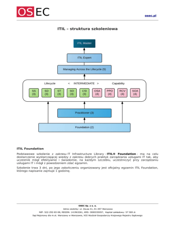 osec.pl ITIL – struktura szkoleniowa ITIL Foundation Podstawowe szkolenie z zakresu IT Infrastructure Library - ITIL® Foundation - ma na celu dostarczenie wystarczającej wiedzy z zakresu dobrych praktyk zarządzania usługami IT tak, aby uczestnik mógł efektywnie i świadomie, na każdym szczeblu, uczestniczyć przy zarządzaniu usługami IT i mógł z powodzeniem zdać egzamin. Szkolenie trwa 3 dni, po jego zakończeniu organizowany jest oficjalny egzamin ITIL Foundation, którego napisanie zajmuje 1 godzinę. OSEC Sp. z o. o. Adres siedziby: ul. Zeusa 41, 01-497 Warszawa NIP: 522-292-83-08, REGON: 141963261, KRS: 0000335057, Kapitał zakładowy: 57 500 zł. Sąd Rejonowy dla m.st. Warszawy w Warszawie, XIII Wydział Gospodarczy Krajowego Rejestru Sądowego osec.pl ITIL Practitioner ITIL Practitioner jest zaprojektowany jako pomost między szkoleniem ITIL Foundation, a szkoleniami ITIL Intermediate (nie zastępuje istniejącego schematu kwalifikacji ITIL). ITIL Intermediate Szkolenia ITIL® Intermediate to praktyczne warsztaty uzupełniające i poszerzające wiedzę z określonych obszarów zarządzania usługami IT i ITIL. Warunkiem uczestnictwa w szkoleniach poziomu Intermediate jest posiadanie certyfikatu „ITIL Foundation”. Szkolenia na poziomie Intermediate są podzielone na dwa obszary: •Lifecycle Stream, •Capability Stream. Lifecycle Stream Grupa Lifecycle Stream obejmuje pięć szkoleń kończących się egzaminami. Każde szkolenie z obszaru Lifecycle odpowiada jednemu z pięciu etapów cyklu życia usługi. Podczas szkolenia, uczestnicy zapoznają się z kluczowymi elementami etapu oraz realizowanymi procesami z punktu widzenie właścicieli procesów, czyli z wysokiego poziomu zarządzania. Uczestnicy szkolenia zapoznają się z kluczowymi korzyściami biznesowymi, elementami wejściowymi i wyjściowymi procesów, jak również zagrożeniami i krytycznymi czynnikami sukcesu oraz kluczowymi wskaźnikami wydajności. Podczas szkolenia wykonywane są praktyczne ćwiczenia, które zajmują około 20% czasu szkolenia. Każde ze szkoleń trwa 3 dni i kończy się formalnym egzaminem pozwalającym uzyskać międzynarodowy certyfikat z danego obszaru. Grupa szkoleń Lifecycle Stream jest przeznaczona dla osób, które chcą uzyskać wiedzę dotyczącą dobrych praktyk ITIL w kontekście cyklu życia usługi. Główne obszary to: •cykl życia usług IT, •wykorzystanie procesów i elementów dobrych praktyk w cyklu życia usługi, •możliwości (zdolności, potencjał) zarządzania niezbędne do realizacji dobrych praktyk Zarządzania Usługami IT w organizacji. Każdy certyfikat ITIL Intermediate z obszaru Lifecycle Stream daje 3 punkty na ścieżce do uzyskania certyfikatu ITL® Expert. Szkolenia w ścieżce Lifecycle: •SS - Service Strategy •SD - Service Design •ST - Service Transition •SO - Service Operation •CSI - Continual Service Improvement OSEC Sp. z o. o. Adres siedziby: ul. Zeusa 41, 01-497 Warszawa NIP: 522-292-83-08, REGON: 141963261, KRS: 0000335057, Kapitał zakładowy: 57 500 zł. Sąd Rejonowy dla m.st. Warszawy w Warszawie, XIII Wydział Gospodarczy Krajowego Rejestru Sądowego osec.pl Capability Stream Grupa Capability Stream obejmuje cztery szkolenia, które łączą procesy zarządzania usługami IT w logicznie powiązane obszary. Podczas szkolenia istnieje możliwość szczegółowego zapoznania się z rekomendacjami dobrych praktyk ITIL®, ponadto wykonywanych jest wiele praktycznych ćwiczeń, które pozwalają zapoznać się i opanować techniki wdrażania i zarządzania procesami IT. Ćwiczenia zajmują około 50% czasu szkolenia. Każde ze szkoleń trwa 5 dni i kończy się formalnym egzaminem pozwalającym uzyskać międzynarodowy certyfikat z danego obszaru. Grupa szkoleń Capability Stream jest przeznaczona dla osób, które chcą uzyskać wiedzę dotyczącą procesów i ról. Cykl życia usługi jest elementem programu nauczania, ale kluczowe obszary to: •działania procesów, •realizacja i wykorzystanie procesów w całym cyklu życia usługi. Każdy certyfikat ITIL Intermediate z obszaru Capability Stream daje 4 punkty na ścieżce do uzyskania certyfikatu ITIL® Expert. Szkolenia w ścieżce Capability: •OSA - Operational Support & Analysis •PPO - Planning Protection & Optimization •RCV - Release, Control & Validation •SOA - Service Offerings & Agreements Egzaminy na poziomie Intermediate Egzaminy na poziomie Intermediate przeprowadzane są w formie testu. Każdy egzamin zawiera 8 pytań, każde pytanie odnosi się do scenariusza. Do każdego pytania można wybrać jedną z czterech odpowiedzi: •za wybranie odpowiedzi poprawnej uzyskuje się 5 punktów, •za wybranie odpowiedzi częściowo prawidłowej uzyskuje się 3 punkty, •za wybranie odpowiedzi najmniej poprawnej uzyskuje się 1 punkt, •za wybranie odpowiedzi niepoprawnej nie otrzymuje żadnych punktów. Egzamin trwa 90 minut i jest przeprowadzany w języku angielskim. Dla osób zdających egzamin w języku innym niż ojczysty istnieje możliwość korzystania ze słownika i wydłużenie czasu trwania egzaminu do 120 minut. Do uzyskania pozytywnego wyniku egzaminu konieczne jest zdobycie co najmniej 70% punktów (co najmniej 28 z 40 możliwych punktów). ITIL Expert Końcowym szkoleniem na poziomie Intermediate, niezbędnym do uzyskania tytułu ITIL Expert, jest Managing Across the Lifecycle (MALC). Szkolenie jest zakończone stosownym egzaminem, dającym ostatnie 5 punktów na ścieżce ITIL Expert. Aby uzyskać tytuł ITIL Expert, należy zebrać 22 punkty, przy czym 2 punkty z egzaminu ITIL Foundation, 5 punktów z MALC, a pozostałe z dowolnych szkoleń Intermediate. OSEC Sp. z o. o. Adres siedziby: ul. Zeusa 41, 01-497 Warszawa NIP: 522-292-83-08, REGON: 141963261, KRS: 0000335057, Kapitał zakładowy: 57 500 zł. Sąd Rejonowy dla m.st. Warszawy w Warszawie, XIII Wydział Gospodarczy Krajowego Rejestru Sądowego