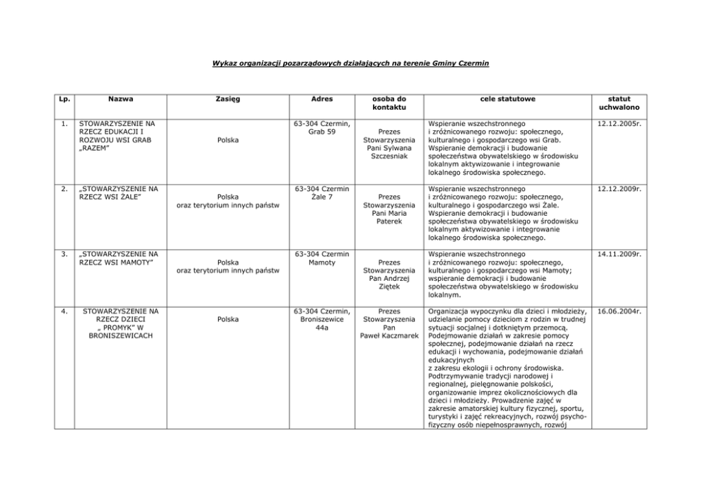 Wykaz organizacji pozarządowych działających na terenie Gminy Czermin Lp. 1. 2. 3. 4. Nazwa STOWARZYSZENIE NA RZECZ EDUKACJI I ROZWOJU WSI GRAB „RAZEM” „STOWARZYSZENIE NA RZECZ WSI ŻALE” „STOWARZYSZENIE NA RZECZ WSI MAMOTY” STOWARZYSZENIE NA RZECZ DZIECI „ PROMYK” W BRONISZEWICACH Zasięg Adres 63-304 Czermin, Grab 59 Polska Polska oraz terytorium innych państw Polska oraz terytorium innych państw Polska 63-304 Czermin Żale 7 63-304 Czermin Mamoty 63-304 Czermin, Broniszewice 44a osoba do kontaktu Prezes Stowarzyszenia Pani Sylwana Szczesniak Prezes Stowarzyszenia Pani Maria Paterek Prezes Stowarzyszenia Pan Andrzej Ziętek Prezes Stowarzyszenia Pan Paweł Kaczmarek cele statutowe statut uchwalono Wspieranie wszechstronnego i zróżnicowanego rozwoju: społecznego, kulturalnego i gospodarczego wsi Grab. Wspieranie demokracji i budowanie społeczeństwa obywatelskiego w środowisku lokalnym aktywizowanie i integrowanie lokalnego środowiska społecznego. 12.12.2005r. Wspieranie wszechstronnego i zróżnicowanego rozwoju: społecznego, kulturalnego i gospodarczego wsi Żale. Wspieranie demokracji i budowanie społeczeństwa obywatelskiego w środowisku lokalnym aktywizowanie i integrowanie lokalnego środowiska społecznego. 12.12.2009r. Wspieranie wszechstronnego i zróżnicowanego rozwoju: społecznego, kulturalnego i gospodarczego wsi Mamoty; wspieranie demokracji i budowanie społeczeństwa obywatelskiego w środowisku lokalnym. 14.11.2009r. Organizacja wypoczynku dla dzieci i młodzieży, udzielanie pomocy dzieciom z rodzin w trudnej sytuacji socjalnej i dotkniętym przemocą. Podejmowanie działań w zakresie pomocy społecznej, podejmowanie działań na rzecz edukacji i wychowania, podejmowanie działań edukacyjnych z zakresu ekologii i ochrony środowiska. Podtrzymywanie tradycji narodowej i regionalnej, pielęgnowanie polskości, organizowanie imprez okolicznościowych dla dzieci i młodzieży. Prowadzenie zajęć w zakresie amatorskiej kultury fizycznej, sportu, turystyki i zajęć rekreacyjnych, rozwój psychofizyczny osób niepełnosprawnych, rozwój 16.06.2004r. 5. 6. 7. STOWARZYSZENIE NA RZECZ DZIECI IM. JANA PAWŁA II Polska STOWARZYSZENIE NA RZECZ ROZWOJU WSI PIERUCHY „ NASZA WIEŚ” Polska oraz terytoria innych państw STOWARZYSZENIE NA RZECZ ROZWOJU SPORTU GMINY CZERMIN „ TRZY DO ZERA: Polska 63-304 Czermin, Czermin 2b Prezes Stowarzyszenia Pan Mariusz Mańczak 63-304 Czermin, Pieruchy Prezes Stowarzyszenia Pani Maria RogowiczŁukomska 63-304 Czermin, Czermin 47 Prezes Stowarzyszenia Pan Krzysztof Marciniak przedsiębiorczości, ochrona i promocja zdrowia. Współpraca z lokalnymi organizacjami i grupami społecznymi, przeciwdziałanie wykluczeniu społecznemu i aktywizacja społeczna dzieci i młodzieży. Organizacja wypoczynku dla dzieci z terenu objętego terenem działania Stowarzyszenia, udzielanie pomocy dzieciom pochodzącym z rodzin znajdujących się w ciężkiej sytuacji materialnej. Organizowanie imprez okolicznościowych dla dzieci, organizowanie czasu wolnego poprzez sport i edukację, prowadzenie zajęć w zakresie amatorskiej kultury fizycznej, organizowanie imprez integracyjnych z dziećmi niepełnosprawnymi. Realizacja programów ekologicznych, podtrzymywanie tradycji narodowej i regionalnej. Wspieranie wszechstronnego i zróżnicowanego rozwoju: społecznego, kulturalnego i gospodarczego wsi Pieruchy. Wspieranie demokracji i budowanie społeczeństwa obywatelskiego w środowisku lokalnym, aktywizowanie i integrowanie lokalnego środowiska społecznego. Upowszechnianie kultury fizycznej i sportu wśród mieszkańców Gminy Czermin, krajoznawstwo oraz wypoczynek dzieci i młodzieży. Organizacja zajęć sportowych dla dzieci i młodzieży oraz osób niepełnosprawnych ,upowszechnianie zasad udzielania pierwszej pomocy pourazowej i powypadkowej. Promowanie i propagowanie postaw obywatelskich, promowanie porządku i bezpieczeństwa publicznego oraz przeciwdziałanie patologiom społecznym poprzez sport, działalność kulturalna, działalność wspomagająca rozwój wspólnot i społeczności lokalnych, działalność dydaktyczna w tym doskonalenie kadr, działalność na rzecz integracji europejskiej oraz rozwijania kontaktów i współpracy z 03.12.1998r. 17.10.2009r. 22.12.2011r. 8. STOWARZYSZENIE WSPÓLNIE DLA PRZYSZŁOŚCI Polska oraz poza jej granicami Czermin 47, 63304 Czermin Prezes Stowarzyszenia Pan Sławomir Spychaj innymi organizacjami o podobnym charakterze działającymi w kraju i za granicą. Opracowanie Zintegrowanej Strategii Rozwoju Obszarów Wiejskich ( ZSROW) dla obszaru Gmin: Chocz, Czermin, Dobrzyca, Gizałaki, Gołuchów i Pleszew. Promocja obszarów wiejskich położonych w gminach o których mowa . Aktywizacja mieszkańców i partnerów sektora publicznego, prywatnego i pozarządowego do udziału w realizacji celów Stowarzyszenia, skupianie wokół idei Stowarzyszenia osób zainteresowanych rozwojem gmin, o których mowa w pkt a i regionem. Ochrona oraz promocja środowiska naturalnego, krajobrazu i zasobów historyczno– kulturowych, rozwój turystyki, sportu i rekreacji. Upowszechnianie i propagowanie lokalnych tradycji, zwyczajów, kultury i sztuki. Wspieranie tworzenia nowych miejsc pracy poza rolnictwem, produkcja i popularyzacja produktów regionalnych, budowa, modernizacja oraz wyposażanie obiektów użyteczności publicznej, kultu religijnego, zabytkowych, atrakcji turystycznych i innych istotnych ze względów rozwoju społeczno – gospodarczego. Działanie na rzecz zrównoważonego rozwoju obszarów wiejskich. Aktywizowanie ludności wiejskiej, prowadzenie 10.05.2006r. innych działań przewidzianych dla LGD w przepisach Programu Rozwoju Obszarów Wiejskich. 9. Ochotnicza Straż Pożarna w Czerminie Miejscowość będąca siedzibą, miejscowości położone w gminie oraz w rejonie pomocy wzajemnej, Stowarzyszenie OSP jest członkiem Związku Ochotniczych Straży Pożarnych Rzeczypospolitej P