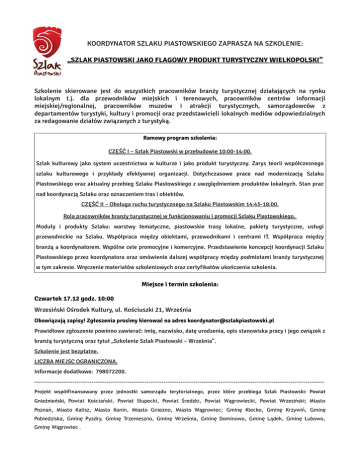 KOORDYNATOR SZLAKU PIASTOWSKIEGO ZAPRASZA NA SZKOLENIE: „SZLAK PIASTOWSKI JAKO FLAGOWY PRODUKT TURYSTYCZNY WIELKOPOLSKI” Szkolenie skierowane jest do wszystkich pracowników branży turystycznej działających na rynku lokalnym t.j. dla przewodników miejskich i terenowych, pracowników centrów informacji miejskiej/regionalnej, pracowników muzeów i atrakcji turystycznych, samorządowców z departamentów turystyki, kultury i promocji oraz przedstawicieli lokalnych mediów odpowiedzialnych za redagowanie działów związanych z turystyką. Ramowy program szkolenia: CZĘŚĆ I – Szlak Piastowski w przebudowie 10:00-14:00. Szlak kulturowy jako system uczestnictwa w kulturze i jako produkt turystyczny. Zarys teorii współczesnego szlaku kulturowego i przykłady efektywnej organizacji. Dotychczasowe prace nad modernizacją Szlaku Piastowskiego oraz aktualny przebieg Szlaku Piastowskiego z uwzględnieniem produktów lokalnych. Stan prac nad koordynacją Szlaku oraz oznaczeniem tras i obiektów. CZĘŚĆ II – Obsługa ruchu turystycznego na Szlaku Piastowskim 14:45-18:00. Rola pracowników branży turystycznej w funkcjonowaniu i promocji Szlaku Piastowskiego. Moduły i produkty Szlaku: warstwy tematyczne, piastowskie trasy lokalne, pakiety turystyczne, usługi przewodnickie na Szlaku. Współpraca między obiektami, przewodnikami i centrami IT. Współpraca między branżą a koordynatorem. Wspólne cele promocyjne i komercyjne. Przedstawienie koncepcji koordynacji Szlaku Piastowskiego przez koordynatora oraz omówienie dalszej współpracy między podmiotami branży turystycznej w tym zakresie. Wręczenie materiałów szkoleniowych oraz certyfikatów ukończenia szkolenia. Miejsce i termin szkolenia: Czwartek 17.12 godz. 10:00 Wrzesiński Ośrodek Kultury, ul. Kościuszki 21, Września Obowiązują zapisy! Zgłoszenia prosimy kierować na adres [email protected] Prawidłowe zgłoszenie powinno zawierać: imię, nazwisko, datę urodzenia, opis stanowiska pracy i jego związek z branżą turystyczną oraz tytuł „Szkolenie Szlak Piastowski – Września”. Szkolenie jest bezpłatne. LICZBA MIEJSC OGRANICZONA. Informacje dodatkowe: 798072200. ----------------------------------------------------------------------------------------------------------------------------------------Projekt współfinansowany przez jednostki samorządu terytorialnego, przez które przebiega Szlak Piastowski: Powiat Gnieźnieński, Powiat Kościański, Powiat Słupecki, Powiat Średzki, Powiat Wągrowiecki, Powiat Wrzesiński; Miasto Poznań, Miasto Kalisz, Miasto Konin, Miasto Gniezno, Miasto Wągrowiec; Gminę Kłecko, Gminę Krzywiń, Gminę Pobiedziska, Gminę Pyzdry, Gminę Trzemeszno, Gminę Września, Gminę Dominowo, Gminę Lądek, Gminę Łubowo, Gminę Wągrowiec .