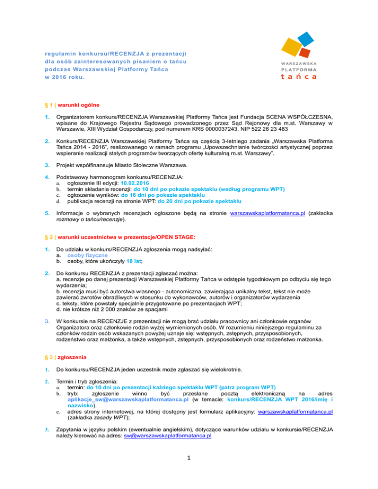 regulamin konkursu/RECENZJA z prezentacji dla osób zainteresow anych pisaniem o tańcu podczas Warszaw skiej Platform y Tańca w 2016 roku. § 1 | warunki ogólne 1. Organizatorem konkurs/RECENZJA Warszawskiej Platformy Tańca jest Fundacja SCENA WSPÓŁCZESNA, wpisane do Krajowego Rejestru Sądowego prowadzonego przez Sąd Rejonowy dla m.st. Warszawy w Warszawie, XIII Wydział Gospodarczy, pod numerem KRS 0000037243, NIP 522 26 23 483 2. Konkurs/RECENZJA Warszawskiej Platformy Tańca są częścią 3-letniego zadania „Warszawska Platforma Tańca 2014 - 2016”, realizowanego w ramach programu „Upowszechnianie twórczości artystycznej poprzez wspieranie realizacji stałych programów tworzących ofertę kulturalną m.st. Warszawy”. 3. Projekt współfinansuje Miasto Stołeczne Warszawa. 4. Podstawowy harmonogram konkursu/RECENZJA: a. ogłoszenie III edycji: 10.02.2016 b. termin składania recenzji: do 10 dni po pokazie spektaklu (według programu WPT) c. ogłoszenie wyników: do 16 dni po pokazie spektaklu d. publikacja recenzji na stronie WPT: do 20 dni po pokazie spektaklu 5. Informacje o wybranych recenzjach ogłoszone będą na stronie warszawskaplatformatanca.pl (zakładka rozmowy o tańcu/recenzje). § 2 | warunki uczestnictwa w prezentacje/OPEN STAGE: 1. Do udziału w konkurs/RECENZJA zgłoszenia mogą nadsyłać: a. osoby fizyczne b. osoby, które ukończyły 18 lat; 2. Do konkursu RECENZJA z prezentacji zgłaszać można: a. recenzje po danej prezentacji Warszawskiej Platformy Tańca w odstępie tygodniowym po odbyciu się tego wydarzenia; b. recenzja musi być autorstwa własnego - autonomiczna, zawierająca unikalny tekst, tekst nie może zawierać zwrotów obraźliwych w stosunku do wykonawców, autorów i organizatorów wydarzenia c. teksty, które powstały specjalnie przygotowane po prezentacjach WPT; d. nie krótsze niż 2 000 znaków ze spacjami 3. W konkursie na RECENZJE z prezentacji nie mogą brać udziału pracownicy ani członkowie organów Organizatora oraz członkowie rodzin wyżej wymienionych osób. W rozumieniu niniejszego regulaminu za członków rodzin osób wskazanych powyżej uznaje się: wstępnych, zstępnych, przysposobionych, rodzeństwo oraz małżonka, a także wstępnych, zstępnych, przysposobionych oraz rodzeństwo małżonka. § 3 | zgłoszenia 1. Do konkursu/RECENZJA jeden uczestnik może zgłaszać się wielokrotnie. 2. Termin i tryb zgłoszenia: a. termin: do 10 dni po prezentacji każdego spektaklu WPT (patrz program WPT) b. tryb: zgłoszenie winno być przesłane pocztą elektroniczną na adres [email protected] (w temacie: konkurs/RECENZJA WPT 2016/imię i nazwisko). c. adres strony internetowej, na której dostępny jest formularz aplikacyjny: warszawskaplatformatanca.pl (zakładka zasady WPT); 3. Zapytania w języku polskim (ewentualnie angielskim), dotyczące warunków udziału w konkursie/RECENZJA należy kierować na adres: [email protected] 1 4. Wymagane elementy zgłoszenia: a. zgłoszenie według załączonego wzoru (załącznik nr 4 - Formularz_aplikacyjny_recenzje) b. czytelny skan strony z podpisanymi przez zgłaszającą się osobę oświadczeniami (załącznik nr 2 Oświadczenia); c. 1 zdjęcia recenzenta w rozdzielczości co najmniej 300 dpi d. plik w formacie Word lub równoważnym edytowalnym zawierający krótką notkę biograficzną osoby/zespołu realizującego prezentację (max. 1 000 znaków). 5. Nie będą rozpatrywane zgłoszenia a. zawierające uchybienia (braki) formalne, gdzie za braki formalne uważane jest: brak wymaganych załączników, nieprawidłowo wypełniony formularz zgłoszeniowy oraz brak podpisów; b. złożone po upływie wymaganego terminu; c. osób, które nie spełniają warunków uczestnictwa w konkursie RECENZJA z prezentacji, w szczególności zapisanych w § 2 pkt. 1; d. projektów, które nie spełniają warunków uczestnictwa w konkursie RECENZJA z prezentacji, w szczególności zapisanych w § 2 pkt. 2; e. organizator zastrzega sobie prawo do wykluczenia z konkursu przesłanej recenzji w przypadku uzasadnionego przypuszczenia co do naruszenia przez Uczestnika praw autorskich osób trzecich 6. Organizator regularnie będzie ogłaszał zwycięzców konkursu/RECENZJA do 15 dni po wieczorze każdej prezentacji / spektaklu / Open Stage / konkurs chorograficzny WTP na stronie internetowej warszawskaplatformatanca.pl § 4 | krytycy/publicyści oraz sposób oceniania 1. Zgłoszenia do konkurs/RECENZJA będą współpracującego z WPT. 2. Lista zaproszonych krytyków/publicystów współpracujących www.warszawskaplatformatanca.pl, w zakładce rozmowy o tańcu. 3. Każdorazowo z nadsyłanych prac wybrana będzie jedna recenzja, która otrzyma nagrodę. W sumie, w ciągu roku nagrodzonych zostanie 6 recenzji. 4. Krytyk/publicysta aktualności) 5. Decyzje krytyków/publicystów wybierających recenzje są nieodwołalne. przedstawi swój wybór weryfikowane na stronie i wybierane z WPT przez znajduje krytyka/publicystę się na www.warszawskaplatformatańca.pl stronie (zakładka § 5 | przebieg publikacji 1. Organizator konkurs/RECENZJA zapewnia publikację przedstawienia WPT. 2. Organizator konkursu RECENZJA z prezentacji zapewnia sobie wszelkie prawa do drukowania, udostępniania pozyskanych z konkursu recenzji. Organizator zastrzega sobie prawo dysponowania wszystkimi materiałami z konkursu RECENZJA z prezentacji w materiałach wydawniczych, promocyjnych i na stronach internetowych Organizatora. wybranej recenzji w terminie do 20 dni od § 6 | nagrody 1. Dla zwycięzcy konkursu RECENZJA z prezentacji przewidziano wynagrodzenie w wysokości 150zł (sł. sto pięćdziesiąt złotych). Nagrody będą przyznawane 6 razy w roku 2016 po wieczorach prezentacje w ramach WPT. 2. Z wybranymi recenzentami przez krytyka/publicystę jest podpisywana umowa w terminie do 7 dni od ogłoszenia wyników. 3. Wypłata wynagrodzenia nastąpi do 14 dniach od podpisania umowy na konto podane w sporządzonej umowie.