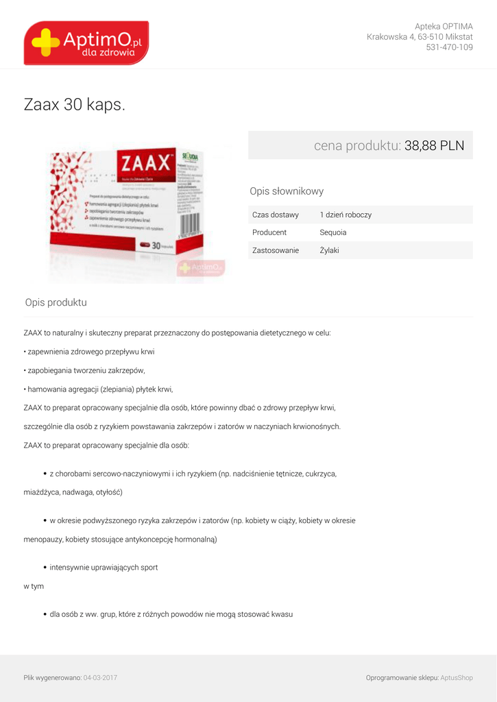 Apteka OPTIMA Krakowska 4, 63-510 Mikstat 531-470-109 Zaax 30 kaps. cena produktu: 38,88 PLN Opis słownikowy Czas dostawy 1 dzień roboczy Producent Sequoia Zastosowanie Żylaki Opis produktu ZAAX to naturalny i skuteczny preparat przeznaczony do postępowania dietetycznego w celu: • zapewnienia zdrowego przepływu krwi • zapobiegania tworzeniu zakrzepów, • hamowania agregacji (zlepiania) płytek krwi, ZAAX to preparat opracowany specjalnie dla osób, które powinny dbać o zdrowy przepływ krwi, szczególnie dla osób z ryzykiem powstawania zakrzepów i zatorów w naczyniach krwionośnych. ZAAX to preparat opracowany specjalnie dla osób: z chorobami sercowo-naczyniowymi i ich ryzykiem (np. nadciśnienie tętnicze, cukrzyca, miażdżyca, nadwaga, otyłość) w okresie podwyższonego ryzyka zakrzepów i zatorów (np. kobiety w ciąży, kobiety w okresie menopauzy, kobiety stosujące antykoncepcję hormonalną) intensywnie uprawiających sport w tym dla osób z ww. grup, które z różnych powodów nie mogą stosować kwasu Plik wygenerowano: 04-03-2017 Oprogramowanie sklepu: AptusShop Apteka OPTIMA Krakowska 4, 63-510 Mikstat 531-470-109 acetylosalicylowego ZAAX jest także polecany dla osób cierpiących na migreny, zawroty głowy oraz osób z obrzękami i drętwieniem nóg. ZAAX zapewnia zdrowy przepływ krwi, poprzez utrzymanie prawidłowej agregacji płytek krwi. ZAAX nie powoduje skutków ubocznych. Nie podrażnia żołądka, nie wywołuje bólu brzucha, zgagi, nudności ani bólu głowy. ZAAX nie wykazuje interakcji z innymi preparatami. Można przyjmować np. z kwasem acetylosalicylowym, lekami obniżającymi ciśnienie tętnicze lub cholesterol oraz lekami przeciwcukrzycowymi (tj. ACEI, ARBs, CCB, β-blokery, statyny, insulina). ZAAX nie zawiera likopenu, drożdży, białek mleka, pszenicy, skrobi kukurydzianej, glutenu, aromatów, sodu i potasu. ZAAX może być stosowany przez osoby: • z nadwrażliwością na leki z grupy salicylanów i inne niesteroidowe leki przeciwzapalne, • z astmą oskrzelową, • z czynną chorobą wrzodową. Skład Ekstrakt Fruitflow*, maltodekstryna, substancja przeciwzbrylająca: hydroksypropylometyloceluloza, nośnik: stearynian magnezu, nośnik: dwutlenek krzemu, dwutlenek tytanu; żelatyna, barwnik: tlenek żelaza. *Ekstrakt Fruitflow stanowi opatentowaną kompozycję polifenoli, nukleotydów oraz izoflawonoidów pochodzenia naturalnego, pozyskiwanego z WSTC II. Wartość odżywcza 100 g 1 kapsułka Wartość energetyczna 1578 kJ (377 kcal) 3,36 kJ (0,8 kcal) Tłuszcz, w tym: Kwasy tłuszczowe nasycone 0,2 g 0,0 g 0,0 g 0,0 gWęglowodany, w tym: Cukry 33,1 g 0,07 g 0,3 g 0,0 gBłonnik 0,5 g 0,0 g Białko 60,1 g 0,13 g Sód 0,0 g 0,0 g Fruitflow 70420 mg 150 mg gładkim pozwala na uniknięcie procesu ich agregacji. ZAAX działa w sposób odwracalny. Czynność płytek krwi nie jest całkowicie wyłączona. Utrzymywany jest odpowiedni poziom, umożliwiający agregację w sytuacji uszkodzenia naczyń. Plik wygenerowano: 04-03-2017 Powered by TCPDF (www.tcpdf.org) Oprogramowanie sklepu: AptusShop