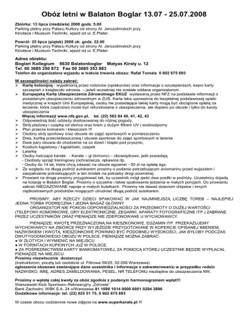 Obóz letni w Balaton Boglar 13.07 - 25.07.2008 Zbiórka: 13 lipca (niedziela) 2008 godz. 5.00 Parking płatny przy Pałacu Kultury od strony Al. Jerozolimskich przy Kinotece i Muzeum Techniki, wjazd od ul. E.Plater. Powrót: 25 lipca (piątek) 2008 ok. godz. 22.00 Parking płatny przy Pałacu Kultury od strony Al. Jerozolimskich przy Kinotece i Muzeum Techniki, wjazd od ul. E.Plater. Adres obiektu: Boglari Kollegium 8630 Balatonboglar Matyas Kiraly u. 12 Tel. 00 3685 350 872 Fax 00 3685 353 883 Telefon do organizatora wyjazdu w trakcie trwania obozu: Rafał Tomala 0 602 675 693 W szczególności należy zabrać: Kartę kolonijną - wypełnioną przez rodziców (opiekunów) oraz informacje o szczepieniach, ksero karty szczepień z książeczki zdrowia – jeżeli wcześniej nie została oddana organizatorom Europejską Kartę Ubezpieczenia Zdrowotnego EKUZ wydawaną przez NFZ na podstawie informacji o posiadanym ubezpieczeniu zdrowotnym w ZUS. Karta taka upoważnia do bezpłatnej podstawowej opieki medycznej w krajach Unii Europejskiej, osoby nie posiadające takiej karty mogą być obciążone opłatą za leczenie, które częściowo może być refundowane z ubezpieczenia, ale dopiero po obozie i tylko do kwoty ubezpieczenia Więcej informacji www.nfz.gov.pl, tel. (22) 582 84 40, 41, 42, 43 Odpowiednią ilość odzieży dostosowanej do różnej pogody, Strój plażowy i czapkę od słońca oraz krem z dużym filtrem UV i wodoodporny Płyn przeciw komarom i kleszczom !!! Osobny strój sportowy oraz obuwie do zajęć sportowych w pomieszczeniu Dres, kurtkę przeciwdeszczową i obuwie sportowe do zajęć sportowych w terenie Dwie pary obuwia do chodzenie na co dzień i klapki pod prysznic, Kostium kąpielowy / kąpielówki, czepek Latarkę Osoby ćwiczące karate: - Karate – gi (kimono) – obowiązkowo, jeśli posiadają - Osobisty sprzęt treningowy (ochraniacze, rękawice itp. - Osoby do 14 lat, które chcą zdawać na obozie egzamin - 50 zł na opłatę egz. Ze względu na długą podróż autokarem prosimy o podanie potrzebującym aviomarinu przed wyjazdem i zaopatrzenie potrzebujących w ten środek na potrzeby drogi powrotnej. Prowiant na drogę prosimy przygotować tak, by uczestnik mógł zjeść dwa posiłki w podróży. Uczestnicy dojadą na kolację w Balaton Boglar. Prosimy o szczelne i łatwe spakowanie jedzenia w małych porcjach. Do prowiantu zabrać NIEGAZOWANE napoje w małych butelkach. Prosimy nie dawać dzieciom chipsów i innych ciężkostrawnych produktów mogących utrudniać długą podróż autokarem. PROSIMY, ABY RZECZY DZIECI SPAKOWAĆ W JAK NAJMNIEJSZĄ LICZBĘ TOREB – NAJLEPIEJ JEDNA TORBA PODRĘCZNA I JEDNA BAGAŻ GŁÓWNY. ORGANIZATOR NIE PONOSI ODPOWIEDZIALNOŚCI ZA PRZEDMIOTY O DUŻEJ WARTOŚCI (TELEFONY KOMÓRKOWE, GRY ELEKTRONICZNE, ZEGARKI, APARATY FOTOGRAFICZNE ITP.) ZABRANE PRZEZ UCZESTNIKÓW ORAZ PIENIĄDZE NIE ZDEPONOWANE U WYCHOWAWCY. PIENIĄDZE: KWOTĘ PRZEZNACZONĄ NA KIESZKONOWE, EGZAMIN ITP. PRZEKAZUJEMY WYCHOWAWCY NA ZBIÓRCE PRZY WYJEŹDZIE PRZYGOTOWANE W KOPERCIE OPISANEJ IMIENIEM, NAZWISKIEM I KWOTĄ. KIESZONKOWE POWINNO BYĆ PODOBNEJ WYSOKOŚCI, JAK BYŁOBY PODCZAS DWUTYGODNIOWEGO OBOZU W POLSCE. PIENIĄDZE MOŻNA ZABRAĆ: ● W ZŁOTYCH I WYMIENIĆ NA MIEJSCU ● W FORINTACH KUPIONYCH JUŻ W POLSCE, ● ZA POŚREDNICTWEM KARTY BANKOMATOWEJ, ZA POMOCĄ KTÓREJ UCZESTNIK BĘDZIE WYPŁACAŁ PIENIĄDZE NA MIEJSCU. Prosimy niezwłocznie dostarczyć (instruktorom, pocztą lub osobiście ul. Filtrowa 59/25, 02-056 Warszawa) zgłoszenia obozowe zawierające dane uczestnika i informacje o zakwaterowaniu w przypadku rodzin NAZWISKO, IMIĘ, ADRES ZAMELDOWANIA, PESEL, NR TELEFONU niezbędne do ubezpieczenia NW. Prosimy o wpłatę całej kwoty za obóz zgodnie z podanym harmonogramem wpłat!!! Warszawski Klub Sportowo–Rekreacyjny „Zdrowie” Bank Zachodni: WBK S.A. 24 o/Warszawa 81 1090 1014 0000 0001 0294 3896 Dodatkowe informacje: tel. (22) 825 51 75, 0 602 675 693 W czasie obozu codziennie nowe zdjęcia na www.superkarate.pl !!!