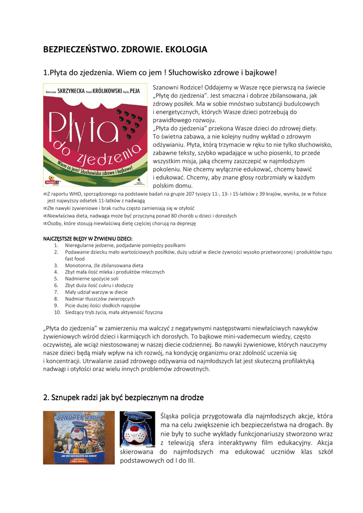 BEZPIECZEŃSTWO. ZDROWIE. EKOLOGIA 1.Płyta do zjedzenia. Wiem co jem ! Słuchowisko zdrowe i bajkowe! Szanowni Rodzice! Oddajemy w Wasze ręce pierwszą na świecie „Płytę do zjedzenia”. Jest smaczna i dobrze zbilansowana, jak zdrowy posiłek. Ma w sobie mnóstwo substancji budulcowych i energetycznych, których Wasze dzieci potrzebują do prawidłowego rozwoju. „Płyta do zjedzenia” przekona Wasze dzieci do zdrowej diety. To świetna zabawa, a nie kolejny nudny wykład o zdrowym odżywianiu. Płyta, którą trzymacie w ręku to nie tylko słuchowisko, zabawne teksty, szybko wpadające w ucho piosenki, to przede wszystkim misja, jaką chcemy zaszczepić w najmłodszym pokoleniu. Nie chcemy wyłącznie edukować, chcemy bawić i edukować. Chcemy, aby znane głosy rozbrzmiały w każdym polskim domu. • Z raportu WHO, sporządzonego na podstawie badań na grupie 207 tysięcy 11-, 13- i 15-latków z 39 krajów, wynika, że w Polsce jest najwyższy odsetek 11-latków z nadwagą • Złe nawyki żywieniowe i brak ruchu często zamieniają się w otyłość • Niewłaściwa dieta, nadwaga może być przyczyną ponad 80 chorób u dzieci i dorosłych • Osoby, które stosują niewłaściwą dietę częściej chorują na depresję NAJCZĘSTSZE BŁĘDY W ŻYWIENIU DZIECI: 1. Nieregularne jedzenie, podjadanie pomiędzy posiłkami 2. Podawanie dziecku mało wartościowych posiłków, duży udział w diecie żywności wysoko przetworzonej i produktów typu fast food 3. Monotonna, źle zbilansowana dieta 4. Zbyt mała ilość mleka i produktów mlecznych 5. Nadmierne spożycie soli 6. Zbyt duża ilość cukru i słodyczy 7. Mały udział warzyw w diecie 8. Nadmiar tłuszczów zwierzęcych 9. Picie dużej ilości słodkich napojów 10. Siedzący tryb życia, mała aktywność fizyczna „Płyta do zjedzenia” w zamierzeniu ma walczyć z negatywnymi następstwami niewłaściwych nawyków żywieniowych wśród dzieci i karmiących ich dorosłych. To bajkowe mini-vademecum wiedzy, często oczywistej, ale wciąż niestosowanej w naszej diecie codziennej. Bo nawyki żywieniowe, których nauczymy nasze dzieci będą miały wpływ na ich rozwój, na kondycję organizmu oraz zdolność uczenia się i koncentracji. Utrwalanie zasad zdrowego odżywania od najmłodszych lat jest skuteczną profilaktyką nadwagi i otyłości oraz wielu innych problemów zdrowotnych. 2. Sznupek radzi jak być bezpiecznym na drodze Śląska policja przygotowała dla najmłodszych akcje, która ma na celu zwiększenie ich bezpieczeństwa na drogach. By nie były to suche wykłady funkcjonariuszy stworzono wraz z telewizją sfera interaktywny film edukacyjny. Akcja skierowana do najmłodszych ma edukować uczniów klas szkół podstawowych od I do III. 3. Segregujemy śmieci (film DVD) Film w bardzo atrakcyjnej formie przedstawia problemy związane z narastającą ilością śmieci i odpadów, a także - co ważniejsze - pokazuje pozytywne rozwiązania tego problemu i zachęca do aktywnego udziału w procesie segregowania odpadów. Papierek wyrzucony na ulicę przez dwóch chłopców staje się pretekstem do prześledzenia drogi, jaką pokonują różnorodne odpady od śmietnika czy naszego domowego kosza po rozkład lub ponowne wykorzystanie. Wraz z głównymi bohaterami znajdziemy się na ścieżce ekologicznej, gdzie zobaczymy, co dzieje się z papierkiem, plastikiem, szkłem i metalem wyrzuconymi do odpowiednich pojemników. Dowiemy się także, co zrobić z przepaloną żarówką, przeterminowanymi lekami, starymi bateriami, zużytą lodówką czy wielką kanapą, by przysłużyć się środowisku. 4. Pierwsza pomoc w nagłych wypadkach (filmy DVD) Umiejętność ratowania życia może przydać się każdemu, bowiem o przeżyciu decydują zazwyczaj pierwsze minuty po wypadku. Aby w takiej sytuacji nie sparaliżował nas strach, proponujemy pakiet filmów instruktażowych, które pomogą nam zachować zimną krew, pokonać lęk, a przede wszystkim pomóc osobie poszkodowanej. Pakiet zawiera 4 płyty. - Pierwsza Pomoc - bezpieczna szkoła • • • • • krwawienia i krwotoki astma cukrzyca złamania i zwichnięcia kończyn wypadek samochodowy - Pierwsza Pomoc - bezpieczna ulica • • • • • zagrożenie życia, powiadomienie służb ratunkowych problemy z sercem drgawki alergie i ukąszenia zatrzymanie krążenia (szybka defibrylacja AED) - Pierwsza Pomoc - bezpieczny dom • • • • oparzenia termiczne środki chemiczne i leki porażenie prądem tonięcie w wannie spowodowane zatruciem tlenkiem węgla - Prezentacja multimedialna – Przedmedyczne zabiegi ratujące życie Prezentacja stanowi znakomitą pomoc dydaktyczną w samokształceniu dla wszystkich chcących przeprowadzić " mini kurs " zasad pierwszej pomocy. Przystępność i forma przygotowanych przez grupę ratowników prezentacji sprawia, że może ona być wykorzystywana w pracy z uczniami szkół podstawowych, gimnazjów i szkół średnich, jak i osobami dorosłymi. • łańcuch przeżycia • zasady wzywania służb ratunkowych • wyposażenie apteczki • bezpieczeństwo na miejscu wypadku • resuscytacja krążeniowo-oddechowa • zadławienie • bezpieczna pozycja poszkodowanego • zakładanie kołnierza ortopedycznego • wyciąganie poszkodowanych z samochodu • wstrząs • krwotoki • oparzenia • zawał serca • złamania • padaczka