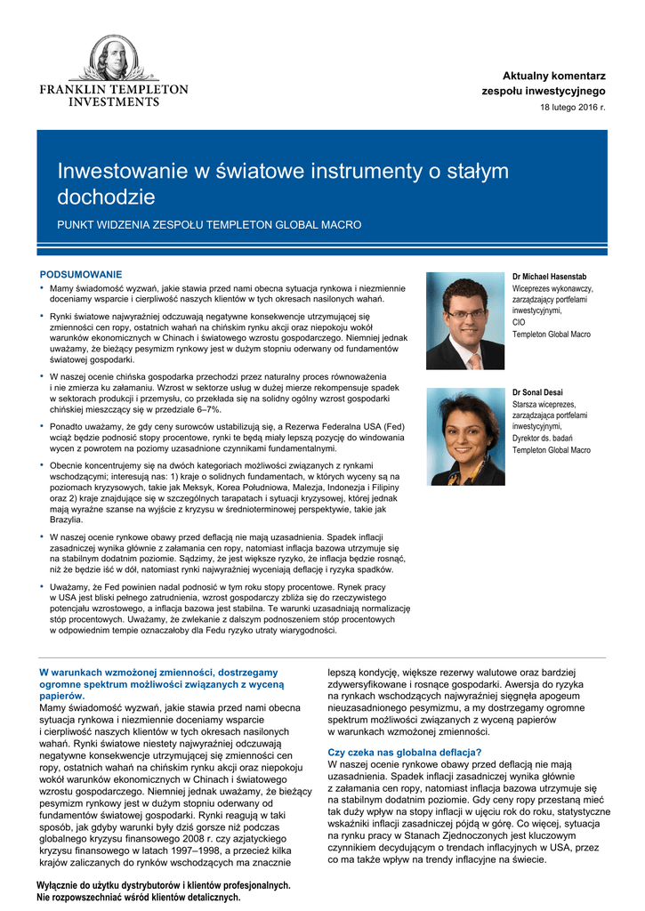 11 stycznia 2013 r. Aktualny komentarz zespołu inwestycyjnego 18 lutego 2016 r. Inwestowanie w światowe instrumenty o stałym dochodzie PUNKT WIDZENIA ZESPOŁU TEMPLETON GLOBAL MACRO PODSUMOWANIE • Mamy świadomość wyzwań, jakie stawia przed nami obecna sytuacja rynkowa i niezmiennie doceniamy wsparcie i cierpliwość naszych klientów w tych okresach nasilonych wahań. • Rynki światowe najwyraźniej odczuwają negatywne konsekwencje utrzymującej się zmienności cen ropy, ostatnich wahań na chińskim rynku akcji oraz niepokoju wokół warunków ekonomicznych w Chinach i światowego wzrostu gospodarczego. Niemniej jednak uważamy, że bieżący pesymizm rynkowy jest w dużym stopniu oderwany od fundamentów światowej gospodarki. • W naszej ocenie chińska gospodarka przechodzi przez naturalny proces równoważenia i nie zmierza ku załamaniu. Wzrost w sektorze usług w dużej mierze rekompensuje spadek w sektorach produkcji i przemysłu, co przekłada się na solidny ogólny wzrost gospodarki chińskiej mieszczący się w przedziale 6–7%. • Ponadto uważamy, że gdy ceny surowców ustabilizują się, a Rezerwa Federalna USA (Fed) wciąż będzie podnosić stopy procentowe, rynki te będą miały lepszą pozycję do windowania wycen z powrotem na poziomy uzasadnione czynnikami fundamentalnymi. • Obecnie koncentrujemy się na dwóch kategoriach możliwości związanych z rynkami wschodzącymi; interesują nas: 1) kraje o solidnych fundamentach, w których wyceny są na poziomach kryzysowych, takie jak Meksyk, Korea Południowa, Malezja, Indonezja i Filipiny oraz 2) kraje znajdujące się w szczególnych tarapatach i sytuacji kryzysowej, której jednak mają wyraźne szanse na wyjście z kryzysu w średnioterminowej perspektywie, takie jak Brazylia. • W naszej ocenie rynkowe obawy przed deflacją nie mają uzasadnienia. Spadek inflacji zasadniczej wynika głównie z załamania cen ropy, natomiast inflacja bazowa utrzymuje się na stabilnym dodatnim poziomie. Sądzimy, że jest większe ryzyko, że inflacja będzie rosnąć, niż że będzie iść w dół, natomiast rynki najwyraźniej wyceniają deflację i ryzyka spadków. • Uważamy, że Fed powinien nadal podnosić w tym roku stopy procentowe. Rynek pracy w USA jest bliski pełnego zatrudnienia, wzrost gospodarczy zbliża się do rzeczywistego potencjału wzrostowego, a inflacja bazowa jest stabilna. Te warunki uzasadniają normalizację stóp procentowych. Uważamy, że zwlekanie z dalszym podnoszeniem stóp procentowych w odpowiednim tempie oznaczałoby dla Fedu ryzyko utraty wiarygodności. W warunkach wzmożonej zmienności, dostrzegamy ogromne spektrum możliwości związanych z wyceną papierów. Mamy świadomość wyzwań, jakie stawia przed nami obecna sytuacja rynkowa i niezmiennie doceniamy wsparcie i cierpliwość naszych klientów w tych okresach nasilonych wahań. Rynki światowe niestety najwyraźniej odczuwają negatywne konsekwencje utrzymującej się zmienności cen ropy, ostatnich wahań na chińskim rynku akcji oraz niepokoju wokół warunków ekonomicznych w Chinach i światowego wzrostu gospodarczego. Niemniej jednak uważamy, że bieżący pesymizm rynkowy jest w dużym stopniu oderwany od fundamentów światowej gospodarki. Rynki reagują w taki sposób, jak gdyby warunki były dziś gorsze niż podczas globalnego kryzysu finansowego 2008 r. czy azjatyckiego kryzysu finansowego w latach 1997–1998, a przecież kilka krajów zaliczanych do rynków wschodzących ma znacznie Wyłącznie do użytku dystrybutorów i klientów profesjonalnych. Nie rozpowszechniać wśród klientów detalicznych. Dr Michael Hasenstab Wiceprezes wykonawczy, zarządzający portfelami inwestycyjnymi, CIO Templeton Global Macro Dr Sonal Desai Starsza wiceprezes, zarządzająca portfelami inwestycyjnymi, Dyrektor ds. badań Templeton Global Macro lepszą kondycję, większe rezerwy walutowe oraz bardziej zdywersyfikowane i rosnące gospodarki. Awersja do ryzyka na rynkach wschodzących najwyraźniej sięgnęła apogeum nieuzasadnionego pesymizmu, a my dostrzegamy ogromne spektrum możliwości związanych z wyceną papierów w warunkach wzmożonej zmienności. Czy czeka nas globalna deflacja? W naszej ocenie rynkowe obawy przed deflacją nie mają uzasadnienia. Spadek inflacji zasadniczej wynika głównie z załamania cen ropy, natomiast inflacja bazowa utrzymuje się na stabilnym dodatnim poziomie. Gdy ceny ropy przestaną mieć tak duży wpływ na stopy inflacji w ujęciu rok do roku, statystyczne wskaźniki inflacji zasadniczej pójdą w górę. Co więcej, sytuacja na rynku pracy w Stanach Zjednoczonych jest kluczowym czynnikiem decydującym o trendach inflacyjnych w USA, przez co ma także wpływ na trendy inflacyjne na świecie. W naszej ocenie USA notują dziś pełne zatrudnienie i rosnącą presję płacową. Nie dostrzegamy poważniejszego ryzyka presji deflacyjnych po stronie popytu i nie widzimy właściwie żadnych empirycznych dowodów, które uzasadniałyby strach przed deflacją. Uważamy, że poziomy rzeczywistej inflacji są niedoszacowane przez rynki i spodziewamy się szybszego wzrostu rozbieżności pomiędzy potencjalną a rzeczywistą zdolnością produkcyjną na świecie wraz z ożywieniem na rynkach wschodzących. W naszej ocenie jest większe ryzyko, że inflacja będzie rosnąć, niż że będzie iść w dół, natomiast rynki najwyraźniej wyceniają deflację i ryzyko spadków. Inflacja może, naszym zdaniem, zaskoczyć rynki. Co dzieje się w Chinach i dlaczego nasiliła się zmienność na tym rynku? W naszej ocenie, reakcja rynków na sytuację w Chinach jest przesadnie emocjonalna, ponieważ sporą część odpowiedzialności za ogólną wyprzedaż rynkową ponosi strach. Ważne jednak, by rozdzielić wydarzenia na rynku akcji od sytuacji w gospodarce. Chiński rynek akcji jest względnie nowy i zmienny, a liczba uczestników tego rynku jest ograniczona — nie reprezentuje on całej kr