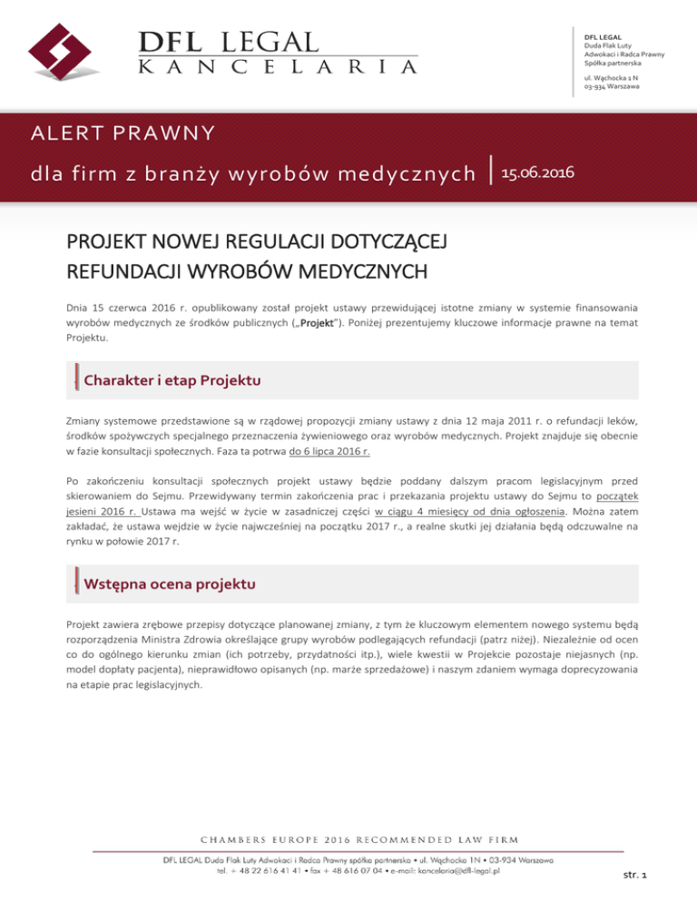 DFL LEGAL Duda Flak Luty Adwokaci i Radca Prawny Spółka partnerska ul. Wąchocka 1 N 03-934 Warszawa ALERT PRAWNY dla firm z branży wyrobów medycznych | 15.06.2016 PROJEKT NOWEJ REGULACJI DOTYCZĄCEJ REFUNDACJI WYROBÓW MEDYCZNYCH Dnia 15 czerwca 2016 r. opublikowany został projekt ustawy przewidującej istotne zmiany w systemie finansowania wyrobów medycznych ze środków publicznych („Projekt”). Poniżej prezentujemy kluczowe informacje prawne na temat Projektu. \ Charakter i etap Projektu Zmiany systemowe przedstawione są w rządowej propozycji zmiany ustawy z dnia 12 maja 2011 r. o refundacji leków, środków spożywczych specjalnego przeznaczenia żywieniowego oraz wyrobów medycznych. Projekt znajduje się obecnie w fazie konsultacji społecznych. Faza ta potrwa do 6 lipca 2016 r. Po zakończeniu konsultacji społecznych projekt ustawy będzie poddany dalszym pracom legislacyjnym przed skierowaniem do Sejmu. Przewidywany termin zakończenia prac i przekazania projektu ustawy do Sejmu to początek jesieni 2016 r. Ustawa ma wejść w życie w zasadniczej części w ciągu 4 miesięcy od dnia ogłoszenia. Można zatem zakładać, że ustawa wejdzie w życie najwcześniej na początku 2017 r., a realne skutki jej działania będą odczuwalne na rynku w połowie 2017 r. \ Wstępna ocena projektu Projekt zawiera zrębowe przepisy dotyczące planowanej zmiany, z tym że kluczowym elementem nowego systemu będą rozporządzenia Ministra Zdrowia określające grupy wyrobów podlegających refundacji (patrz niżej). Niezależnie od ocen co do ogólnego kierunku zmian (ich potrzeby, przydatności itp.), wiele kwestii w Projekcie pozostaje niejasnych (np. model dopłaty pacjenta), nieprawidłowo opisanych (np. marże sprzedażowe) i naszym zdaniem wymaga doprecyzowania na etapie prac legislacyjnych. str. 1 DFL LEGAL Duda Flak Luty Adwokaci i Radca Prawny Spółka partnerska ul. Wąchocka 1 N 03-934 Warszawa ALERT PRAWNY dla firm z branży wyrobów medycznych \ Kluczowe zmiany prawne Do tej pory system finansowania wyrobów medycznych opierał się na trzech filarach: a. finansowanie w ramach procedur medycznych stosowanych w szpitalach i ambulatoriach kontraktujących z NFZ; b. refundacja wyrobów medycznych wydawanych w aptekach i sklepach medycznych na zlecenie osoby uprawnionej; c. refundacja wyrobów medycznych wymienionych w obwieszczeniu refundacyjnym, w aptece, na podstawie recepty. Projekt wprowadza kolejny „podsystem” do aktualnego ustawodawstwa refundacyjnego, który częściowo dotyczyć będzie produktów z grupy „a”, zaś częściowo z grupy „b” powyżej. \ Jak ma działać nowy system? Minister Zdrowia będzie wydawał rozporządzenia, na podstawie których określi grupy wyrobów medycznych (uzasadnienie ustawy wskazuje, że będą to m.in. materiały chłonne), które mają podlegać nowej regulacji. Wyroby medyczne określone w ww. rozporządzeniach będą podlegały zasadom refundacji analogicznym jak leki, tj. wytwórcy/autoryzowani przedstawiciele/dystrybutorzy wyrobów medycznych będą zgłaszać swoje produkty do systemu, składając wniosek. W ramach negocjacji z Komisja Ekonomiczną, dla wyrobów zostanie ustalona urzędowa cena zbytu. Produkt zostanie wpisany do istniejącej lub nowej grupy limitowej i ustalona zostanie wysokość limitu finansowania ze środków publicznych. Wyroby medyczne wydawane na zlecenie będą kwalifikowane do jednego z 4 poziomów odpłatności – bezpłatne, 10%, 30%, 50% – w zależności od przewidzianego przeznaczenia i czasu stosowania. Na zakończenie rozpatrywania wniosku Minister Zdrowia wyda decyzję administracyjną o objęciu refundacją i ustaleniu urzędowej ceny zbytu lub o ustaleniu urzędowej ceny zbytu. Decyzja będzie wydawana na okres do 5 lat. Wyroby medyczne objęte nową regulacją będą zamieszczane w nowym obwieszczeniu Ministra Zdrowia wydawanym raz na 2 miesiące, analogicznym do aktualnego obwieszczenia dot. produktów refundowanych. \ | 15.06.2016 Kto będzie mógł wnioskować? W jakim trybie? Minister Zdrowia, po wydaniu rozporządzenia określającego grupy wyrobów medycznych podlegających nowej regulacji, wezwie wytwórcę, autoryzowanego przedstawiciela, dystrybutora lub importera, których wyroby medyczne były dotychczas stosowane przy realizacji świadczeń gwarantowanych. str. 2 DFL LEGAL Duda Flak Luty Adwokaci i Radca Prawny Spółka partnerska ul. Wąchocka 1 N 03-934 Warszawa ALERT PRAWNY dla firm z branży wyrobów medycznych Wnioskodawcy składać będą wnioski zgodnie ze wzorem wraz ze stosownymi informacjami i dokumentami, w tym z wymaganymi analizami. Poziom zaawansowania wymaganych dokumentów będzie określany w rozporządzeniu Ministra Zdrowia. Wniosek podlegać będzie opłacie w wysokości nie wyższej niż 10.000 złotych od każdego produktu. \ \ Jak odbywać się będzie obrót wyrobami refundowanymi w nowym trybie? Dla wyrobów medycznych ma być ustalona degresywna, obowiązkowa marża urzędowa (marża maksymalna), do podziału pomiędzy wszystkie szczeble obrotu (hurt i detal). Projekt nie wyodrębnia różnych poziomów marż na różnych szczeblach, tak jak w dotychczasowych regulacjach refundacyjnych. Wyroby medyczne stosowane w ramach udzielania świadczeń gwarantowanych będą wydawane bezpłatnie. Pacjenci będą mogli jednak dopłacać do wyrobów droższych niż oferowane bezpłatnie w ramach świadczeń gwarantowanych (świadczeniodawca ma obowiązek poinformować o takiej możliwości). W przypadku wyrobów medycznych nieobjętych decyzją o refundacji świadczeniodawca będzie zobowiązany do nabycia takich wyrobów na rynku i rozliczenia się z pacjentem. Pacjent będzie również uprawniony do finansowania wyrobów nieobjętych system refundacyjnym – brak jest jednak klarownych reguł płatności w tym zakresie. Projekt reguluje dopłaty wyłącznie w odniesieniu do wyrobów z grup objętych rozporządzeniem MZ – brak jest przepisów od