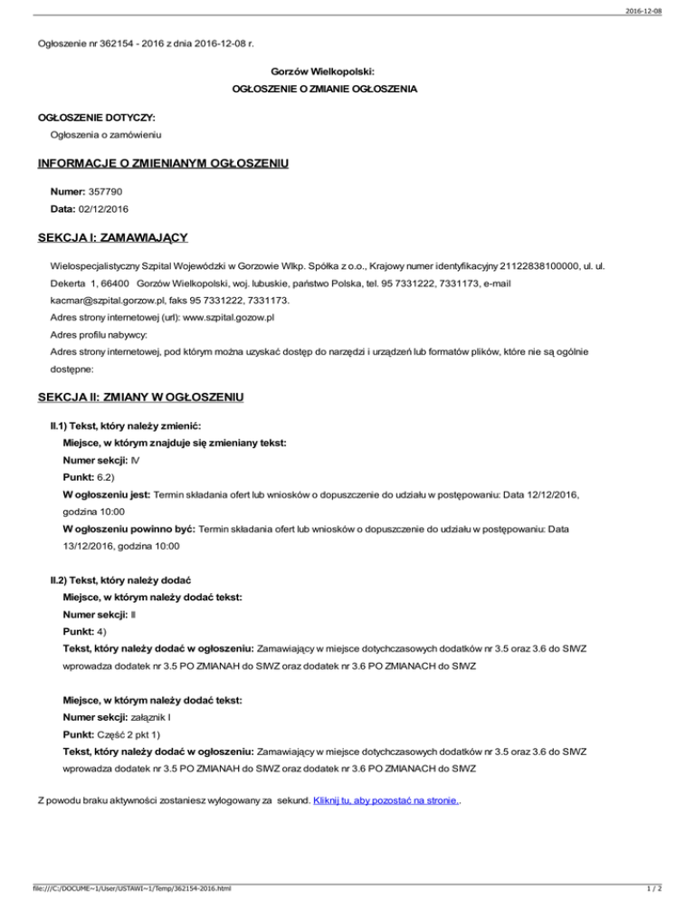 informacje o zmienianym ogłoszeniu sekcja i: zamawiający sekcja ii
