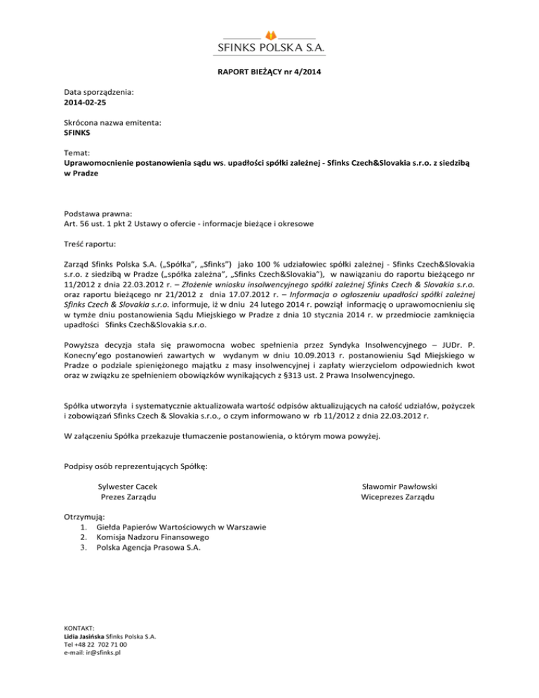RAPORT BIEŻĄCY nr 4/2014 Data sporządzenia: 2014-02-25 Skrócona nazwa emitenta: SFINKS Temat: Uprawomocnienie postanowienia sądu ws. upadłości spółki zależnej - Sfinks Czech&Slovakia s.r.o. z siedzibą w Pradze Podstawa prawna: Art. 56 ust. 1 pkt 2 Ustawy o ofercie - informacje bieżące i okresowe Treść raportu: Zarząd Sfinks Polska S.A. („Spółka”, „Sfinks”) jako 100 % udziałowiec spółki zależnej - Sfinks Czech&Slovakia s.r.o. z siedzibą w Pradze („spółka zależna”, „Sfinks Czech&Slovakia”), w nawiązaniu do raportu bieżącego nr 11/2012 z dnia 22.03.2012 r. – Złożenie wniosku insolwencyjnego spółki zależnej Sfinks Czech & Slovakia s.r.o. oraz raportu bieżącego nr 21/2012 z dnia 17.07.2012 r. – Informacja o ogłoszeniu upadłości spółki zależnej Sfinks Czech & Slovakia s.r.o. informuje, iż w dniu 24 lutego 2014 r. powziął informację o uprawomocnieniu się w tymże dniu postanowienia Sądu Miejskiego w Pradze z dnia 10 stycznia 2014 r. w przedmiocie zamknięcia upadłości Sfinks Czech&Slovakia s.r.o. Powyższa decyzja stała się prawomocna wobec spełnienia przez Syndyka Insolwencyjnego – JUDr. P. Konecny’ego postanowień zawartych w wydanym w dniu 10.09.2013 r. postanowieniu Sąd Miejskiego w Pradze o podziale spieniężonego majątku z masy insolwencyjnej i zapłaty wierzycielom odpowiednich kwot oraz w związku ze spełnieniem obowiązków wynikających z §313 ust. 2 Prawa Insolwencyjnego. Spółka utworzyła i systematycznie aktualizowała wartość odpisów aktualizujących na całość udziałów, pożyczek i zobowiązań Sfinks Czech & Slovakia s.r.o., o czym informowano w rb 11/2012 z dnia 22.03.2012 r. W załączeniu Spółka przekazuje tłumaczenie postanowienia, o którym mowa powyżej. Podpisy osób reprezentujących Spółkę: Sylwester Cacek Prezes Zarządu Otrzymują: 1. Giełda Papierów Wartościowych w Warszawie 2. Komisja Nadzoru Finansowego 3. Polska Agencja Prasowa S.A. KONTAKT: Lidia Jasińska Sfinks Polska S.A. Tel +48 22 702 71 00 e-mail: [email protected] Sławomir Pawłowski Wiceprezes Zarządu