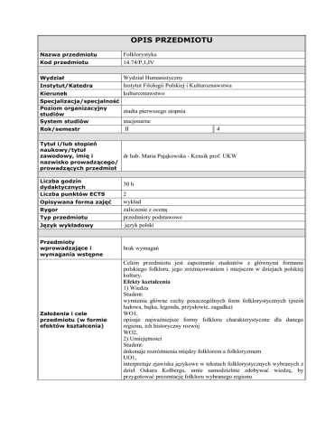 OPIS PRZEDMIOTU Nazwa przedmiotu Kod przedmiotu Wydział Instytut/Katedra Kierunek Folklorystyka 14.74/P,1,IV Wydział Humanistyczny Instytut Filologii Polskiej i Kulturoznawstwa kulturoznawstwo Specjalizacja/specjalność Poziom organizacyjny studia pierwszego stopnia studiów stacjonarne System studiów Rok/semestr II 4 Tytuł i/lub stopień naukowy/tytuł dr hab. Maria Pająkowska - Kensik prof. UKW zawodowy, imię i nazwisko prowadzącego/ prowadzących przedmiot Liczba godzin dydaktycznych Liczba punktów ECTS Opisywana forma zajęć Rygor Typ przedmiotu Język wykładowy 30 h 2 wykład zaliczenie z oceną przedmioty podstawowe język polski Przedmioty wprowadzające i wymagania wstępne brak wymagań Założenia i cele przedmiotu (w formie efektów kształcenia) Celem przedmiotu jest zapoznanie studentów z głównymi formami polskiego folkloru, jego zróżnicowaniem i miejscem w dziejach polskiej kultury. Efekty kształcenia 1) Wiedza Student: wymienia główne cechy poszczególnych form folklorystycznych (pieśń ludowa, bajka, legenda, przysłowie, zagadka) WO1, opisuje najważniejsze formy folkloru charakterystyczne dla danego regionu, ich historyczny rozwój WO2, 2) Umiejętności Student: dokonuje rozróżnienia między folklorem a folkloryzmem UO1, interpretuje zjawiska językowe w tekstach folklorystycznych wybranych z dzieł Oskara Kolberga, umie samodzielnie zdobywać wiedzę, by przygotować prezentację folkloru wybranego regionu UO2, 3) Kompetencje społeczne student przygotowuje projekt wprowadzenia elementów folkloru w wybraną formę działalności upowszechniającej polską kulturę KO1, ma świadomość odpowiedzialności za zachowanie dziedzictwa kulturowego KO2, Metody dydaktyczne Forma i warunki zaliczenia przedmiotu – wymagania i system oceniania wykład pisemna praca zaliczeniowa + kolokwium na ocenę dostateczną – student wymienia podstawowe informacje o formach folkloru polskiego, opisuje folklor charakterystyczny dla danego regionu na ocenę dobrą - student wymienia podstawowe informacje o formach folkloru polskiego, opisuje folklor charakterystyczny dla danego regionu; przygotowuje referat (pracę zaliczeniową) na temat folkloru wybranego regionu na ocenę bardzo dobrą - student wymienia podstawowe informacje o formach folkloru polskiego, opisuje folklor charakterystyczny dla danego regionu; przygotowuje referat (pracę zaliczeniową) na temat folkloru wybranego regionu; projektuje wprowadzenie form folklorystycznych w program upowszechniający kulturę polską ..................................................... data ......................................................................................................................................... podpis prowadzącego przedmiot/ koordynatora przedmiotu* Opis sposobu sprawdzania efektów kształcenia dla przedmiotu z odniesieniem do form zajęć i sprawdzianów Efekty kształcenia a forma zajęć Efekty kształcenia dla kierunku K_WO3, K_W04 K_UO2, K_U03, K_U05 K_KO5, K_KU08 przedmiotu Ocenianie efektów kształcenia Forma Sposoby Efekty kształcenia dla zajęć oceniania przedmiotu WO1, WO2 W kolokwium ??? UO1, UO2 W kolokwium ??? KO2 W projekt ??? PROGRAM NAUCZANIA PRZEDMIOTU Nazwa przedmiotu Wydział Instytut/Katedra Kierunek Opisywana forma zajęć Liczba godzin dydaktycznych folklorystyka humanistyczny Instytut Filologii Polskiej i Kulturoznawstwa kulturoznawstwo wykład 30 Tytuł i/lub stopień naukowy/tytuł zawodowy, imię i nazwisko prowadzącego/ prowadzącego dana formę zajęć dr hab. Maria Pająkowska - Kensik prof. UKW Szczegółowa tematyka zajęć 1. Z dziejów folklorystyki polskiej. 2.Ludoznawstwo Oskara Kolberga. 3.Zapis dialektologiczny a potrzeby folklorystyki. 4.Ludoznawstwo jako nauka pomocnicza historii. 5.Folklorystyka w zasięgu badań naukowo - literackich. 6.O języku folkloru. 7.Ludowość w słowiańskich literaturach narodowych. 8.W kręgu pieśni ludowych. 9.W krainie bajki, legend i zagadek. 10.Osiągnięcia polskiej paremiologii. 11.- 15. Folklor Wielkopolski i Małopolski, Śląska, Mazowsza i Pomorza. Metody dydaktyczne Metody i kryteria oceniania Literatura podstawowa Literatura uzupełniająca (w tym portale internetowe) ..................................................... data krytyczna ocena, analiza dokumentów, prezentacje multimedialne, praca z książką pisemna praca zaliczeniowa + kolokwium na ocenę dostateczną – student wymienia podstawowe informacje o formach folkloru polskiego, opisuje folklor charakterystyczny dla danego regionu na ocenę dobrą - student wymienia podstawowe informacje o formach folkloru polskiego, opisuje folklor charakterystyczny dla danego regionu; przygotowuje referat (pracę zaliczeniową) na temat folkloru wybranego regionu na ocenę bardzo dobrą - student wymienia podstawowe informacje o formach folkloru polskiego, opisuje folklor charakterystyczny dla danego regionu; przygotowuje referat (pracę zaliczeniową) na temat folkloru wybranego regionu; projektuje wprowa-dzenie form folklorystycznych w program upowszechniający kulturę polską 1.J.Burszta, Chłopskie Źródła kultury, Warszawa 1985 2.Dzieje folklorystyki polskiej 1864-1918, red. H.Kapełuś, J.Krzyżanowski, Warszawa 1982 3. O.Kolberg, Dzieła wszystkie : Przysłowia, Warszawa 1977 Pieśń ludu polskiego, 1974 (t.I) Kujawy, 1962 (t. III i IV) Pomorze, 1965 (t.XXXIX) Śląsk, 1965 (t.III) Mazowsze, 1969 (t. XLI) 1.J.Magnuszewski, Tropami folkloru i literatury, Warszawa 1983 2. W.Gusiew, Estetyka folkloru, Wrocław 1974 ...................................................................................................................................... podpis prowadzącego daną formę zajęć