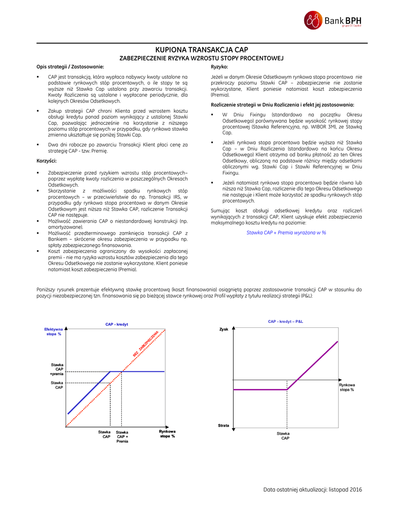 KUPIONA TRANSAKCJA CAP ZABEZPIECZENIE RYZYKA WZROSTU STOPY PROCENTOWEJ Opis strategii / Zastosowanie: Ryzyko: CAP jest transakcją, która wypłaca nabywcy kwoty ustalone na podstawie rynkowych stóp procentowych, o ile stopy te są wyższe niż Stawka Cap ustalona przy zawarciu transakcji. Kwoty Rozliczenia są ustalane i wypłacane periodycznie, dla kolejnych Okresów Odsetkowych. Zakup strategii CAP chroni Klienta przed wzrostem kosztu obsługi kredytu ponad poziom wynikający z ustalonej Stawki Cap, pozwalając jednocześnie na korzystanie z niższego poziomu stóp procentowych w przypadku, gdy rynkowa stawka zmienna ukształtuje się poniżej Stawki Cap. Dwa dni robocze po zawarciu Transakcji Klient płaci cenę za strategię CAP - tzw. Premię. Jeżeli w danym Okresie Odsetkowym rynkowa stopa procentowa nie przekroczy poziomu Stawki CAP – zabezpieczenie nie zostanie wykorzystane, Klient poniesie natomiast koszt zabezpieczenia (Premia). Rozliczenie strategii w Dniu Rozliczenia i efekt jej zastosowania: W Dniu Fixingu (standardowo na początku Okresu Odsetkowego) porównywana będzie wysokość rynkowej stopy procentowej (Stawka Referencyjna, np. WIBOR 3M), ze Stawką Cap. Jeżeli rynkowa stopa procentowa będzie wyższa niż Stawka Cap – w Dniu Rozliczenia (standardowo na końcu Okresu Odsetkowego) Klient otrzyma od banku płatność za ten Okres Odsetkowy, obliczoną na podstawie różnicy między odsetkami obliczonymi wg. Stawki Cap i Stawki Referencyjnej w Dniu Fixingu. Jeżeli natomiast rynkowa stopa procentowa będzie równa lub niższa niż Stawka Cap, rozliczenie dla tego Okresu Odsetkowego nie następuje i Klient może korzystać ze spadku rynkowych stóp procentowych. Korzyści: Zabezpieczenie przed ryzykiem wzrostu stóp procentowych– poprzez wypłatę kwoty rozliczenia w poszczególnych Okresach Odsetkowych. Skorzystanie z możliwości spadku rynkowych stóp procentowych – w przeciwieństwie do np. Transakcji IRS, w przypadku gdy rynkowa stopa procentowa w danym Okresie Odsetkowym jest niższa niż Stawka CAP, rozliczenie Transakcji CAP nie następuje. Możliwość zawierania CAP o niestandardowej konstrukcji (np. amortyzowane). Możliwość przedterminowego zamknięcia transakcji CAP z Bankiem – skrócenie okresu zabezpieczenia w przypadku np. spłaty zabezpieczanego finansowania. Koszt zabezpieczenia ograniczony do wysokości zapłaconej premii - nie ma ryzyka wzrostu kosztów zabezpieczenia dla tego Okresu Odsetkowego nie zostanie wykorzystane. Klient poniesie natomiast koszt zabezpieczenia (Premia). Sumując koszt obsługi odsetkowej kredytu oraz rozliczeń wynikających z transakcji CAP, Klient uzyskuje efekt zabezpieczenia maksymalnego kosztu kredytu na poziomie: Stawka CAP + Premia wyrażona w % Poniższy rysunek prezentuje efektywną stawkę procentową (koszt finansowania) osiągniętą poprzez zastosowanie transakcji CAP w stosunku do pozycji niezabezpieczonej tzn. finansowania się po bieżącej stawce rynkowej oraz Profil wypłaty z tytułu realizacji strategii (P&L): CAP - kredyt – P&L CAP - kredyt Zysk BE Z ZA BE Z PI EC ZE N IA Efektywna stopa % Stawka CAP +premia Stawka CAP Rynkowa stopa % Strata Stawka CAP Stawka CAP + Premia Rynkowa stopa % Stawka CAP Data ostatniej aktualizacji: listopad 2016 KUPIONA TRANSAKCJA CAP ZABEZPIECZENIE RYZYKA WZROSTU STOPY PROCENTOWEJ Poniższy rysunek prezentuje sposób działania transakcji CAP na hipotetycznym rozkładzie przyszłych zmiennych stawek rynkowych : Stopa % Stawka CAP czas Dzień Fixingu – zmienna stawka referencyjna jest poniżej Stawki Cap – zabezpieczenie nie jest wykorzystywane Dzień Fixingu – zmienna stawka referencyjna jest powyżej Stawki Cap – zabezpieczenie jest wykorzystywane. W Dniu Rozliczenia Klient otrzymuje od Banku ‘wyrównującą’ różnicę między odsetkami. Dzień Fixingu – zmienna stawka referencyjna jest równa Stawce Cap – zabezpieczenie nie jest wykorzystywane Ryzyka związane z zawieraniem transakcji terminowych: • Ryzyko niedopasowania – polega na możliwości niedopasowania przepływów Klienta z jego zobowiązaniami wynikającymi z zawarcia transakcji. Ryzyko niedopasowania dotyczy przede wszystkim transakcji zawieranych przez Klienta w celu zabezpieczenia ekspozycji naturalnej przed niekorzystnym kształtowaniem się rynkowych stóp procentowych i/lub kursów walutowych. • Ryzyko rynkowe – wynika z niekorzystnych (innych od oczekiwań Klienta) zmian wartości parametrów otoczenia rynkowego (kursów walutowych, stóp procentowych, etc.) w trakcie trwania transakcji, co może skutkować zmianami wartości nabytego instrumentu finansowego • Ryzyko operacyjne – wynika z zawodności procesów wewnętrznych, ludzi i systemów lub ze zdarzeń zewnętrznych, mających pośredni lub bezpośredni wpływ na rozliczenie zawartych transakcji; • Ryzyko kredytowe – polega na zagrożeniu nieuregulowania przez jedną ze stron transakcji zobowiązań wynikających z zawarcia transakcji. • Ryzyko księgowe – związane jest z niewłaściwym sposobem ewidencji transakcji przez Klienta, czego efektem może być w szczególności zawyżanie lub zaniżanie faktycznych wyników. • Ryzyko podatkowe – związane jest z możliwością wystąpienia błędu, opóźnienia rozliczenia podatkowego lub wystąpienia nieprawidłowości wynikających z braku pewności co do konsekwencji podatkowych związanych z transakcjami; Zabezpieczanie transakcji: • Zabezpieczanie wykonania transakcji odbywa się zgodnie z Regulaminem „Ogólne Warunki Współpracy z Klientami w zakresie transakcji rynku finansowego”. • Bank na podstawie oceny sytuacji finansowo-ekonomicznej Klienta, może ustalić Limit, w ramach którego są zawierane transakcje. • Od rodzaju i wysokości przyznanego limitu skarbowego zależy sposób, w jaki Klient ustanawia i uzupełnia zabezpieczenie zawieranych transakcji skarbowych (zabezpieczenie wstępne / zabezpieczenie bieżące) • Bank na 