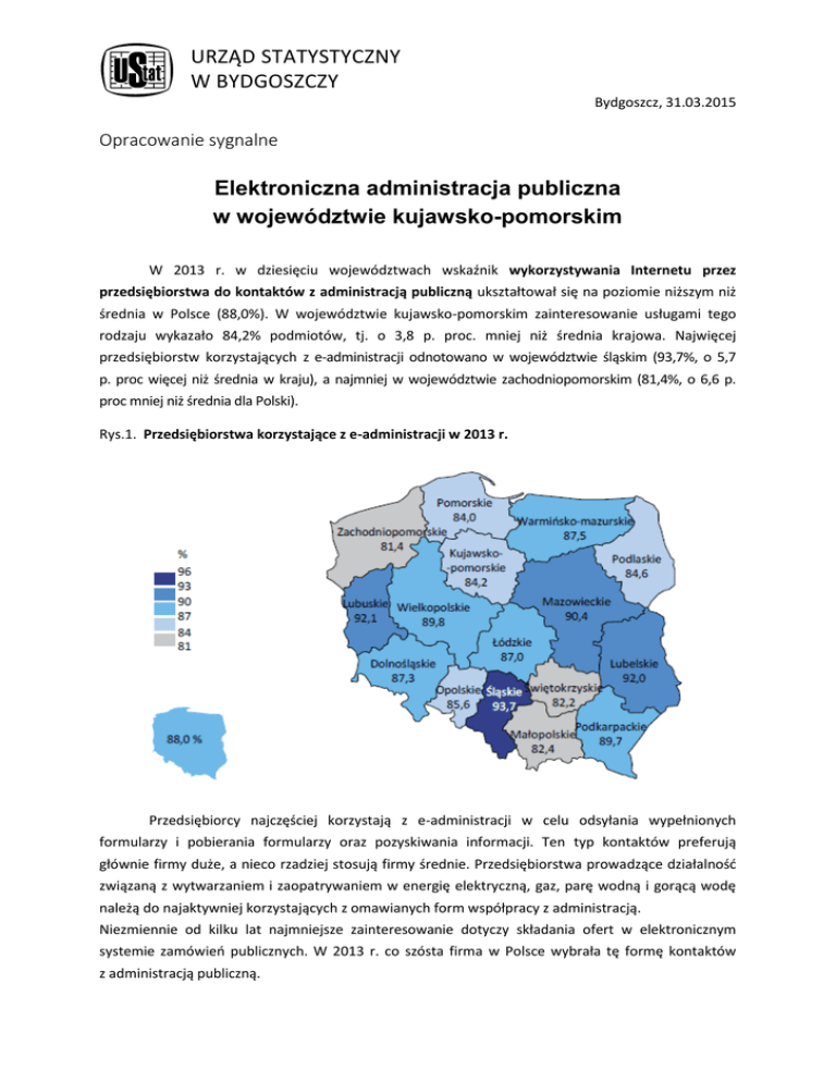 URZĄD STATYSTYCZNY W BYDGOSZCZY Bydgoszcz, 31.03.2015 Opracowanie sygnalne Elektroniczna administracja publiczna w województwie kujawsko-pomorskim W 2013 r. w dziesięciu województwach wskaźnik wykorzystywania Internetu przez przedsiębiorstwa do kontaktów z administracją publiczną ukształtował się na poziomie niższym niż średnia w Polsce (88,0%). W województwie kujawsko-pomorskim zainteresowanie usługami tego rodzaju wykazało 84,2% podmiotów, tj. o 3,8 p. proc. mniej niż średnia krajowa. Najwięcej przedsiębiorstw korzystających z e-administracji odnotowano w województwie śląskim (93,7%, o 5,7 p. proc więcej niż średnia w kraju), a najmniej w województwie zachodniopomorskim (81,4%, o 6,6 p. proc mniej niż średnia dla Polski). Rys.1. Przedsiębiorstwa korzystające z e-administracji w 2013 r. Przedsiębiorcy najczęściej korzystają z e-administracji w celu odsyłania wypełnionych formularzy i pobierania formularzy oraz pozyskiwania informacji. Ten typ kontaktów preferują głównie firmy duże, a nieco rzadziej stosują firmy średnie. Przedsiębiorstwa prowadzące działalność związaną z wytwarzaniem i zaopatrywaniem w energię elektryczną, gaz, parę wodną i gorącą wodę należą do najaktywniej korzystających z omawianych form współpracy z administracją. Niezmiennie od kilku lat najmniejsze zainteresowanie dotyczy składania ofert w elektronicznym systemie zamówień publicznych. W 2013 r. co szósta firma w Polsce wybrała tę formę kontaktów z administracją publiczną. E-ADMINISTRACJA *** Jedną z możliwych form mobilnego dostępu do Internetu są tzw. hotspoty, czyli otwarte punkty dostępu, umożliwiające połączenie z Internetem (najczęściej bezprzewodowe). Według Urzędu Komunikacji Elektronicznej liczba samorządowych hotspotów zainstalowanych w miejscach publicznych w Polsce wynosiła 2227 (według stanu w dniu 29 września 2014 r.), w tym w województwie kujawsko-pomorskim działało ich 55. Największą liczbę hotspotów posiadało województwo lubelskie – 452, zaś w województwie opolskim nie było ich wcale. Rys.2. Lokalizacja samorządowych hotspotów zainstalowanych w miejscach publicznych w 2014 r. *** Osoby korzystające z usług administracji publicznej przez Internet w ciągu ostatnich 12 miesięcy stanowiły w 2014 r. ponad jedną czwartą populacji osób w wieku 16–74 lata (26,9%). Najczęstszą formą korzystania z e-administracji było wyszukiwanie informacji na stronach administracji publicznej. W 2014 r. w porównaniu z poprzednim rokiem zanotowano wzrost odsetka osób korzystających z usług administracji publicznej za pomocą Internetu. W województwie kujawsko-pomorskim odsetek osób korzystających z usług administracji publicznej za pomocą Internetu wyniósł 23,7%. Największy odsetek odnotowano w województwie mazowieckim (34,1%), a najmniejszy w województwie wielkopolskim (20,7%). 2|Strona E-ADMINISTRACJA Rys.3. Osoby korzystające z usług administracji publicznej za pomocą Internetu w 2014 r. Opracowanie merytoryczne: Kujawsko-Pomorski Ośrodek Badań Regionalnych tel. 52 36 69 303 e-mail: [email protected] Rozpowszechnianie: Karolina Hunker tel. 52 36 69 349 e-mail: [email protected] Więcej informacji znajdą Państwo w opracowaniu GUS pn.: Społeczeństwo informacyjne w Polsce. Wyniki badań statystycznych z lat 2010-2014. 3|Strona