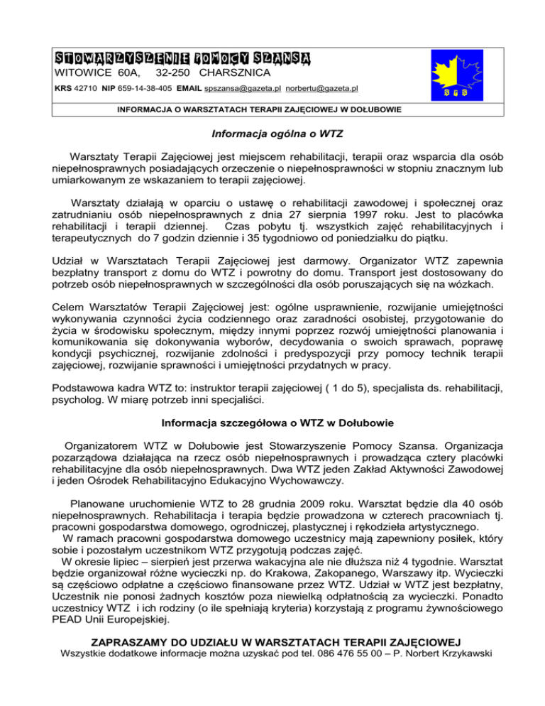 STOWARZYSZENIE POMOCY SZANSA WITOWICE 60A, 32-250 CHARSZNICA KRS 42710 NIP 659-14-38-405 EMAIL [email protected] [email protected] INFORMACJA O WARSZTATACH TERAPII ZAJĘCIOWEJ W DOŁUBOWIE Informacja ogólna o WTZ Warsztaty Terapii Zajęciowej jest miejscem rehabilitacji, terapii oraz wsparcia dla osób niepełnosprawnych posiadających orzeczenie o niepełnosprawności w stopniu znacznym lub umiarkowanym ze wskazaniem to terapii zajęciowej. Warsztaty działają w oparciu o ustawę o rehabilitacji zawodowej i społecznej oraz zatrudnianiu osób niepełnosprawnych z dnia 27 sierpnia 1997 roku. Jest to placówka rehabilitacji i terapii dziennej. Czas pobytu tj. wszystkich zajęć rehabilitacyjnych i terapeutycznych do 7 godzin dziennie i 35 tygodniowo od poniedziałku do piątku. Udział w Warsztatach Terapii Zajęciowej jest darmowy. Organizator WTZ zapewnia bezpłatny transport z domu do WTZ i powrotny do domu. Transport jest dostosowany do potrzeb osób niepełnosprawnych w szczególności dla osób poruszających się na wózkach. Celem Warsztatów Terapii Zajęciowej jest: ogólne usprawnienie, rozwijanie umiejętności wykonywania czynności życia codziennego oraz zaradności osobistej, przygotowanie do życia w środowisku społecznym, między innymi poprzez rozwój umiejętności planowania i komunikowania się dokonywania wyborów, decydowania o swoich sprawach, poprawę kondycji psychicznej, rozwijanie zdolności i predyspozycji przy pomocy technik terapii zajęciowej, rozwijanie sprawności i umiejętności przydatnych w pracy. Podstawowa kadra WTZ to: instruktor terapii zajęciowej ( 1 do 5), specjalista ds. rehabilitacji, psycholog. W miarę potrzeb inni specjaliści. Informacja szczegółowa o WTZ w Dołubowie Organizatorem WTZ w Dołubowie jest Stowarzyszenie Pomocy Szansa. Organizacja pozarządowa działająca na rzecz osób niepełnosprawnych i prowadząca cztery placówki rehabilitacyjne dla osób niepełnosprawnych. Dwa WTZ jeden Zakład Aktywności Zawodowej i jeden Ośrodek Rehabilitacyjno Edukacyjno Wychowawczy. Planowane uruchomienie WTZ to 28 grudnia 2009 roku. Warsztat będzie dla 40 osób niepełnosprawnych. Rehabilitacja i terapia będzie prowadzona w czterech pracowniach tj. pracowni gospodarstwa domowego, ogrodniczej, plastycznej i rękodzieła artystycznego. W ramach pracowni gospodarstwa domowego uczestnicy mają zapewniony posiłek, który sobie i pozostałym uczestnikom WTZ przygotują podczas zajęć. W okresie lipiec – sierpień jest przerwa wakacyjna ale nie dłuższa niż 4 tygodnie. Warsztat będzie organizował różne wycieczki np. do Krakowa, Zakopanego, Warszawy itp. Wycieczki są częściowo odpłatne a częściowo finansowane przez WTZ. Udział w WTZ jest bezpłatny, Uczestnik nie ponosi żadnych kosztów poza niewielką odpłatnością za wycieczki. Ponadto uczestnicy WTZ i ich rodziny (o ile spełniają kryteria) korzystają z programu żywnościowego PEAD Unii Europejskiej. ZAPRASZAMY DO UDZIAŁU W WARSZTATACH TERAPII ZAJĘCIOWEJ Wszystkie dodatkowe informacje można uzyskać pod tel. 086 476 55 00 – P. Norbert Krzykawski