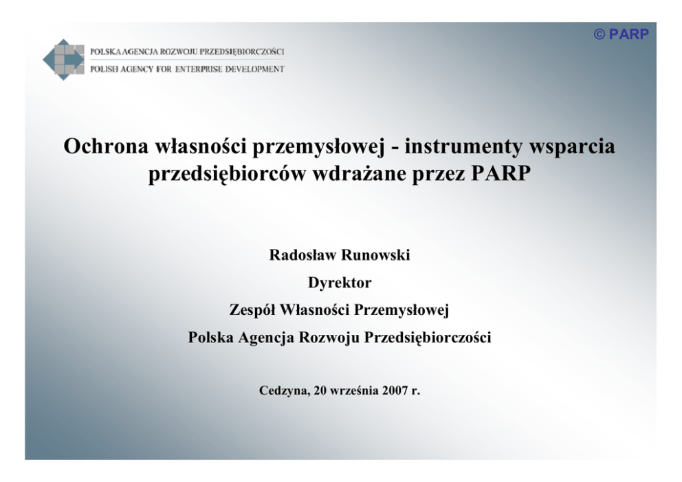 © PARP Ochrona własności przemysłowej - instrumenty wsparcia przedsiębiorców wdraŜane przez PARP Radosław Runowski Dyrektor Zespół Własności Przemysłowej Polska Agencja Rozwoju Przedsiębiorczości Cedzyna, 20 września 2007 r. © PARP RODZAJE INSTRUMENTÓW WSPARCIA 1. Projekt pilotaŜowy: Wsparcie na ochronę własności przemysłowej Nabór wniosków trwa (od 22 sierpnia 2007 r.) 2. Program Operacyjny – Innowacyjna Gospodarka 2007-2013 Działanie 5.4 Zarządzanie własnością intelektualną Program dostępny będzie wkrótce © PARP Wsparcie na ochronę własności przemysłowej Projekt pilotaŜowy CEL Podniesienie konkurencyjności mikro, małych i średnich przedsiębiorców oraz wsparcie działalności innowacyjnej © PARP PODSTAWA PRAWNA Wsparcie udzielane jest na podstawie przepisów rozporządzenia Ministra Gospodarki z dnia 2 grudnia 2006 r. w sprawie udzielania przez PARP pomocy finansowej niezwiązanej z programami operacyjnymi Wsparcie na ochronę własności przemysłowej © PARP POMOC PUBLICZNA Wsparcie udzielone przedsiębiorcom stanowi pomoc de minimis, udzielane jest zgodnie z przepisami rozporządzenia KE nr 1998/2006 w sprawie stosowania art. 87 i 88 Traktatu do pomocy de minimis Wartość pomocy de minimis w okresie bieŜącego roku i 2 poprzednich lat podatkowych nie przekracza kwoty stanowiącej równowartość: 200 tys. EUR 100 tys. EUR (działalność w sektorze transportu) Wsparcie na ochronę własności przemysłowej © PARP UPRAWNIONE PODMIOTY mikro, mali i średni przedsiębiorcy (MSP) spełniający warunki, o których mowa w rozporządzeniu KE nr 70/2001, zmienionego rozporządzeniem nr 364/2004 posiadający siedzibę na terytorium RP, a w przypadku przedsiębiorcy będącego osobą fizyczną – miejsce zamieszkania na terytorium RP Wsparcie na ochronę własności przemysłowej © PARP WYKLUCZONE DZIAŁALNOŚCI sektor rybołówstwa i akwakultury produkcja podstawowa produktów rolnych wymienionych w załączniku I do Traktatu ustanawiającego Wspólnotę Europejską przetwarzanie i wprowadzanie do obrotu produktów rolnych wymienionych w załączniku I do Traktatu (pod pewnymi warunkami) związana z wywozem do państw członkowskich Unii Europejskiej lub państw trzecich sektor węglowy Wsparcie na ochronę własności przemysłowej © PARP WYDATKI KWALIFIKOWANE refundacja faktycznie poniesionych i udokumentowanych wydatków kwalifikujących się do objęcia wsparciem 6 miesięcy przed dniem złoŜenia wniosku wyłącznie na: opłaty urzędowe za zgłoszenie w krajowych, regionalnych lub międzynarodowych organach ochrony praw własności przemysłowej: wynalazku wzoru przemysłowego wzoru uŜytkowego znaku towarowego wnoszone bezpośrednio przez wnioskodawcę lub za pośrednictwem uprawnionego zawodowego pełnomocnika UWAGA! z wyłączeniem kosztów związanych z przygotowaniem i dokonaniem zgłoszenia w UP RP w celu uzyskania ochrony na terenie RP Wsparcie na ochronę własności przemysłowej © PARP WYDATKI KWALIFIKOWANE zgłoszenie wynalazku lub wzoru uŜytkowego w trybie PCT (na podstawie Układu współpracy patentowej sporządzonego w Waszyngtonie) zgłoszenie wynalazku w procedurze międzynarodowej na podstawie Konwencji o udzielaniu patentów europejskich (patent europejski) zgłoszenie wynalazku, wzoru uŜytkowego, wzoru przemysłowego lub znaku towarowego w krajowych, regionalnych lub międzynarodowych organach ochrony praw własności przemysłowej zgłoszenie wspólnotowego znaku towarowego zgłoszenie znaku towarowego na podstawie Porozumienia madryckiego o międzynarodowej rejestracji znaków zgłoszenie wspólnotowego wzoru przemysłowego Wsparcie na ochronę własności przemysłowej © PARP KWOTA WSPARCIA nie moŜe być niŜsza niŜ 4 tys. PLN INTENSYWNOŚĆ WSPARCIA nie moŜe przekroczyć 80 % wydatków kwalifikowanych Wsparcie na ochronę własności przemysłowej © PARP PROCEDURA APLIKACYJNA 1 wniosek o udzielenie wsparcia moŜe dotyczyć tylko 1 przedmiotu zgłoszenia Nie ma ograniczeń odnośnie liczby zgłoszeń objętych 1 wnioskiem (1 wniosek moŜe obejmować dowolną liczbę zgłoszeń tego samego przedmiotu do właściwych organów ochrony własności przemysłowej) Nie ma ograniczeń co do liczby wniosków składanych przez przedsiębiorcę, o ile kaŜdy ze składanych wniosków spełnia kryteria Programu oraz obejmuje inne wydatki kwalifikowane lub inne przedmioty zgłoszenia Wsparcie na ochronę własności przemysłowej © PARP KOLEJNOŚĆ DZIAŁAŃ dokonanie zgłoszeń i wniesienie opłat urzędowych (bezpośrednio lub za pośrednictwem pełnomocnika) przygotowanie i złoŜenie wniosku o udzielenie wsparcia wraz z załącznikami (Wytyczne dla wnioskodawców + Instrukcja wypełniania wniosku) dokonanie ew. poprawek lub uzupełnień (informacja po około 20 dniach od złoŜenia wniosku) podpisanie umowy o udzielenie wsparcia otrzymanie refundacji na wskazane konto bankowe Wsparcie na ochronę własności przemysłowej © PARP PROCEDURA OCENY WNIOSKU Wniosek składany w wersji papierowej + wersja elektroniczna i załączniki Ocena przeprowadzana metodą zero – jedynkową - ok. 20 dni OCENA WNIOSKU (etap I) Ocena administracyjna Ocena zgodności z kryteriami programu (kwalifikowanie się wnioskodawcy) OCENA WNIOSKU (etap II) Ocena dokumentacji rozliczeniowej Wsparcie na ochronę własności przemysłowej © PARP BUDśET PROGRAMU 500 tys. PLN ROZPOCZĘCIE PRZYJMOWANIA WNIOSKÓW od 22 sierpnia 2007 r. ZAKOŃCZENIE PRZYJMOWANIA WNIOSKÓW do 31 października 2007 roku, godz. 16.00 Wsparcie na ochronę własności przemysłowej © PARP WNIOSKI ZŁOśONE DO PARP Do chwili obecnej do PARP wpłynęło 12 wniosków o udzielenie wsparcia na łączną kwotę wnioskowanego wsparcia: 189.986, 57 PLN Wnioski te w większości dotyczą dofinansowania kosztów zgłoszenia znaku towarowego w celu uzyskania ochrony międzynarodowej Wsparcie na ochronę własności przemysłowej © PARP Program Operacyjny Innowacyjna Gospodark