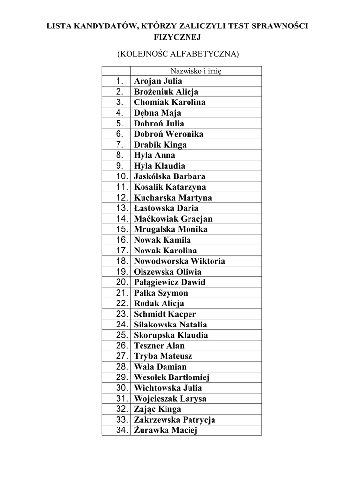 LISTA KANDYDATÓW, KTÓRZY ZALICZYLI TEST SPRAWNOŚCI FIZYCZNEJ (KOLEJNOŚĆ ALFABETYCZNA) Nazwisko i imię 1. 2. 3. 4. 5. 6. 7. 8. 9. 10. 11. 12. 13. 14. 15. 16. 17. 18. 19. 20. 21. 22. 23. 24. 25. 26. 27. 28. 29. 30. 31. 32. 33. 34. Arojan Julia Brożeniuk Alicja Chomiak Karolina Dębna Maja Dobroń Julia Dobroń Weronika Drabik Kinga Hyla Anna Hyla Klaudia Jaskólska Barbara Kosalik Katarzyna Kucharska Martyna Łastowska Daria Maćkowiak Gracjan Mrugalska Monika Nowak Kamila Nowak Karolina Nowodworska Wiktoria Olszewska Oliwia Pałągiewicz Dawid Pałka Szymon Rodak Alicja Schmidt Kacper Siłakowska Natalia Skorupska Klaudia Teszner Alan Tryba Mateusz Wala Damian Wesołek Bartłomiej Wichtowska Julia Wojcieszak Larysa Zając Kinga Zakrzewska Patrycja Żurawka Maciej