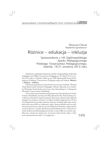 Sprawozdania z konferencji/Reports from Conferences Marzena Chrost Akademia Ignatianum Różnice – edukacja – inkluzja Sprawozdanie z VIII Ogólnopolskiego Zjazdu Pedagogicznego Polskiego Towarzystwa Pedagogicznego, Gdańsk, 19-21 września 2013 roku Inicjatorem regularnych krajowych zjazdów akademickiego środowiska pedagogów jest Polskie Towarzystwo Pedagogiczne. W dniach 19-21 września 2013 roku w Gdańsku odbył się już VIII Ogólnopolski Zjazd Pedagogiczny Polskiego Towarzystwa Pedagogicznego pod hasłem: Różnice – edukacja – inkluzja. Głównym gospodarzem Zjazdu był Uniwersytet Gdański, Wydział Nauk Społecznych, Instytut Pedagogiki. Obrady odbywały się w budynku Wydziału Nauk Społecznych przy ulicy Bażyńskiego 4 w Kampusie Oliwskim Uniwersytetu Gdańskiego. Przewodniczącym komitetu programowego Zjazdu był prof. dr hab. Tomasz Szkudlarek, natomiast dr Alicja Komorowska-Zielony była przewodniczącą komitetu organizacyjnego. Koncepcja organizacyjna Zjazdu polegała na przyjęciu otwartej i szerokiej formuły programowej. W tym celu Organizatorzy przyjęli założenie dotyczące formuły zgłaszania wystąpień, które pozwoliło na wyłanianie sekcji i grup problemowych na podstawie pozytywnej recenzji streszczeń. Dlatego też formularz zgłoszeniowy zawierał macierz szeroko określonych pól problemowych, w których należało ulokować problematykę prezentacji, co pozwoliło na wyraźne sprofilowanie tematyczne obrad oraz stworzenie dużej liczby sekcji, w których zaproponowane były 3-4 wystąpienia. 109 Sprawozdania z konferencji/Reports from Conferences 110 Program tegorocznego Zjazdu Pedagogicznego zawierał rekordową liczbę zgłoszonych tematów wystąpień (około 500) oraz rekordową ilość sesji tematycznych (106 sekcji). Były różnorodne formy prezentacji wystąpień: klasyczne referaty, sympozja tematyczne oraz sesje plakatowe. W dniu 19 września odbyła się w Polskiej Filharmonii Bałtyckiej sesja inauguracyjna. Uczestników VIII Zjazdu Pedagogicznego i zaproszonych gości powitali przedstawiciele Władz Miasta Gdańska. Uroczystego otwarcia Zjazdu dokonał J.M. Rektor UG prof. dr hab. Bernard Lammka oraz Przewodniczący PTP prof. dr hab. Zbigniew Kwieciński. Na początku obrad został uhonorowany prof. dr hab. Marian Walczak, wieloletni sekretarza PTP. W tej części Zjazdu uczestnicy mogli również wysłuchać pięknego Koncertu Cappelli Gedanensis Wykład inauguracyjny na temat: Edukacja wobec różnicy i inkluzji. Dwa typy dyskursów – w stronę pedagogiki pozytywnej wygłosił prof. dr hab. Zbigniew Kwieciński, który wyjaśnił kluczowe dla wiodącego tematu pojęcie inkluzji. Wyróżnił także dwa nurty dyskursów edukacyjnych, dotyczące różnic, ich akceptacji i znoszenia lub zmniejszania. Jeden z nich związany jest z dyskursem właściwym dla pedagogiki i socjologii krytycznej, natomiast drugi z pedagogiką specjalną, skoncentrowaną w ostatnich latach na problemach szeroko pojmowanej integracji osób niepełnosprawnych. Pan Profesor podkreślił, iż w edukacji należy zauważyć potrzebę równoważenia struktur intrapsychicznych oraz kształtowania dobrych relacji ludzi o różnych wzorach świadomości, zintegrowanych postawach życiowych dotyczących odmiennych nastawień do przeszłości i przyszłości. Zwrócił również uwagę, że potrzebna jest koncentracja badań pedagogicznych na pozytywnych wizjach i doświadczeniach edukacyjnych, dotyczących także różnic i inkluzji. W trakcie sesji plenarnej inaugurującej obrady zostały wygłoszone trzy wykłady. Prof. dr hab. Bogusław Śliwerski wygłosił referat pod tytułem: Pedagogika na zakręcie. Zaprezentował swój pogląd na temat wchodzenia, bycia i wychodzenia pedagogiki z zakrętu społeczno-politycznej transformacji. Pobudził i zachęcił uczestników Zjazdu do refleksji nad pytaniem: jak pedagogika naukowa powinna funkcjonować w państwie, by zachować własną tożsamość, godność, suwerenność, wolność prowadzenia badań i prezentowania ich wyników? Zwrócił także uwagę, że jeżeli nauczyciele, wychowawcy nie znajdą wsparcia w pedagogach, szczególnie ze środowiska naukowego, to z czysto pragmatycznych i egzystencjalnych racji staną się kluczowym czynnikiem deformowania realnego świata ludzkich istnień, w którym rzeczywistość będzie wypierana przez fikcję, pozór, fałsz, cynizm oraz hipokryzję elit. W drugim wystąpieniu, prof. dr hab. Tomasz Szkudlarek zaprezentował wykład na wiodący temat Zjazdu: Różnice – edukacja – inkluzja, w któ- rym wyjaśnił, że pojęcie różnicy zdominowało dyskusję w naukach społecznych w końcowych dekadach XX wieku, stanowiąc wyraz załamywania się modernistycznego porządku społecznego. Pojęcie to otwierało przestrzeń społeczną w sposób umożliwiający myślenie w kategoriach równoprawności rozmaitych form życia jednostkowego i społecznego. To znalazło wyraz w debatach o: wielokulturowości, niepełnosprawności, tolerancji religijnej i politycznej, seksualności, indywidualizmie, niepowtarzalności każdego życia oraz o prawach do określania własnej tożsamości: jednostkowej i grupowej. Pan Profesor wyjaśnił, iż w wielu krajach – także w Polsce – mamy do czynienia z wysokim przyzwoleniem na narastanie różnic klasowych. W tym kontekście edukacja staje się podstawowym narzędziem kształtowania przestrzeni społecznej: zarówno w kierunku utrwalania różnic o charakterze dyskryminacyjnym, jak i ich przezwyciężania w kierunku społecznej inkluzji. Edukacja służy również promowaniu różnic tam, gdzie dyskryminacja polega z kolei na ich zacieraniu. Obecnie toczy się bardzo interesująca debata o dwuznacznej roli edukacji w rozwiązywaniu problemów społecznych, o ich pedagogizacji, która z jednej strony może realnie zwiększać możliwość wpływu grup społecznych i jednostek na warunki ich życia – natomiast z drugiej – przes