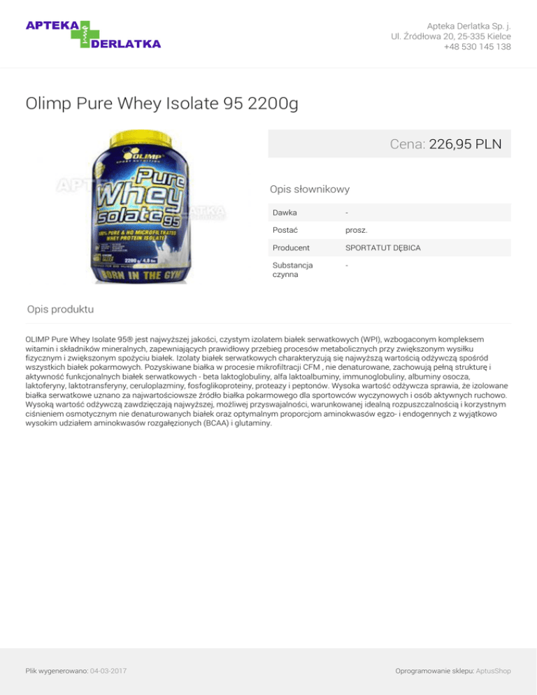 Apteka Derlatka Sp. j. Ul. Źródłowa 20, 25-335 Kielce +48 530 145 138 Olimp Pure Whey Isolate 95 2200g Cena: 226,95 PLN Opis słownikowy Dawka - Postać prosz. Producent SPORTATUT DĘBICA Substancja czynna - Opis produktu OLIMP Pure Whey Isolate 95® jest najwyższej jakości, czystym izolatem białek serwatkowych (WPI), wzbogaconym kompleksem witamin i składników mineralnych, zapewniających prawidłowy przebieg procesów metabolicznych przy zwiększonym wysiłku fizycznym i zwiększonym spożyciu białek. Izolaty białek serwatkowych charakteryzują się najwyższą wartością odżywczą spośród wszystkich białek pokarmowych. Pozyskiwane białka w procesie mikrofiltracji CFM , nie denaturowane, zachowują pełną strukturę i aktywność funkcjonalnych białek serwatkowych - beta laktoglobuliny, alfa laktoalbuminy, immunoglobuliny, albuminy osocza, laktoferyny, laktotransferyny, ceruloplazminy, fosfoglikoproteiny, proteazy i peptonów. Wysoka wartość odżywcza sprawia, że izolowane białka serwatkowe uznano za najwartościowsze źródło białka pokarmowego dla sportowców wyczynowych i osób aktywnych ruchowo. Wysoką wartość odżywczą zawdzięczają najwyższej, możliwej przyswajalności, warunkowanej idealną rozpuszczalnością i korzystnym ciśnieniem osmotycznym nie denaturowanych białek oraz optymalnym proporcjom aminokwasów egzo- i endogennych z wyjątkowo wysokim udziałem aminokwasów rozgałęzionych (BCAA) i glutaminy. Plik wygenerowano: 04-03-2017 Powered by TCPDF (www.tcpdf.org) Oprogramowanie sklepu: AptusShop