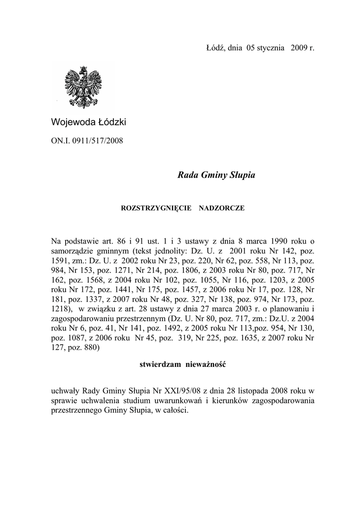 Łódź, dnia 05 stycznia 2009 r. Wojewoda Łódzki ON.I. 0911/517/2008 Rada Gminy Słupia ROZSTRZYGNIĘCIE NADZORCZE Na podstawie art. 86 i 91 ust. 1 i 3 ustawy z dnia 8 marca 1990 roku o samorządzie gminnym (tekst jednolity: Dz. U. z 2001 roku Nr 142, poz. 1591, zm.: Dz. U. z 2002 roku Nr 23, poz. 220, Nr 62, poz. 558, Nr 113, poz. 984, Nr 153, poz. 1271, Nr 214, poz. 1806, z 2003 roku Nr 80, poz. 717, Nr 162, poz. 1568, z 2004 roku Nr 102, poz. 1055, Nr 116, poz. 1203, z 2005 roku Nr 172, poz. 1441, Nr 175, poz. 1457, z 2006 roku Nr 17, poz. 128, Nr 181, poz. 1337, z 2007 roku Nr 48, poz. 327, Nr 138, poz. 974, Nr 173, poz. 1218), w związku z art. 28 ustawy z dnia 27 marca 2003 r. o planowaniu i zagospodarowaniu przestrzennym (Dz. U. Nr 80, poz. 717, zm.: Dz.U. z 2004 roku Nr 6, poz. 41, Nr 141, poz. 1492, z 2005 roku Nr 113,poz. 954, Nr 130, poz. 1087, z 2006 roku Nr 45, poz. 319, Nr 225, poz. 1635, z 2007 roku Nr 127, poz. 880) stwierdzam nieważność uchwały Rady Gminy Słupia Nr XXI/95/08 z dnia 28 listopada 2008 roku w sprawie uchwalenia studium uwarunkowań i kierunków zagospodarowania przestrzennego Gminy Słupia, w całości. 2 UZASADNIENIE W dniu 28 listopada 2008 roku Rada Gminy Słupia podjęła uchwałę Nr XXI/95/08 w sprawie uchwalenia studium uwarunkowań i kierunków zagospodarowania przestrzennego Gminy Słupia, a o prowadzonym postępowaniu organ gminy został powiadomiony zawiadomieniem o wszczęciu postępowania z dnia 17 grudnia 2008 roku (znak sprawy: ON.I0911/517/2008). Zdaniem organu nadzoru został naruszony art. 11 pkt 10 ustawy z dnia 27 marca 2003 r. o planowaniu i zagospodarowaniu przestrzennym (Dz. U. Nr 80, poz. 717 ze zm.), zgodnie z którym wójt ogłasza o wyłożeniu projektu studium do publicznego wglądu na co najmniej 14 dni przed dniem wyłożenia i wykłada ten projekt wraz z prognozą oddziaływania na środowisko do publicznego wglądu. W załączonej dokumentacji planistycznej brak jest wyżej wymienionej prognozy oddziaływania na środowisko. Zdaniem organu nadzoru został naruszony art. 46 ustawy z dnia 3 października 2008 roku o udostępnianiu informacji o środowisku i jego ochronie, udziale społeczeństwa w ochronie środowiska oraz o ocenach oddziaływania na środowisko (Dz. U. Nr 199, poz. 1227), zgodnie z którym projekt studium uwarunkowań i kierunków zagospodarowania przestrzennego wymaga przeprowadzenia strategicznej oceny oddziaływania na środowisko. W załączonej dokumentacji planistycznej brak jest dowodów przeprowadzenia strategicznej oceny oddziaływania na środowisko dla projektu studium uwarunkowań i kierunków zagospodarowania przestrzennego Gminy Słupia. Zdaniem organu nadzoru został naruszony art. 1 ust. 2 pkt 1 ustawy z dnia 27 marca 2003 r. o planowaniu i zagospodarowaniu przestrzennym. Ustalenia przedmiotowego studium zezwalają na swobodne łączenie na jednym terenie (na przykład teren oznaczony symbolem RM, MR, MU), lub na jednej działce różnorodnych funkcji, to jest zabudowy siedliskowo-rolniczej, obsługi rolnictwa, mieszkaniowej jednorodzinnej, usługowej, produkcyjnej, składów, magazynów, obsługi motoryzacji i transportu. Łączenie na jednym terenie kolidujących ze sobą funkcji jest sprzeczne z zasadami ładu przestrzennego oraz nie sprzyja prawidłowemu gospodarowaniu przestrzenią, gdyż często ma negatywny wpływ na estetykę krajobrazu i daje podstawy do powstania konfliktów społecznych. Ponieważ studium określa założenia polityki rozwoju przestrzennego i jest podstawą do sporządzania miejscowych planów zagospodarowania przestrzennego, dlatego ustalenia przedmiotowego studium mogą w przyszłości doprowadzić do łączenia w projektowanych planach miejscowych przeciwstawnych funkcji i przeznaczeń terenu o różnych zasadach 3 zagospodarowania przestrzennego na obszarze wyznaczonym liniami rozgraniczającymi. W załączonej dokumentacji planistycznej brak jest również opinii Regionalnego Dyrektora Ochrony Środowiska w Łodzi. W związku z wejściem w życie z dniem 15 listopada 2008 roku ustawy z dnia 3 października 2008 roku o udostępnianiu informacji o środowisku i jego ochronie, udziale społeczeństwa w ochronie środowiska oraz o ocenach oddziaływania na środowisko (Dz. U. Nr 199, poz. 1227) Wójt Gminy Słupia jest zobowiązany do uzyskania opinii o projekcie studium od miejscowo właściwego regionalnego dyrektora ochrony środowiska. Z tych też względów, wydanie rozstrzygnięcia nadzorczego stało się konieczne i należało orzec, jak w sentencji. Rozstrzygnięcie nadzorcze może zostać zaskarżone do Wojewódzkiego Sądu Administracyjnego w Łodzi (90-434 Łódź, ul. Piotrkowska 135) za pośrednictwem Wojewody Łódzkiego, w terminie 30 dni od dnia doręczenia. Skargę wnosi się w dwóch egzemplarzach. Wojewoda Łódzki Jolanta Chełmińska Do wiadomości: Wójt Gminy Słupia 4