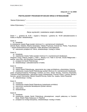 WAD-2900-01/2012 Załącznik nr 7 do SIWZ wzór PRZYKŁADOWY PROGRAM WYCIECZKI WRAZ Z WYMAGANIAMI Nazwa Wykonawcy:*...................................................................................................... ........... ................................................................................................................. Adres Wykonawcy :*................................................................................................................... .................................................................................................................... Zarys wycieczki ( zwiedzane wnętrz obiektów) Dzień 1 – godzina ok. 6.00 – wyjazd z Olsztyna – godzina ok. 18.00 zakwaterowanie w hotelu w Rydze i obiadokolacja Dzień 2: a) śniadanie b) zwiedzanie miasta Ryga (podać minimum 5 z wymienionych lokalizacji): Zamek Ryski, Katedra, Brama Szwedzka i Wieża Prochowa, Kościół św. Piotra, Trzej Bracia – zespół średniowiecznych kapliczek, Pałac Bractwa Czarnogłowych b) wieczorem przejazd do Talina, obiadokolacja i nocleg w hotelu Dzień 3: a) śniadanie b) zwiedzanie miasta Talina (podać minimum 5 z wymienionych lokalizacji): Wzgórze Toma, Ratusz miejski z 1404 r., Baszty m.in. Kiek In de Kok, Gruba Małgorzata – baszta, ulica Pikk, dom Bractwa Czarnogłowych c) przejazd do Sankt Petersburga d) obiadokolacja i zakwaterowanie w hotelu Dzień 4: a) śniadanie b) objazd Sankt Petersburga, zapoznanie się z jego architekturą, urbanistyką i historią c) zwiedzanie miasta Sanki Petersburga (podać minimum 8 z wymienionych lokalizacji): sobór Zmartwychwstania Pańskiego Cerkiew na Krwi, Sobór Smolny, Kolumny Rostralne, Twierdza Pietropawłowska, zabudowa wyspy Wasilewskiej, Pomnik Piotra I, gmach Senatu i Synodu, gmach Admiralicji, Maneż Gwardii Konnej, Sobór św. Izaaka, Sobór Kazański d) obiadokolacja i nocleg Dzień 5: a) śniadanie b) zwiedzanie miasta Sankt Petersburg (zwiedzanie ermitażu) c) wieczorem wycieczka fakultatywna (podać zakres) d) czas wolny e) obiadokolacja Dzień 6: a) śniadanie b) zwiedzanie miasta Sankt Petersburg obowiązkowo: zespół pałacowy w Carskim Siole, Wielki Pałac Katarzyny II, Peterhof c) przejazd na nocleg tranzytowy, obiadokolacja i nocleg w hotelu 1 WAD-2900-01/2012 Dzień 7: a) śniadanie b) wyjazd z hotelu i przejazd do Polski c) powrót do Olsztyna w godzinach nocnych Wykonawca wycieczki zapewnia: a) zwiedzanie z pilotem lub przewodnikiem posiadającym licencję, gdy jest to wymagane w zwiedzanych obiektach, b) powrót do hotelu po godzinie 20:00; c) dowóz autokarem każdego dnia wycieczki do marketów, w celu dokonania przez uczestników wycieczki drobnych zakupów; d) opiekę pilota e) dojazd autokarem do zwiedzanych obiektów lub gdy nie jest to możliwe, w ich pobliże, f) zorganizowanie śniadań w hotelu w którym odbywa się nocleg, obiadokolacji w restauracjach na trasie zwiedzania, g) wycieczka bez nocnych przejazdów h) zwiedzanie i udział we wszystkich atrakcjach, w tym zwiedzanie obiektów, do których wejście odbywa się za okazaniem biletu, np. muzea, obiekty zabytkowe, tereny rekreacyjne, punkty widowiskowe, przejazdy środkami komunikacji, parkingi oraz wszelkie inne, które zostały objęte lub włączone w program wycieczki, odbywa się na koszt organizatora. Uczestnik wycieczki nie ponosi dodatkowych kosztów w związku z wejściami odpłatnymi oraz kosztów przejazdu środkami komunikacji miejskiej ani napiwków. Obowiązkowe obiekty, które Wykonawca musi uwzględnić w programie wycieczki: 1. Carskie Sioło 2. Fontanny w Peterhof 3. Ermitaż 4. Sobór Św. Izaaka 5. Twierdza Pietropawłowska Własny szczegółowy program wycieczki Wykonawcy na każdy dzień jej trwania W programie należy podać nazwy oraz adresy baz noclegowych we wszystkich miastach gdzie przewidywany jest nocleg, a także nazwy i zakres zwiedzanych obiektów. Dzień 1: ........................................................................................................................................ ........................................................................................................................................ Dzień 2: ........................................................................................................................................ ........................................................................................................................................ Dzień 3: ........................................................................................................................................ ........................................................................................................................................ Dzień 4: ........................................................................................................................................ ........................................................................................................................................ Dzień 5: ........................................................................................................................................ 2 WAD-2900-01/2012 ........................................................................................................................................ Dzień 6: ........................................................................................................................................ ........................................................................................................................................ Dzień 7: ........................................................................................................................................ ........................................................................................................................................ Data:.................................. -----------------------------------